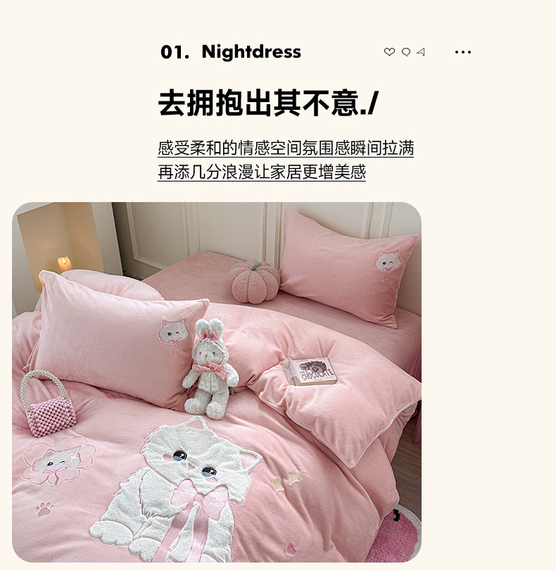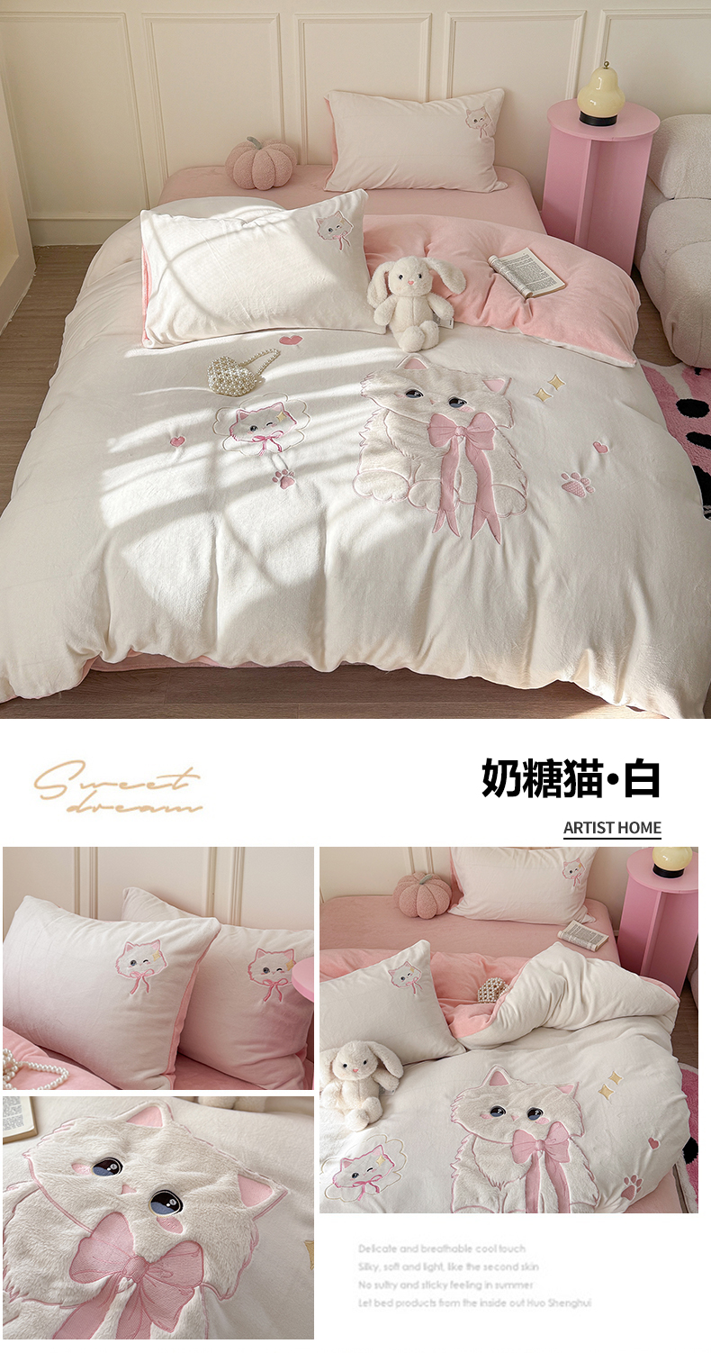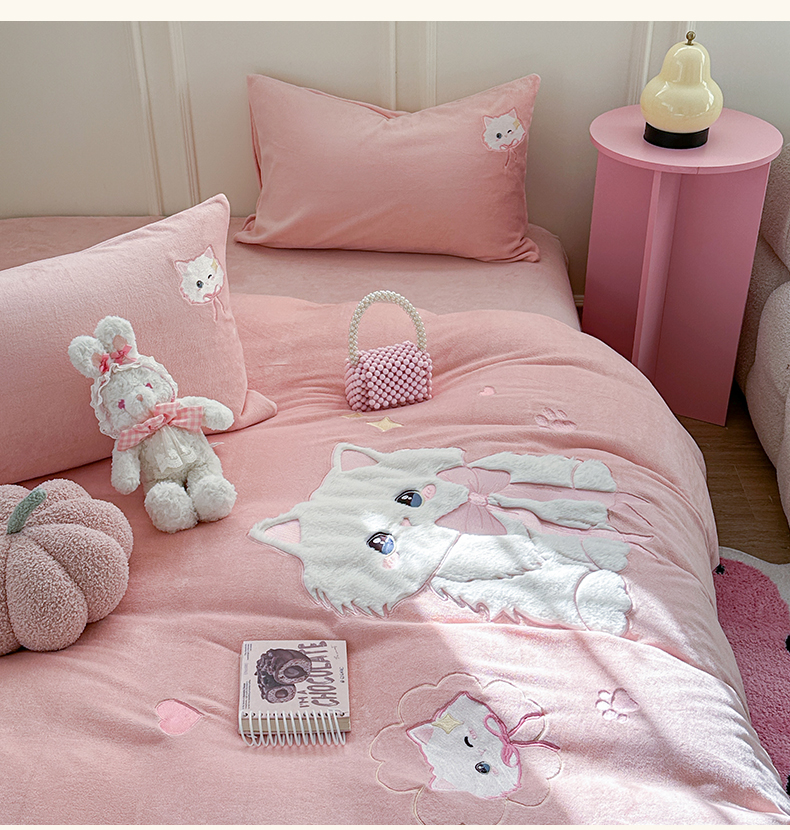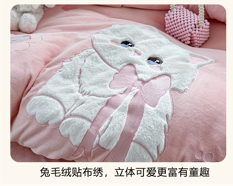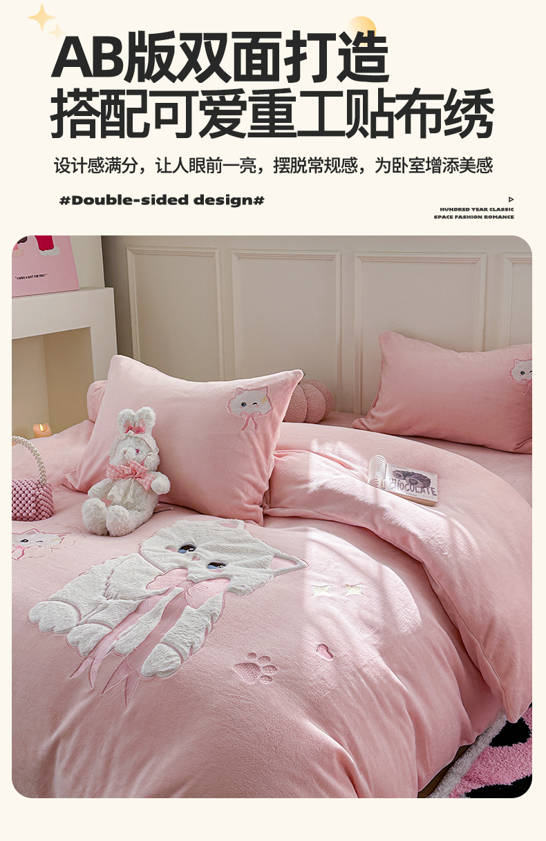 商品名称:TT.one 塔塔家居 2025新款牛奶绒立体贴布绣四件套 奶糖猫-粉