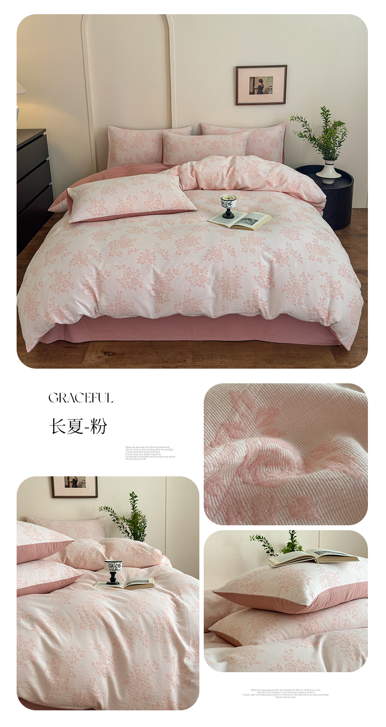 当前位置: 91家纺网 > 商品网购 > 床品套件 > 四件套 > 双层纱四件套 > 小叮当家纺仓储工厂店 (买家秀 爆款花型 不断货)2025新款A类全棉纯棉加厚磨毛双层纱色织提花四件套 长夏粉