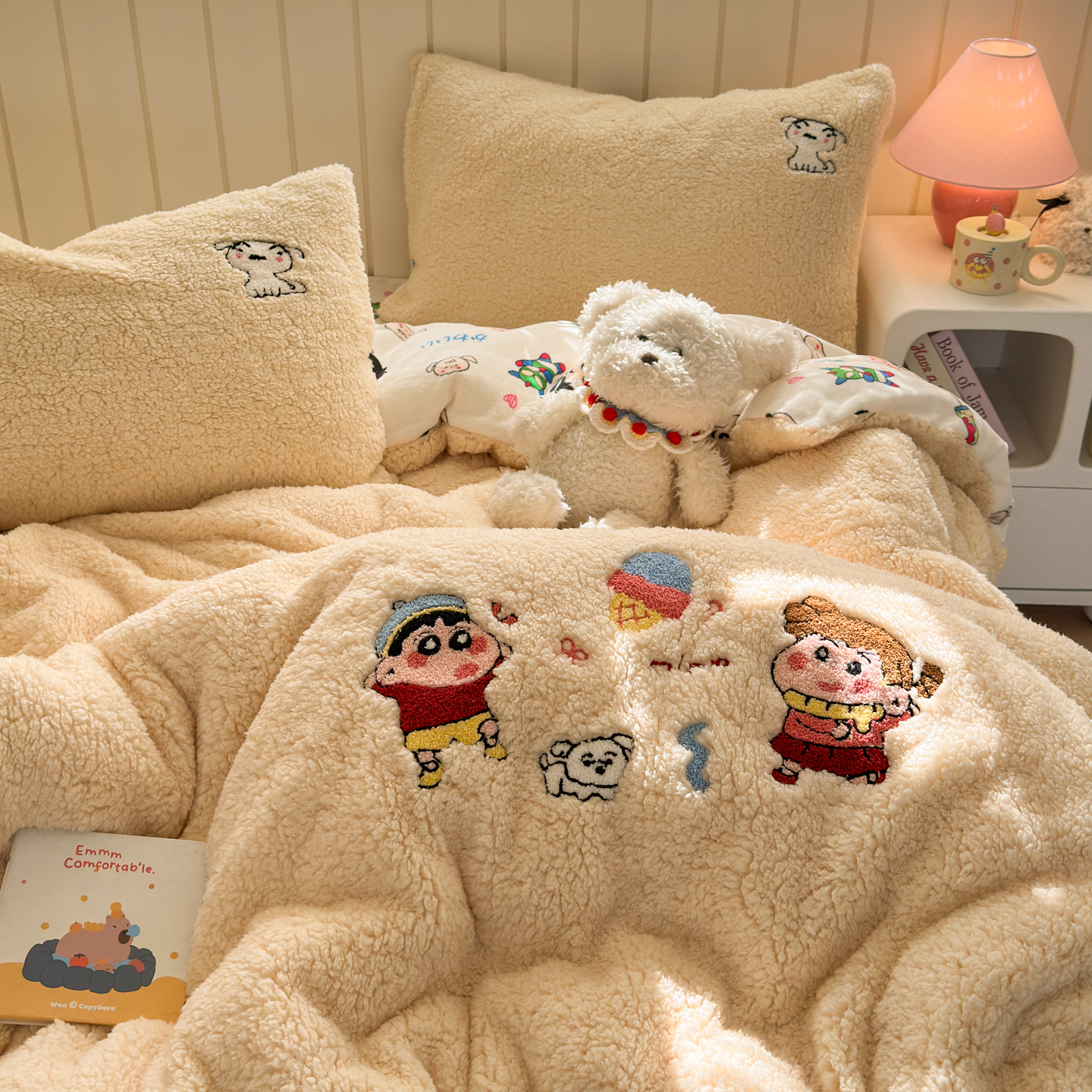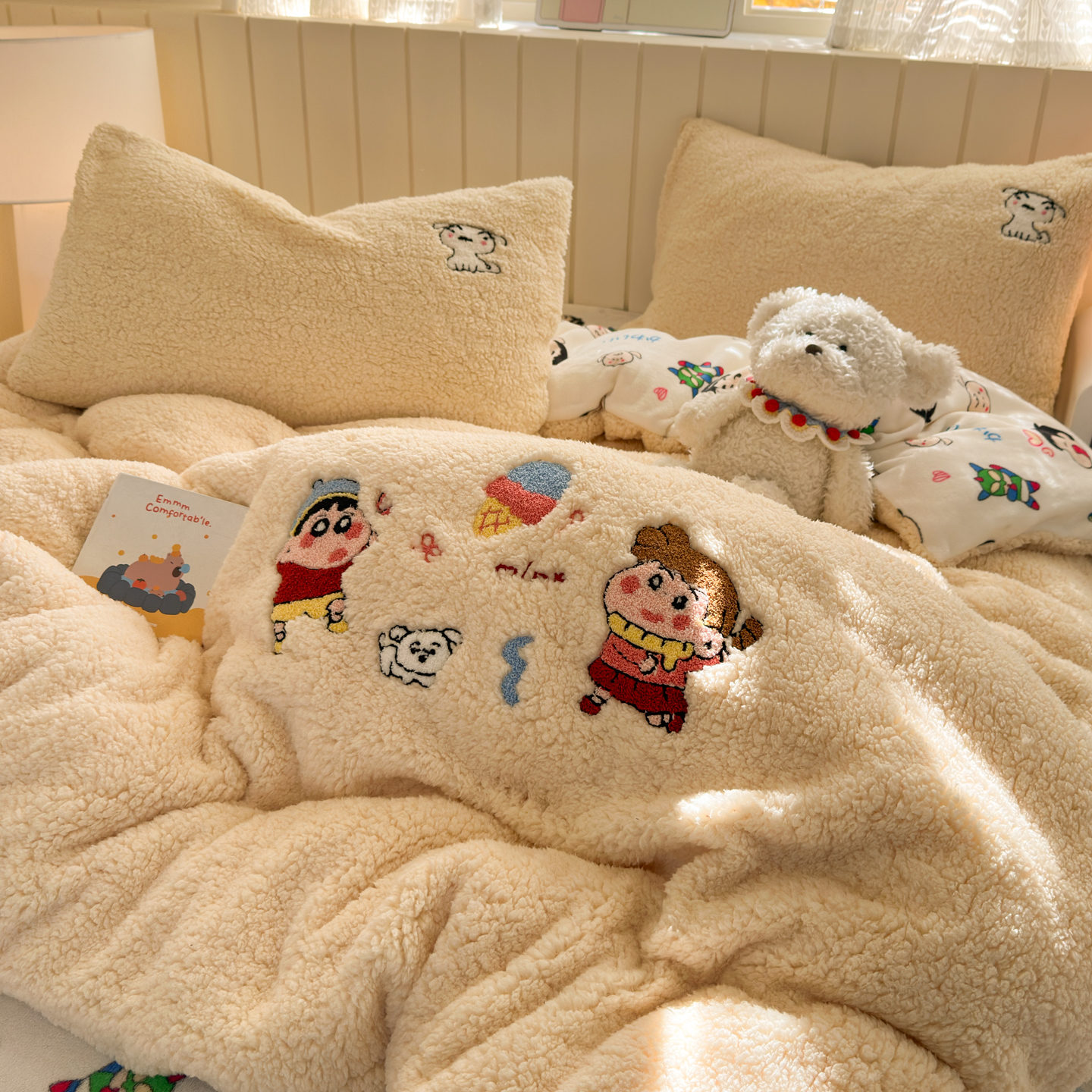 (总)一霖家纺 2025新款高克重羊羔毛毛巾绣四件套,新新与葵葵,圣诞小狗,吹泡泡的海宝黄