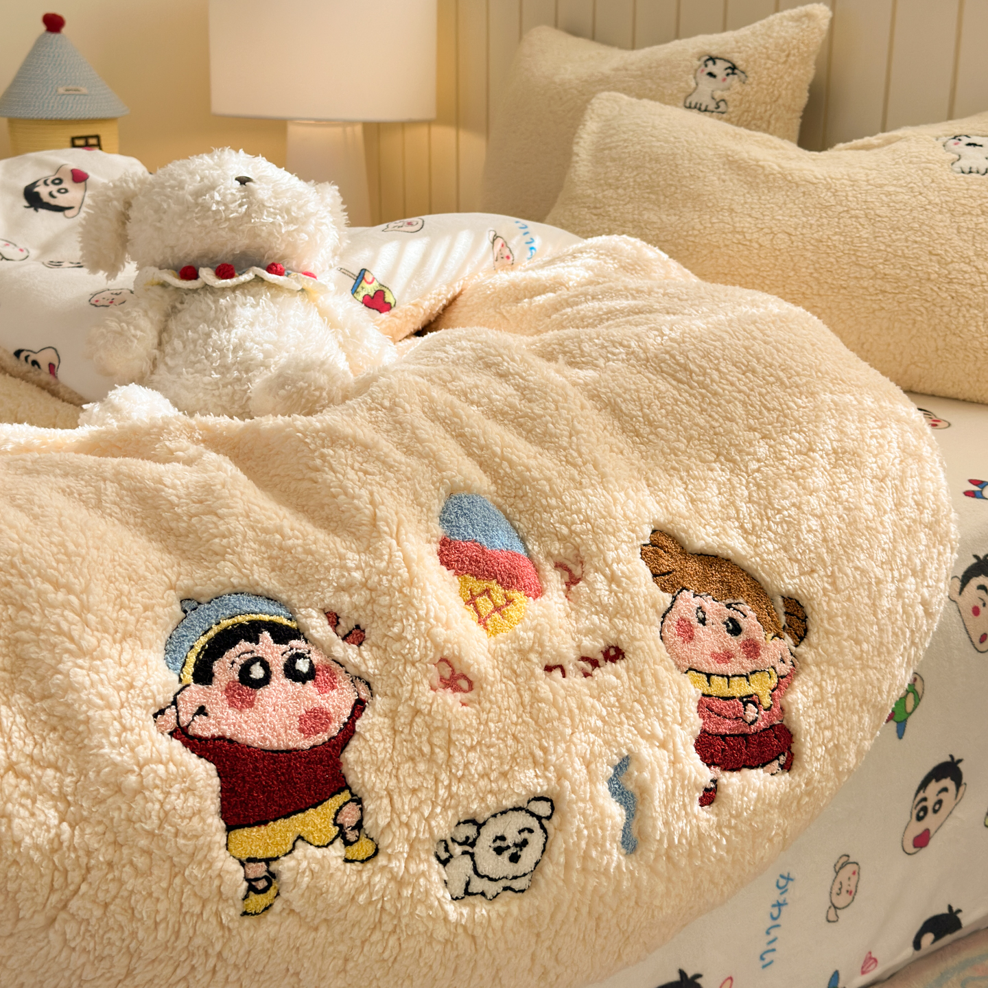 (总)一霖家纺 2025新款大版卡通牛奶绒四件套,搞怪新新紫,俏皮小新-黄,俏皮小新-蓝,甜心猫咪,星空小新