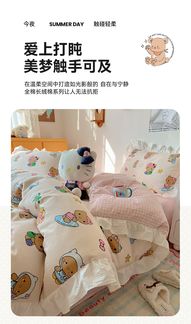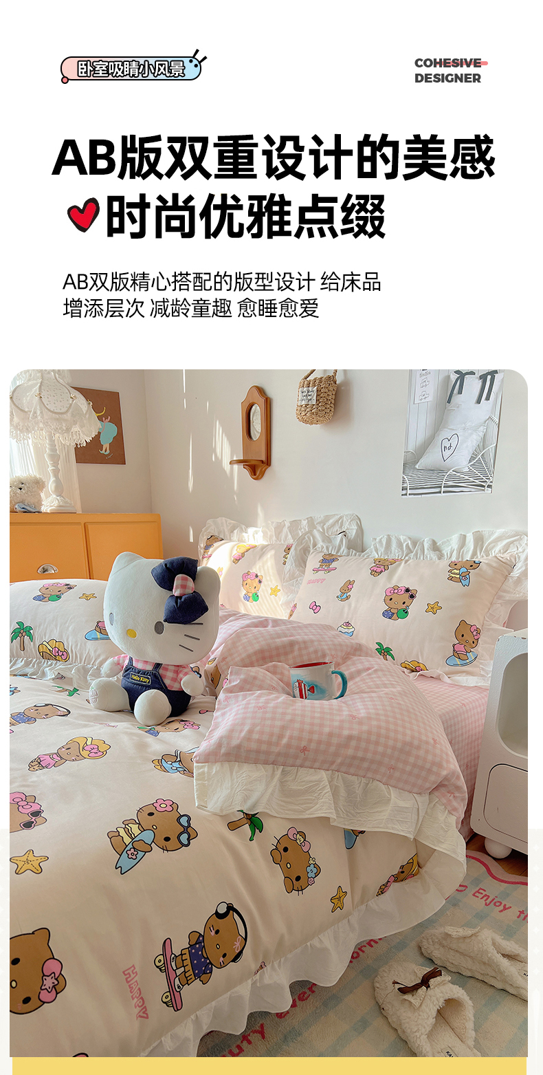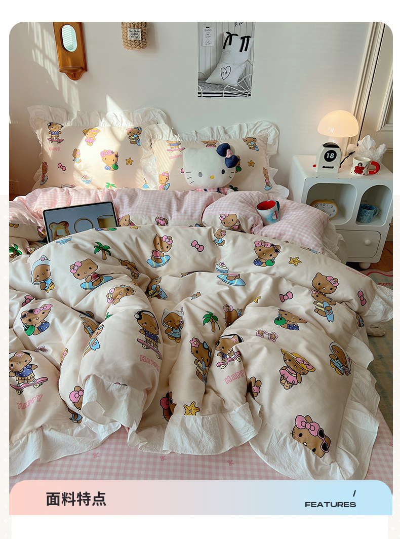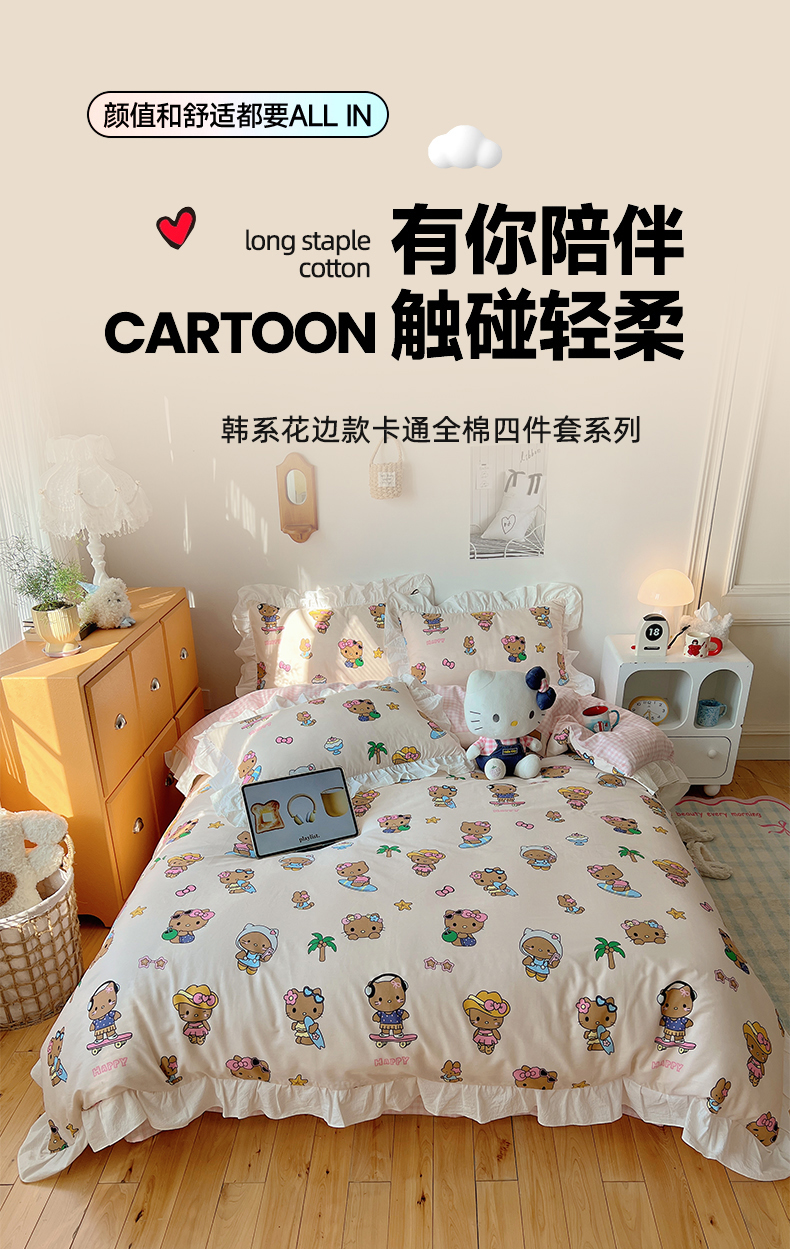商品名称:六巷胡同 2026春夏新款韩系可爱风花边款卡通全棉四件套(第一系列) 花边度假冲浪猫