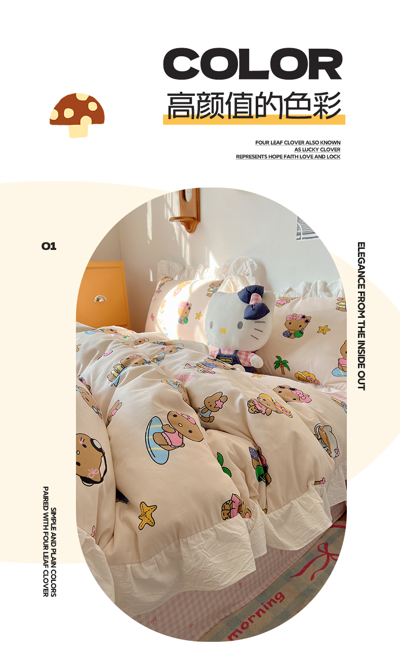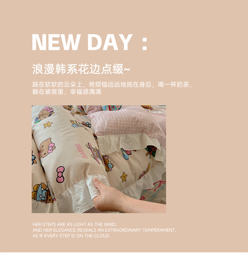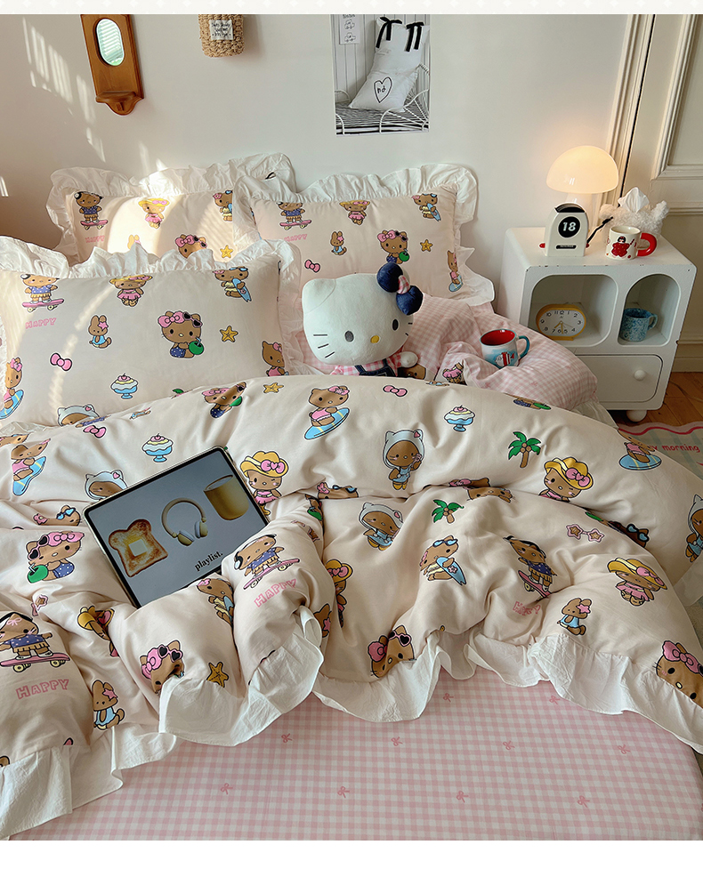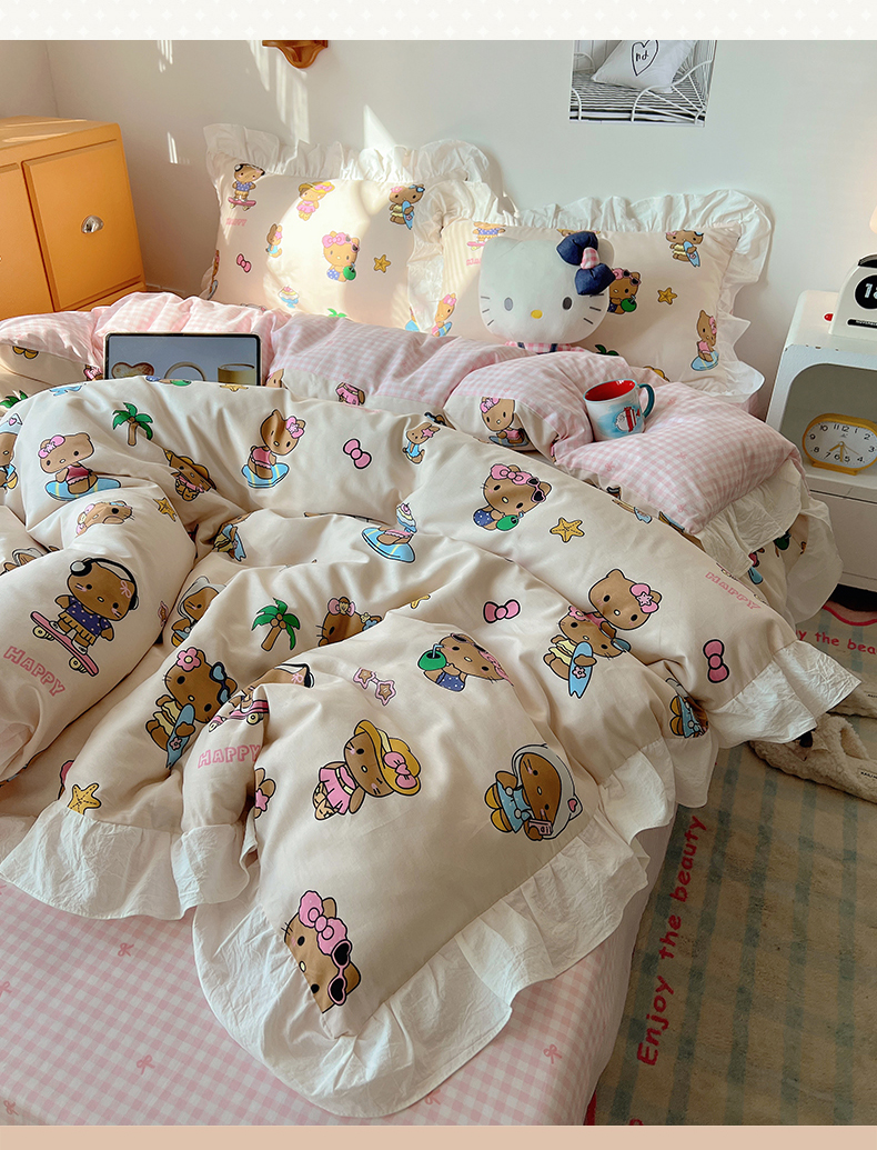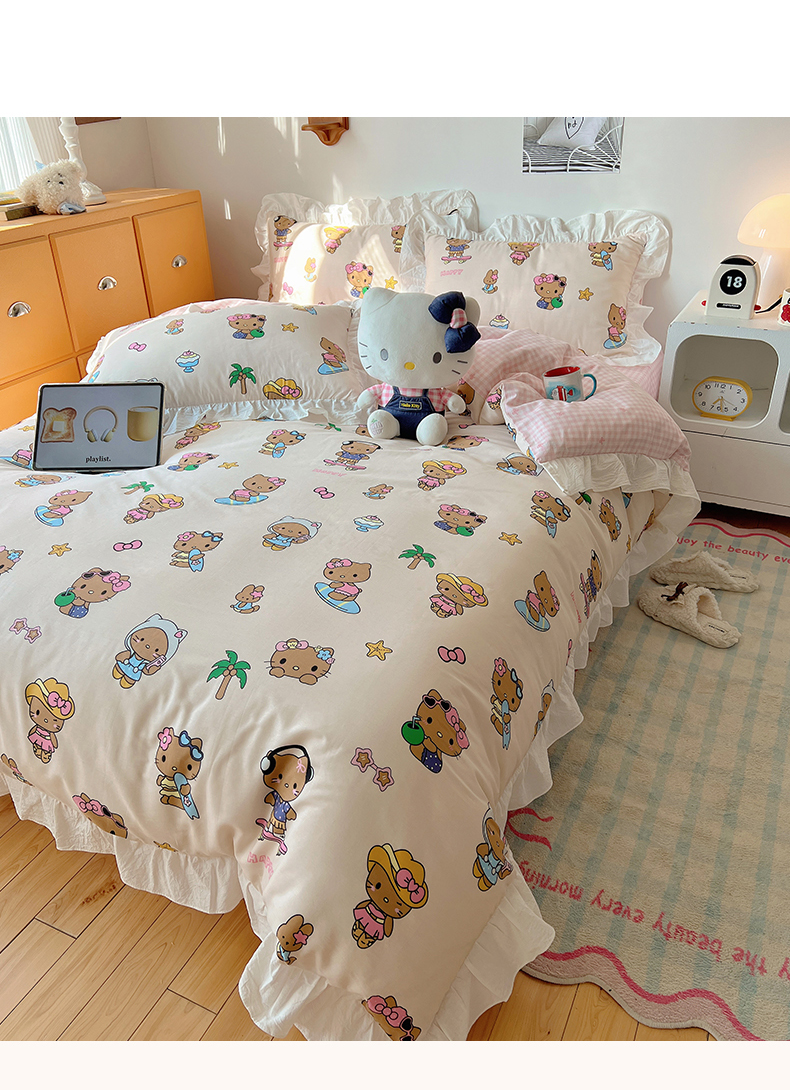 商品名称:六巷胡同 2026春夏新款韩系可爱风花边款卡通全棉四件套(第一系列) 花边度假冲浪猫