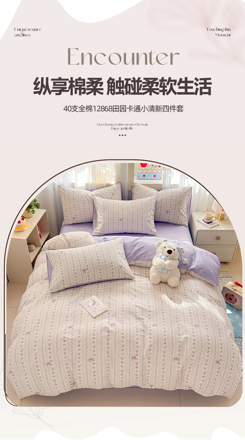 (总)呗旺鹿 2026新款全棉40支12868花草系列四件套,紫韵,丰收,花草集,花海紫嫣,花园兔,清雅,兔彼得,晓露含香