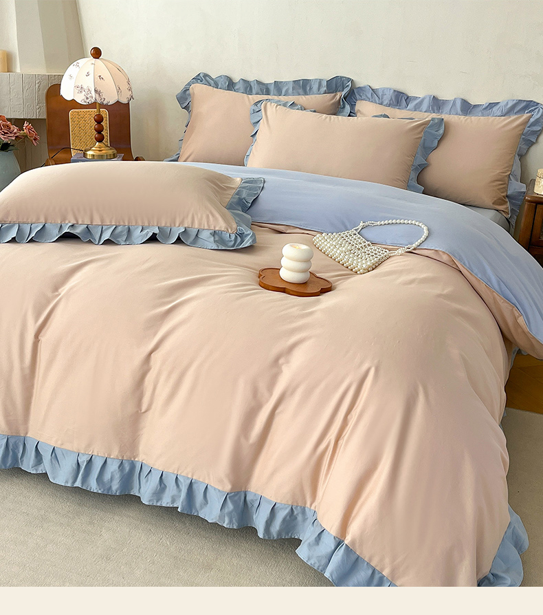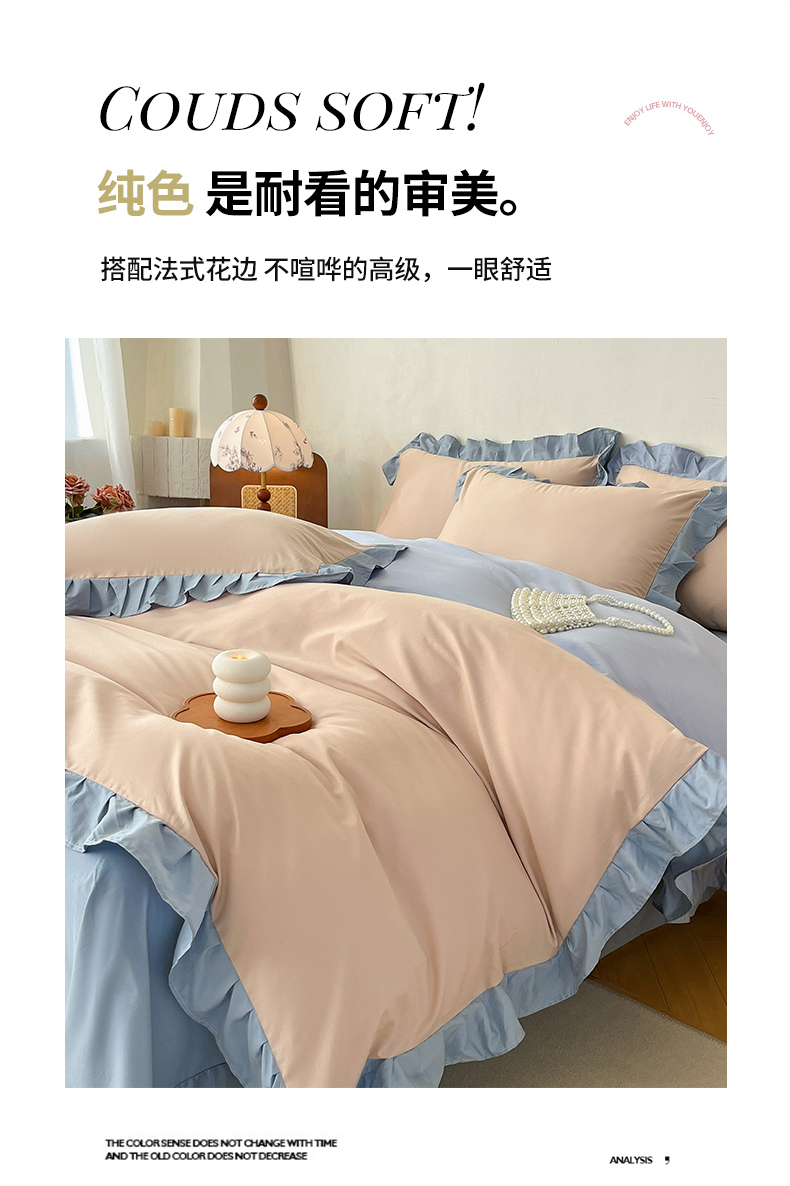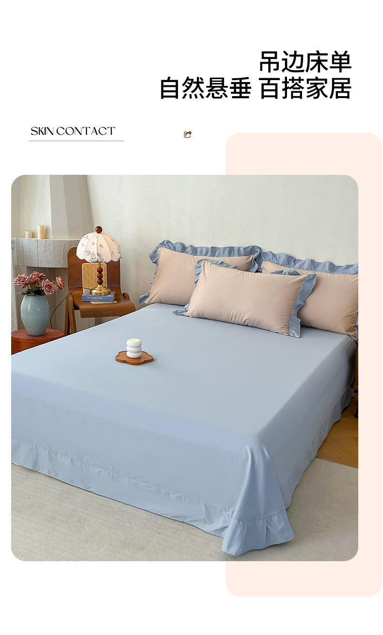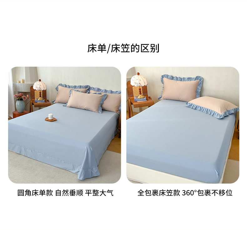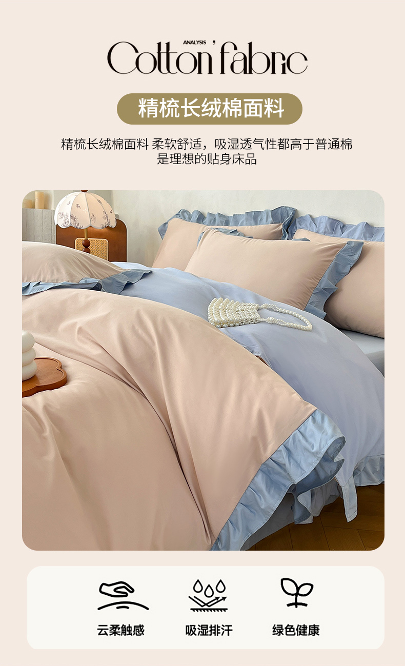 当前位置: 91家纺网 > 商品网购 > 床品套件 > 四件套 > 全棉普通四件套 > 艾迪尚家纺 2026新款法式韩版荷叶边纯色长绒棉四件套 雾蓝杏语