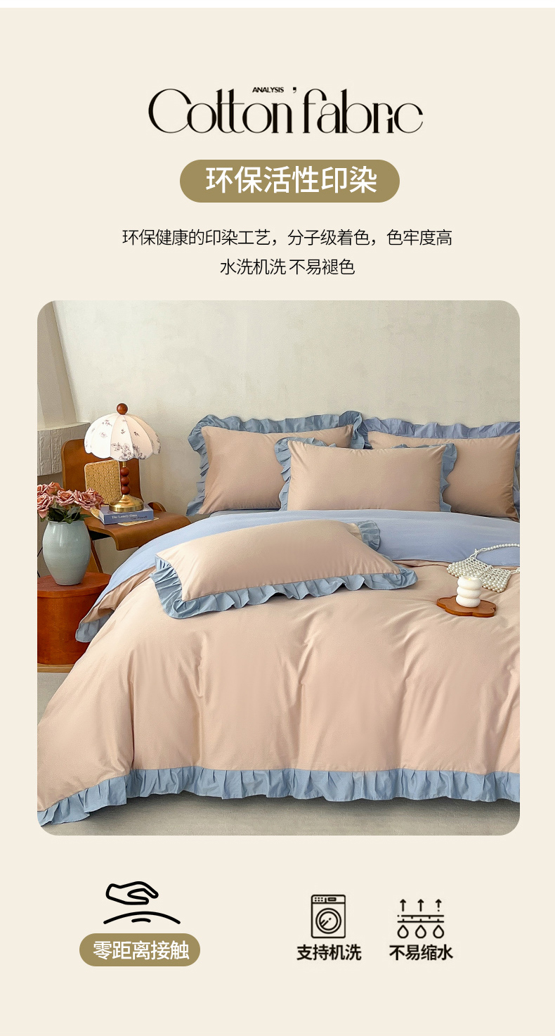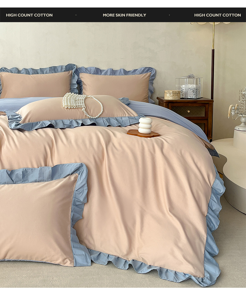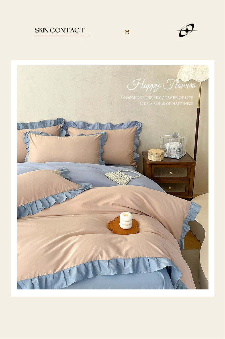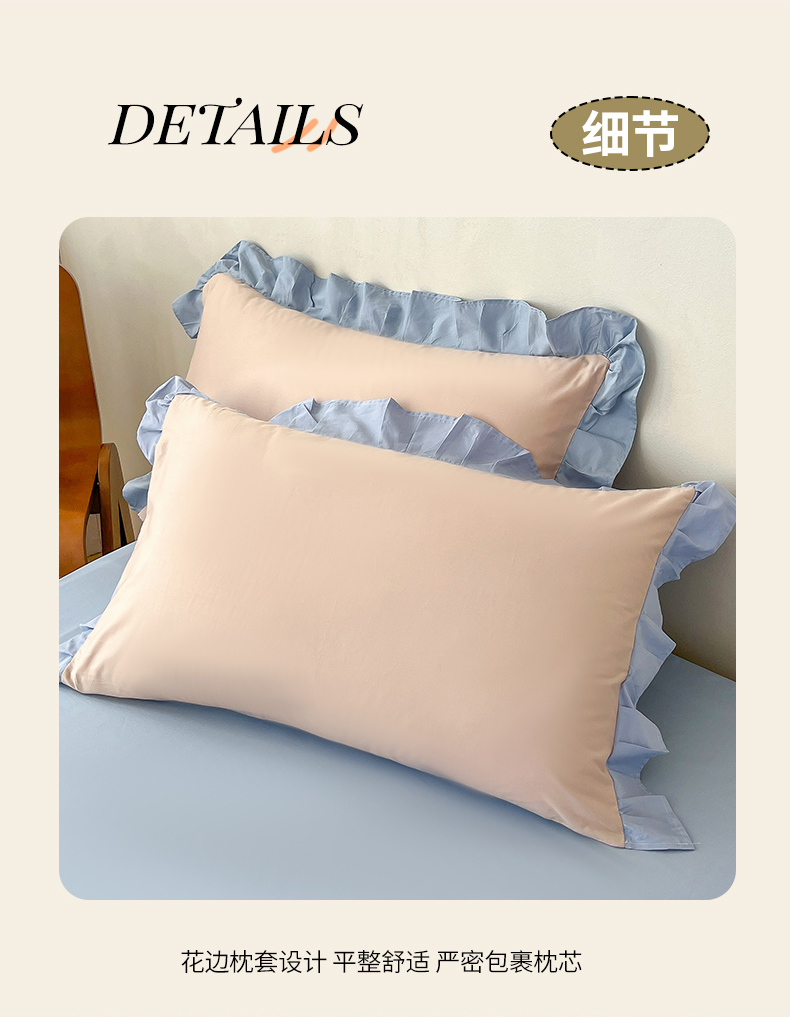 当前位置: 91家纺网 > 商品网购 > 床品套件 > 四件套 > 全棉普通四件套 > 艾迪尚家纺 2026新款法式韩版荷叶边纯色长绒棉四件套 雾蓝杏语