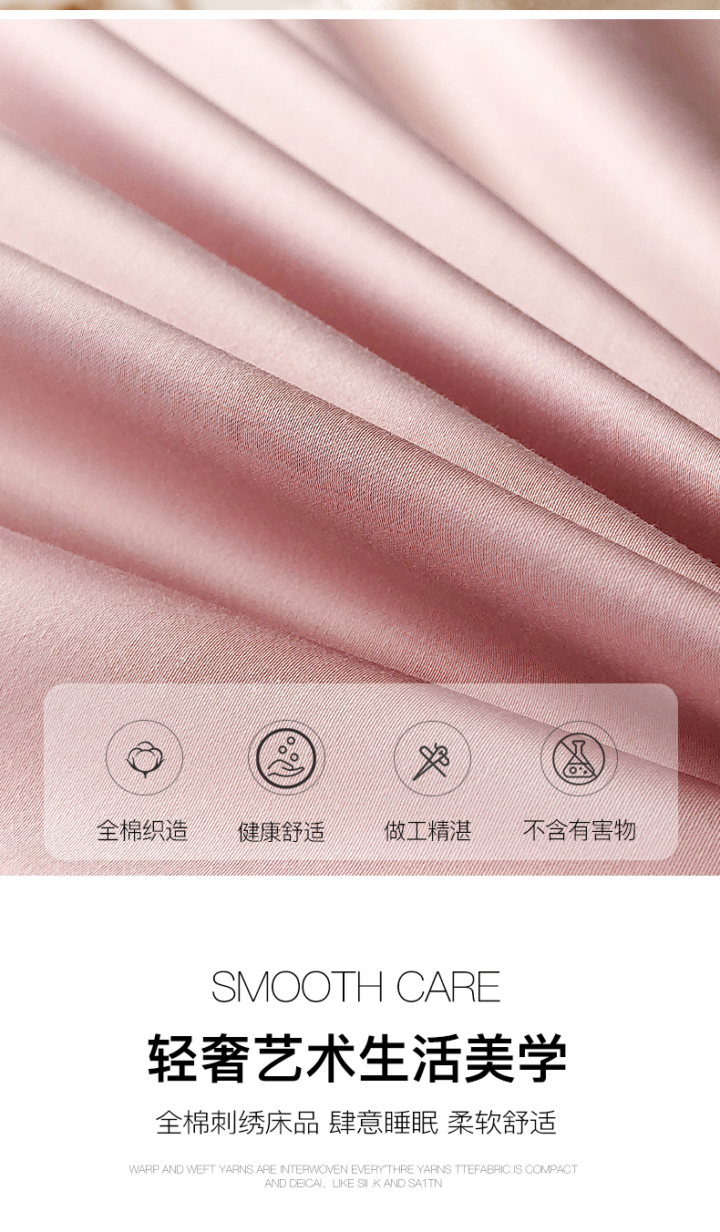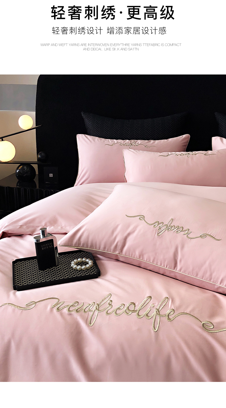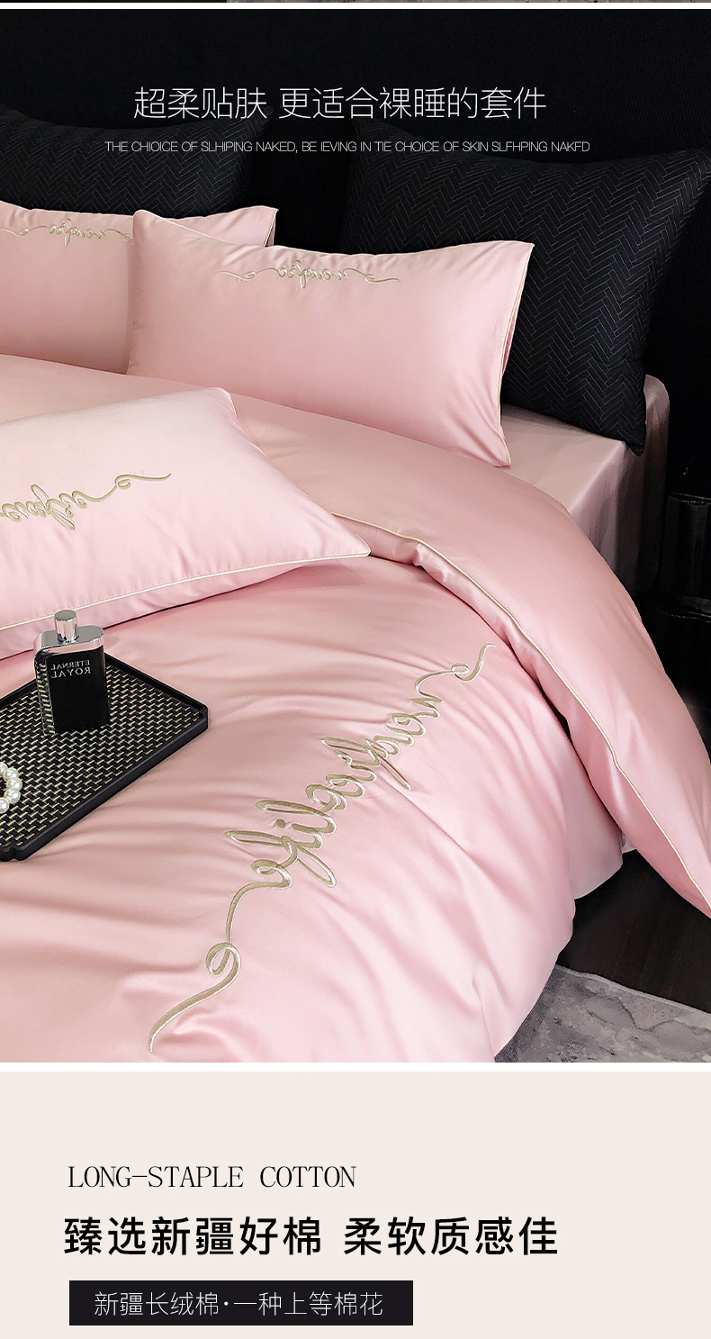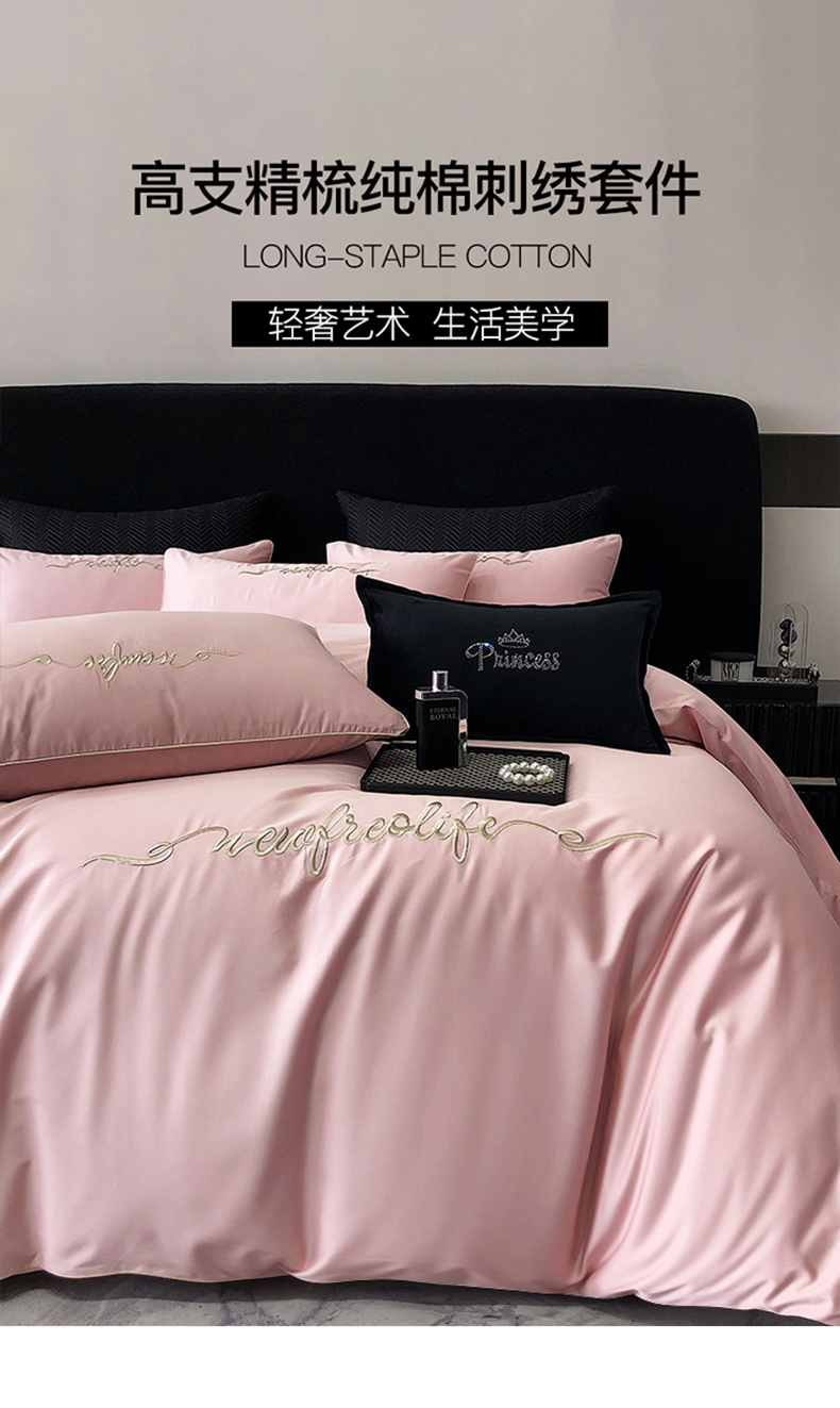 商品名称:禧澜庭 2026新款高支纯棉全棉斜纹四件套刺绣绣花款轻奢三件套--卡罗系列 戴妃粉