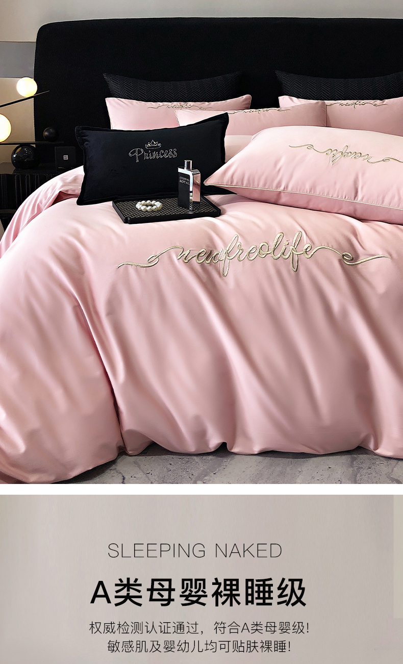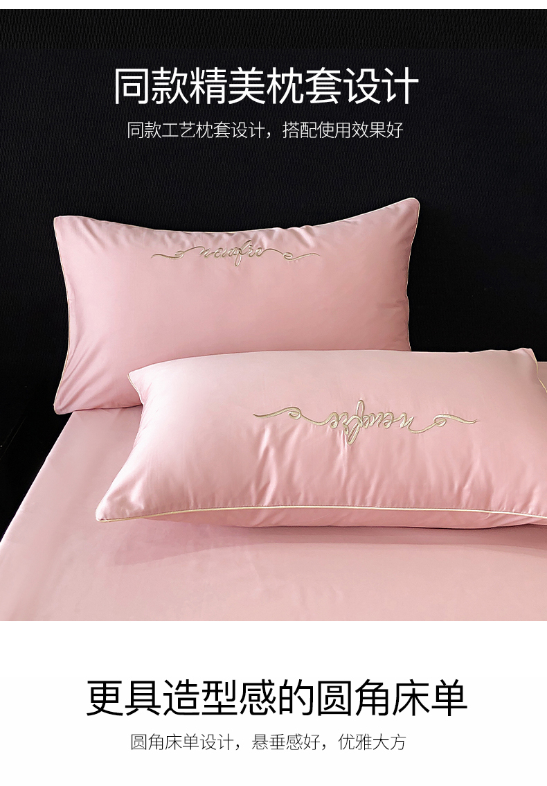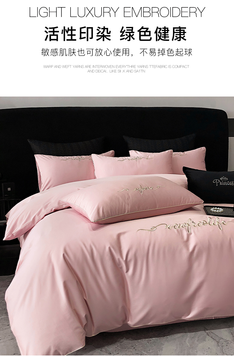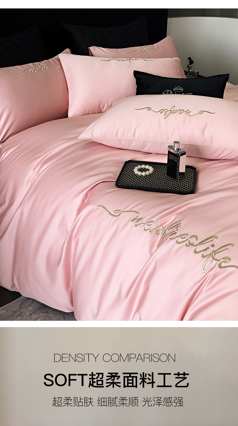 商品名称:禧澜庭 2026新款高支纯棉全棉斜纹四件套刺绣绣花款轻奢三件套--卡罗系列 戴妃粉