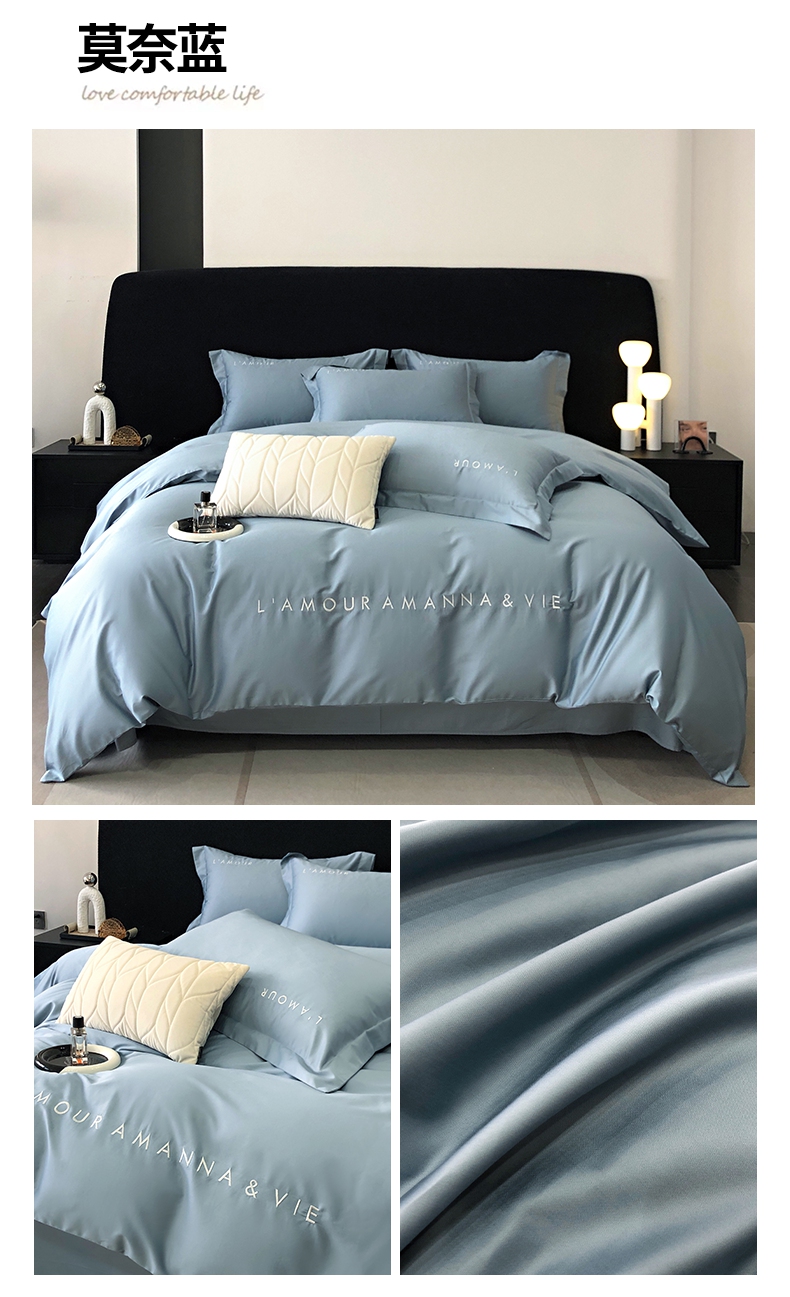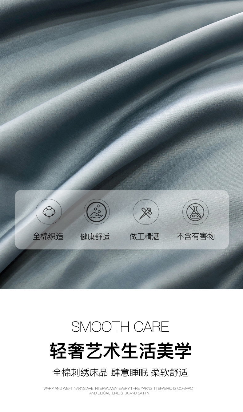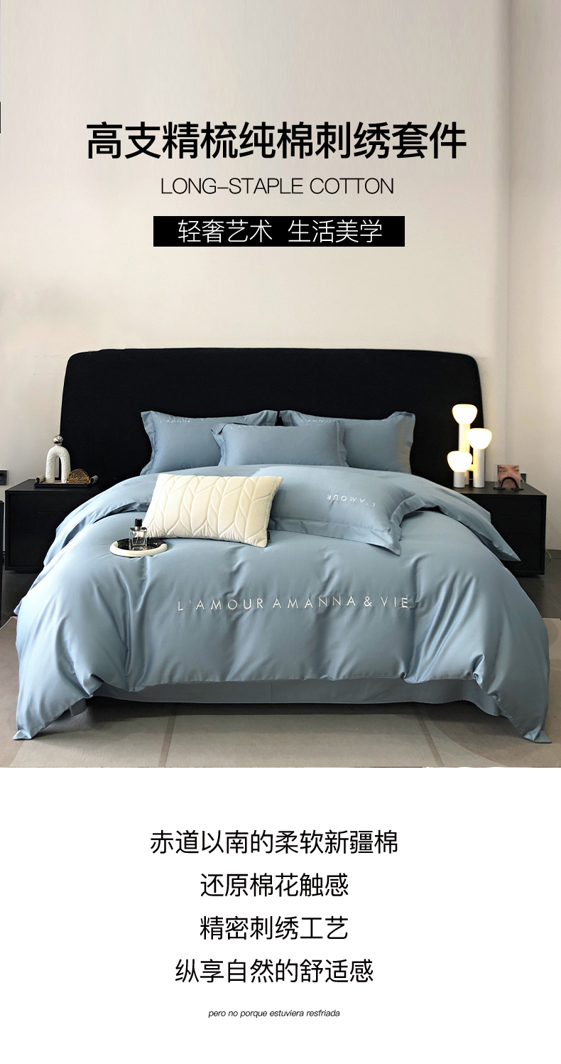 商品名称:禧澜庭 2026新款高支纯棉全棉斜纹四件套刺绣绣花款轻奢三件套--简爱系列 莫奈蓝