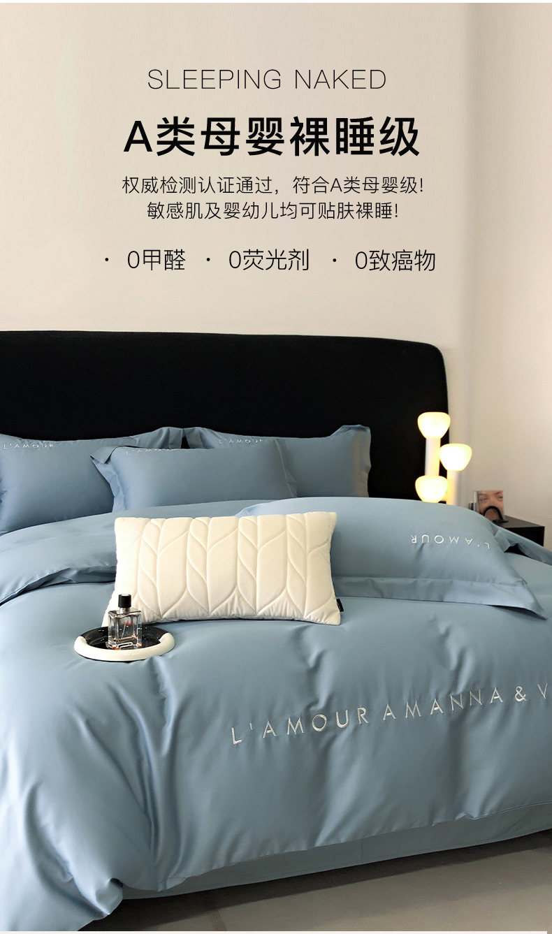 禧澜庭 2026新款高支纯棉全棉斜纹四件套刺绣绣花款轻奢三件套--简爱系列 莫奈蓝