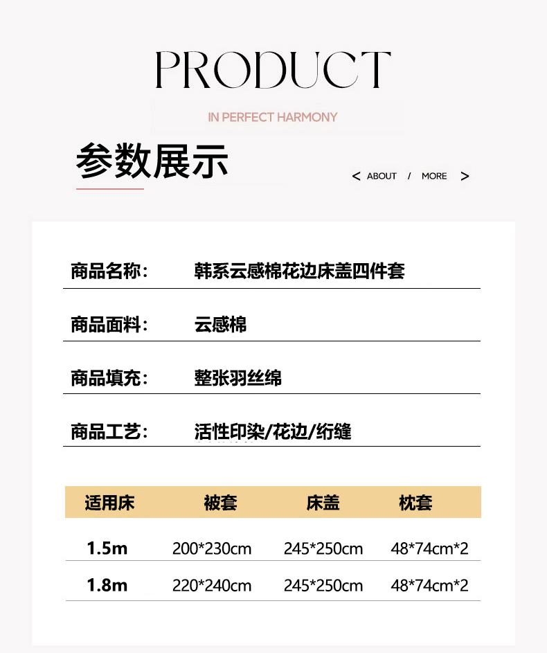 商品名称:美梦家纺 2026新款高克重全棉花边云感棉床盖四件套 希雅莉·米