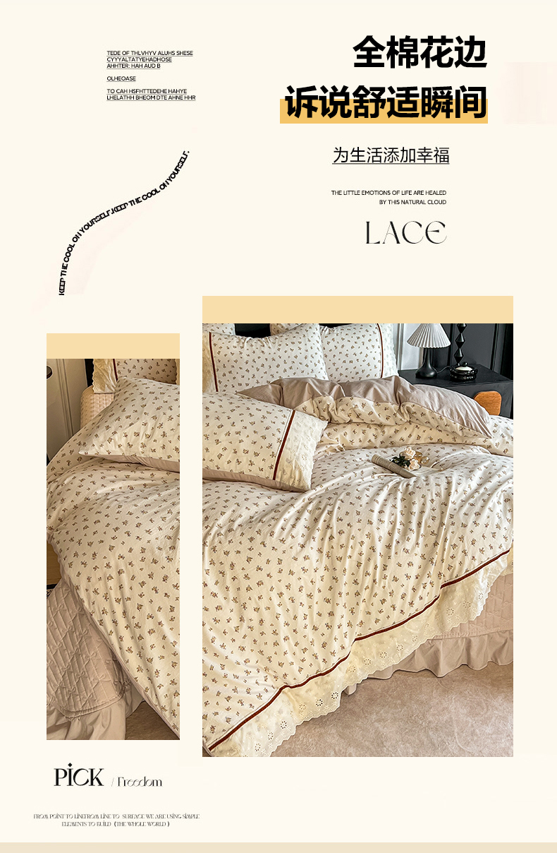 (总)美梦家纺 2026新款高克重全棉花边云感棉床盖四件套,希雅莉·米,雅格·粉,樱桃蜜·咖,尤丽叶·咖,紫藤碎花·咖,莓莓素语·粉,暖小象·兰,浅叶·米,希雅莉·灰
