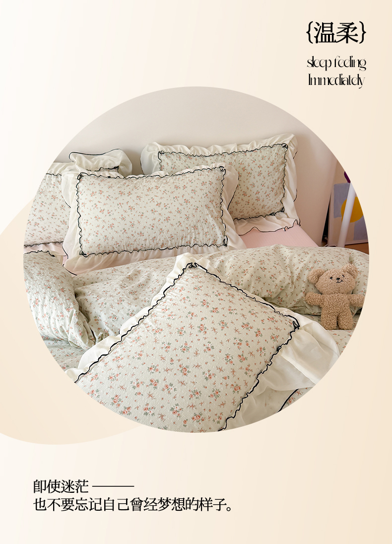 商品名称:吾欢心 2026春夏新款韩版雪纺花边泡芙双层纱四件套 复古猫咪