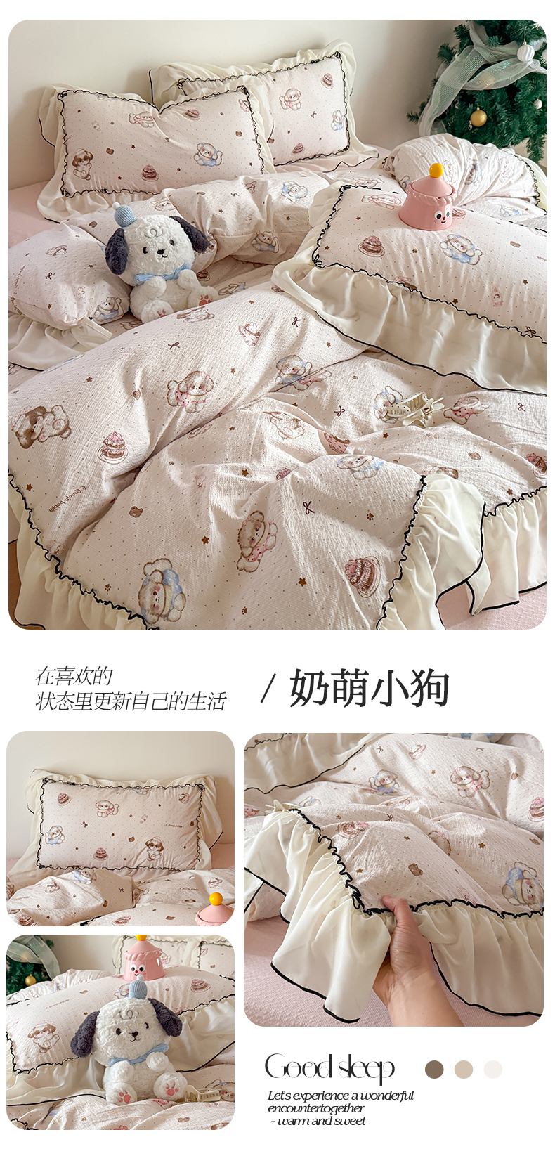 (总)吾欢心 2026春夏新款古法水洗仿棉韩版双层花边四件套,KT猫,斑马,彩色蝴蝶结,卡通小狗,可爱星星人,萌宠宝贝,秘境花园,奶萌小狗,田园趣味,汐颜,小草莓,樱桃派