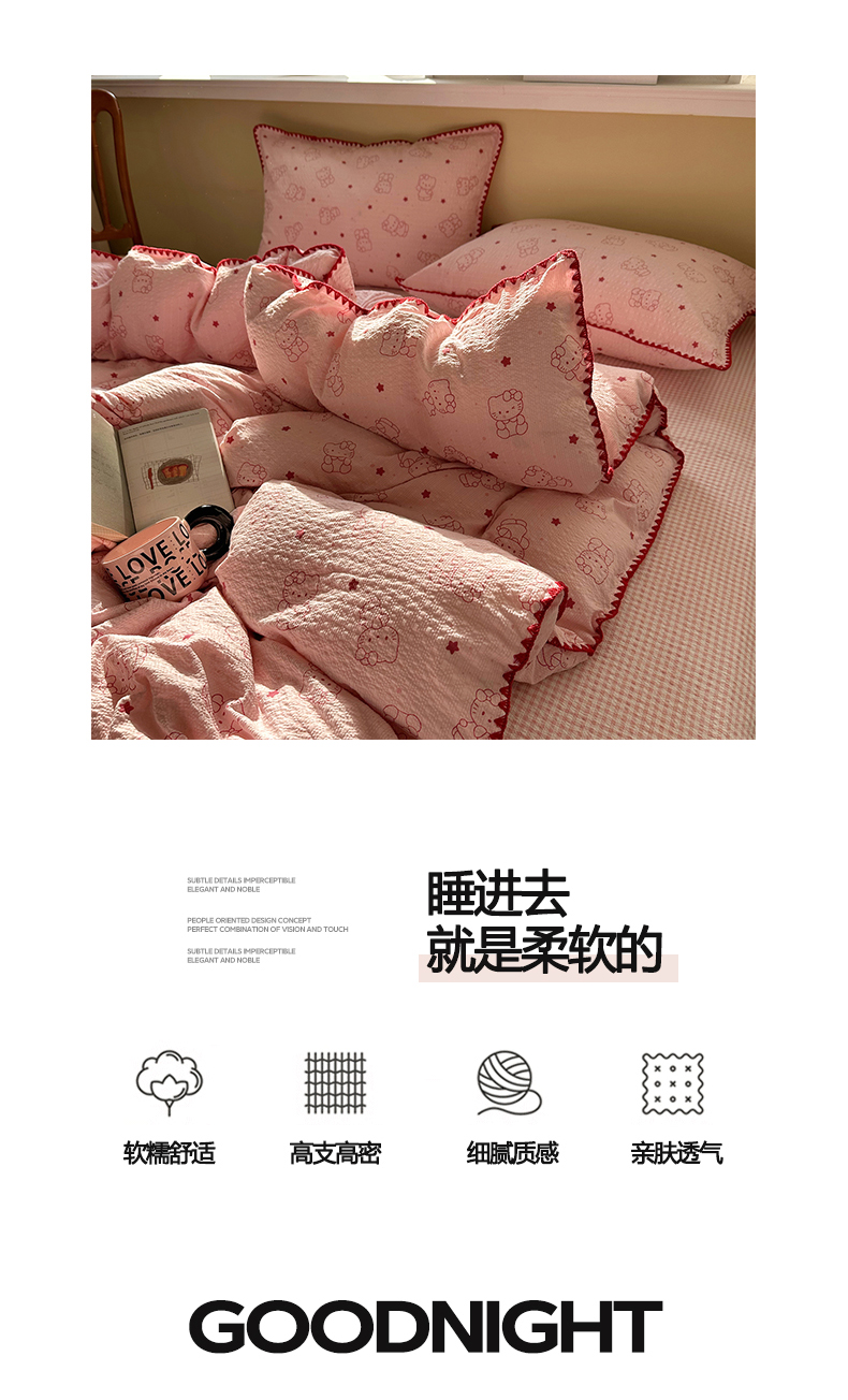 当前位置: 91家纺网 > 商品网购 > 床品套件 > 四件套 > 其它四件套 > 贝扬思家纺 2026春夏新款高品质A类泡芙纱甜栗贝壳边四件套系列~小红书推荐(110g) 甜栗-描线小猫粉