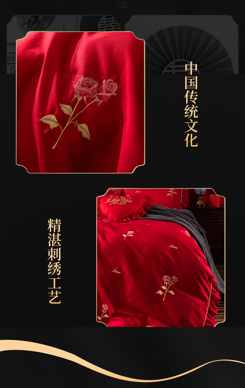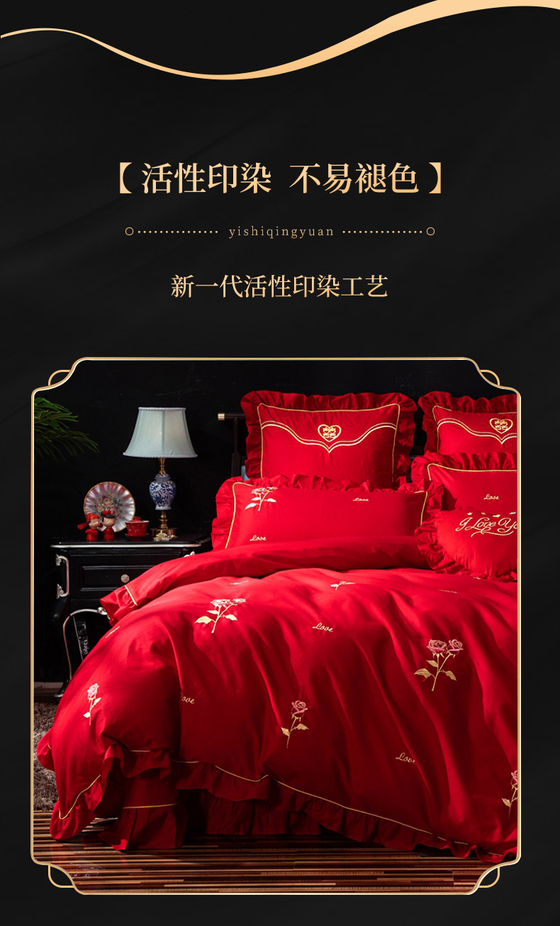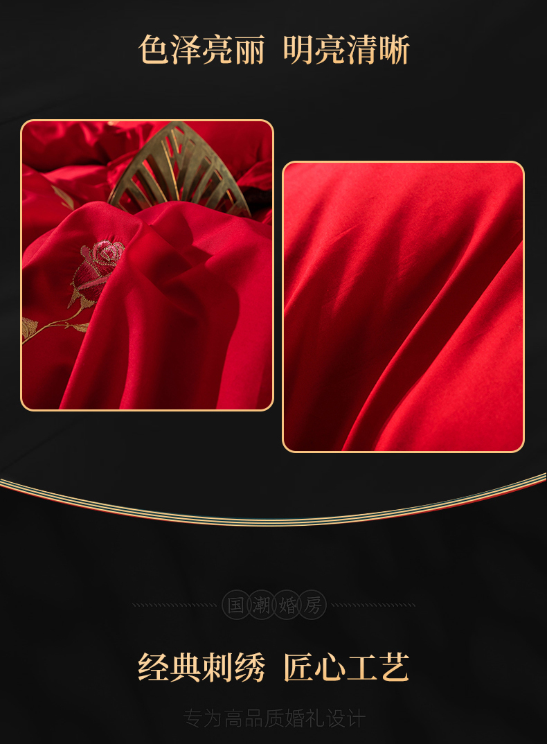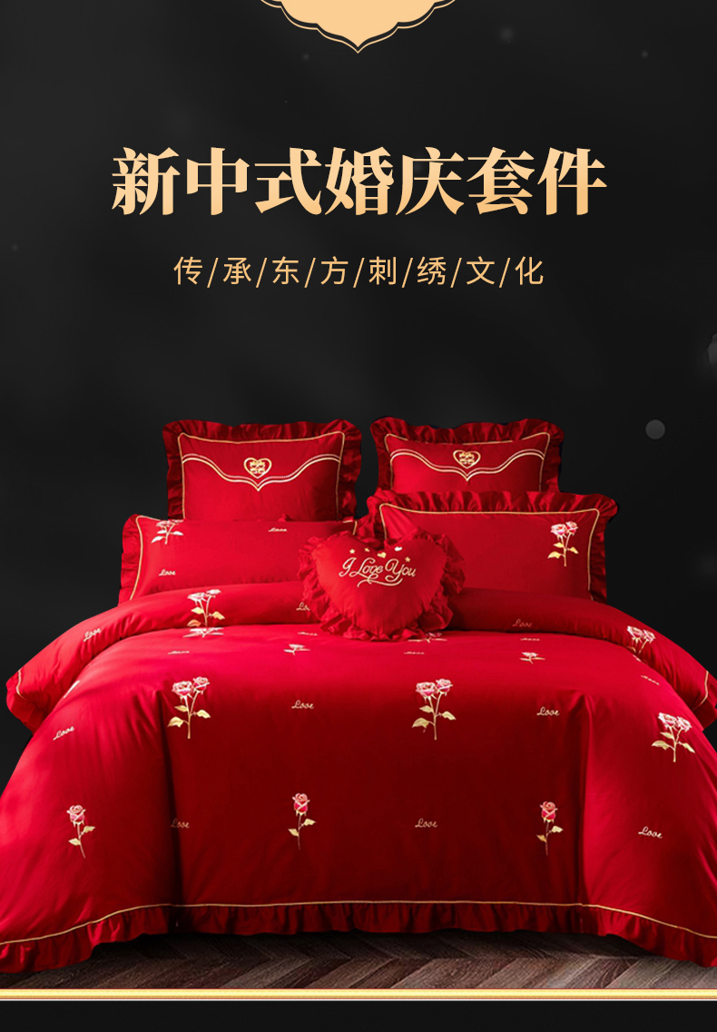 当前位置: 91家纺网 > 商品网购 > 床品套件 > 四件套 > 婚庆四件套 > 慕她家纺 慕她畅销款全棉纯棉婚庆四件套大红色刺绣结婚床上用品 玫瑰蜜语