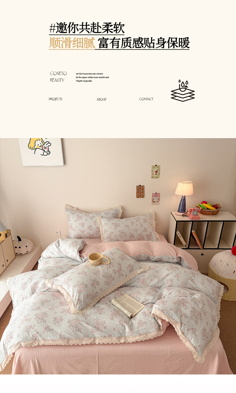 (总)吾欢心 2026新款小香风可可系列双层花边床盖款夏被四件套被子被芯,可可奶茶绿,可可奶昔粉,可可柠檬黄,可可温柔紫,可可樱桃粉