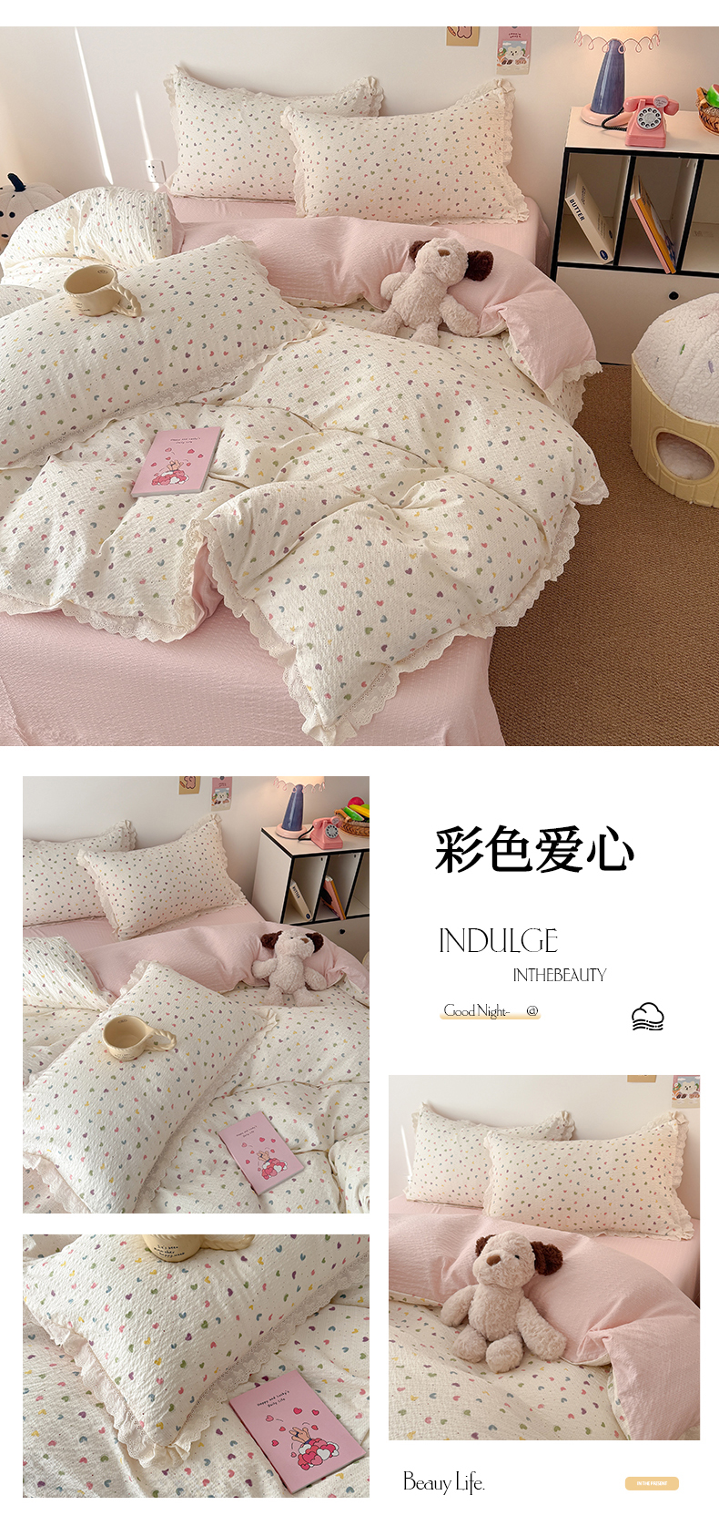 商品名称:吾欢心 2026春夏新款韩版纯棉花边泡芙双层纱四件套 呆萌狗狗