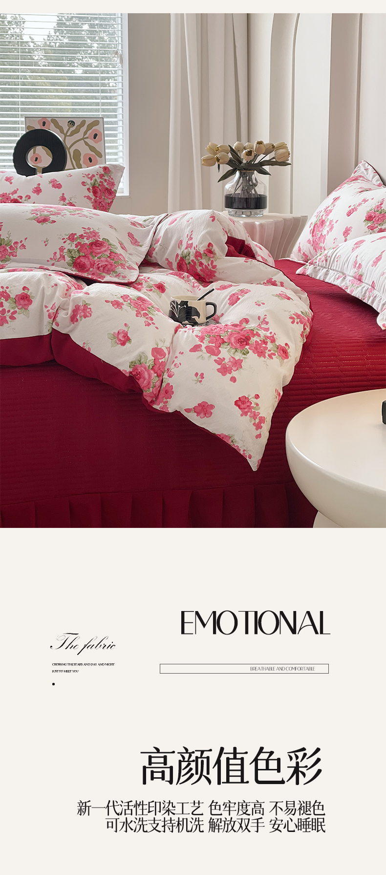 (总)锦彩家居 2026新款皱皱水洗棉床盖四件套,安妮,繁花,海德花园,卡地亚-红,玫瑰园,樱桃蜜语