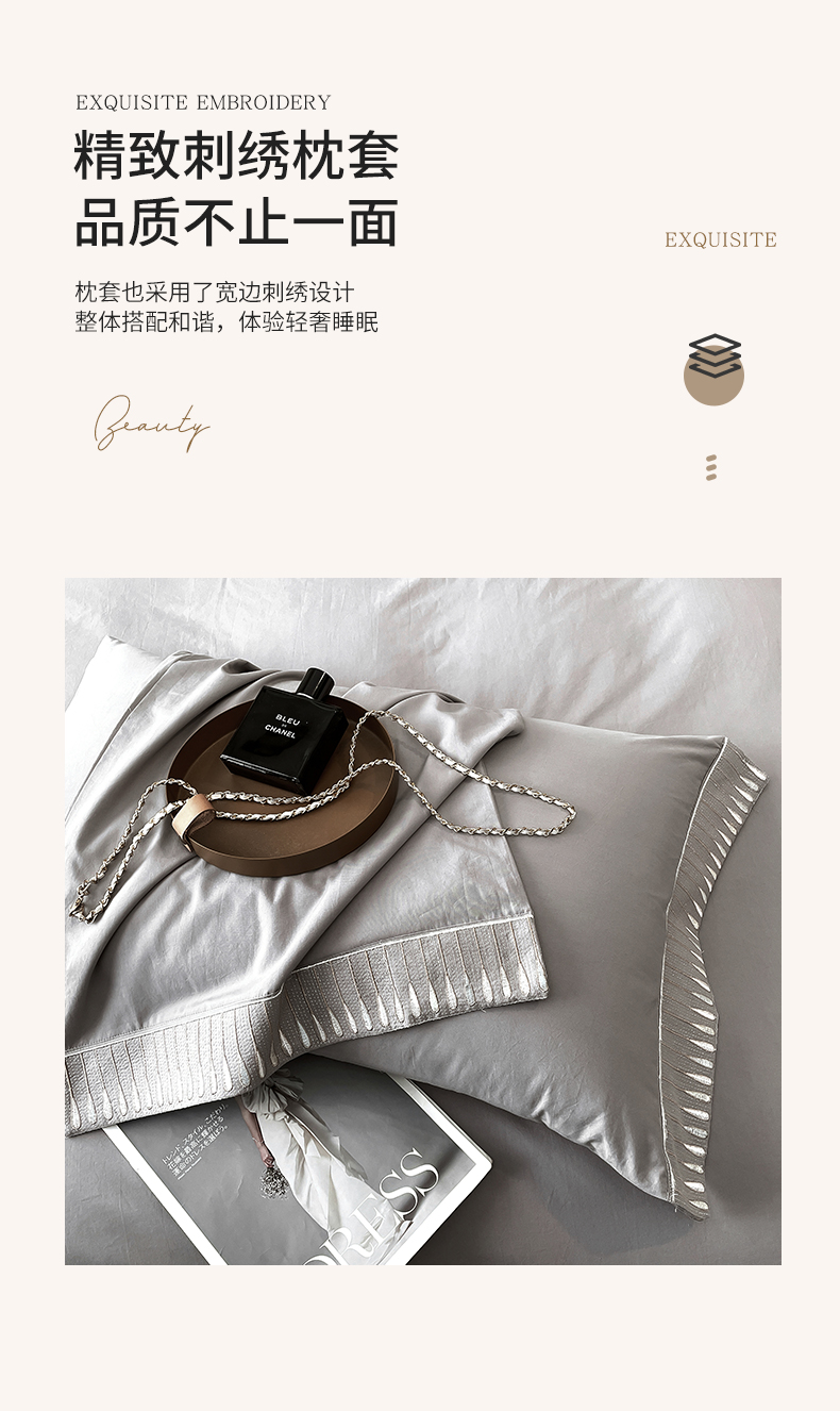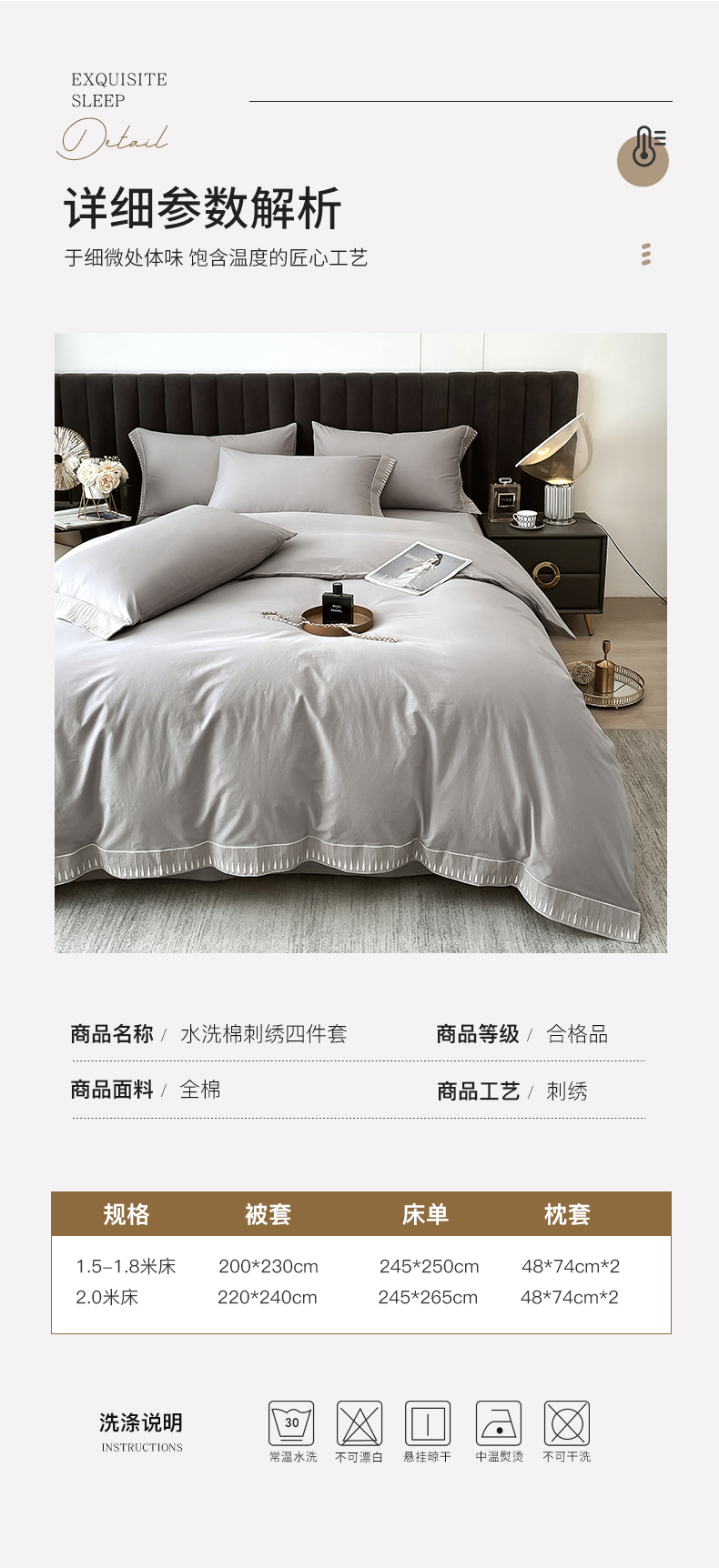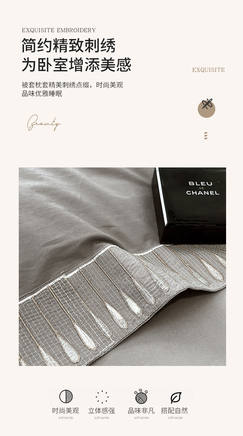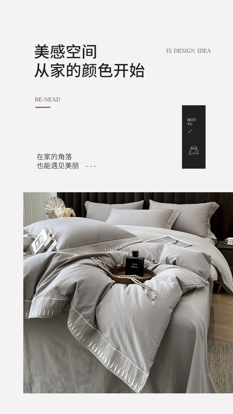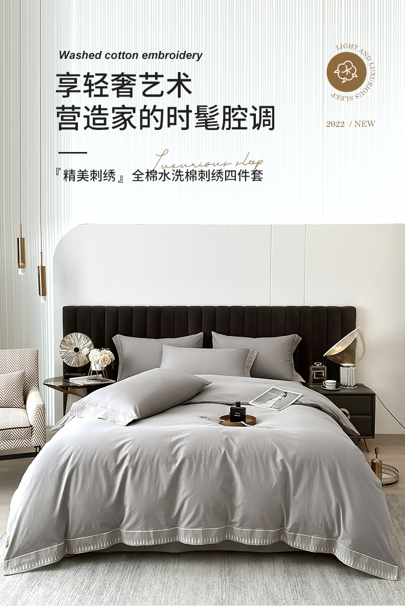 商品名称:拼社家纺 2026新款A类色织全棉水洗棉四件套纯棉四件套刺绣床上用品-黛妮卡系列 黛妮卡-浅银灰