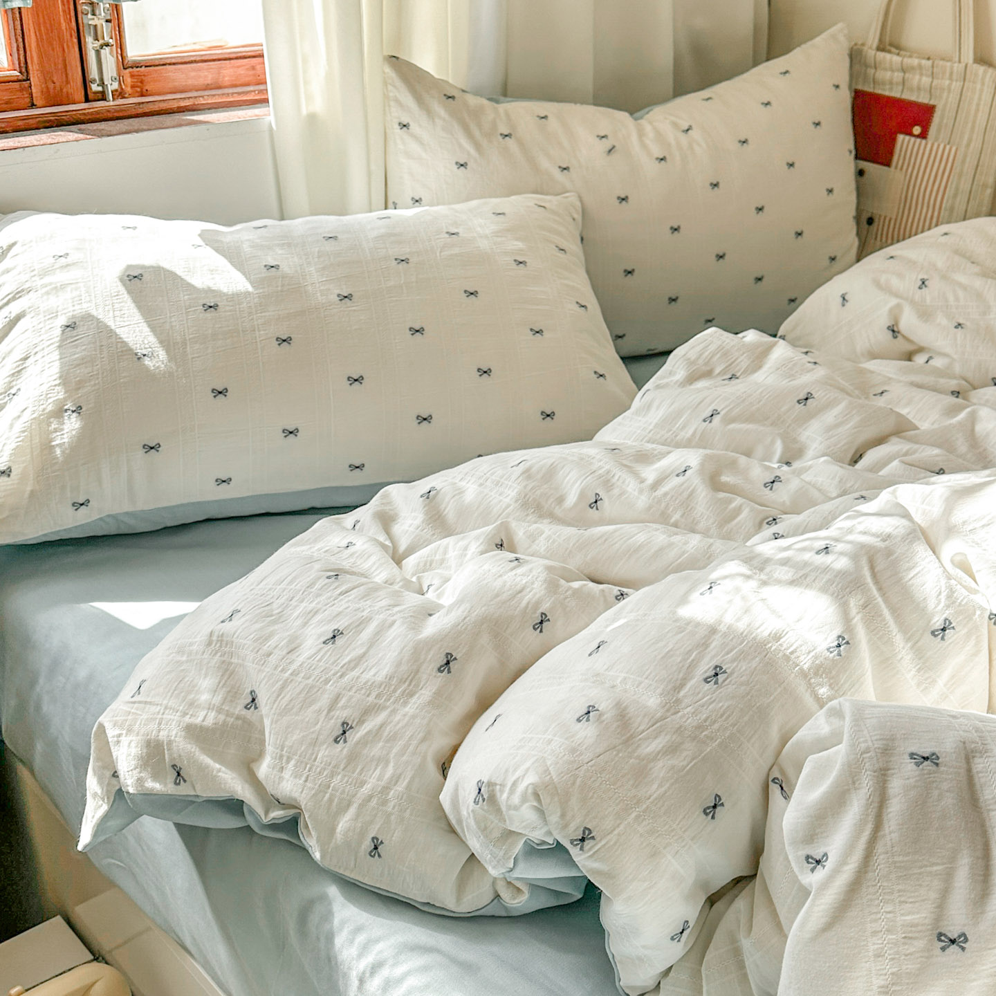 商品名称:田野 2026新款水洗棉提花人字小清新系列四件套 雾蓝蝴蝶结