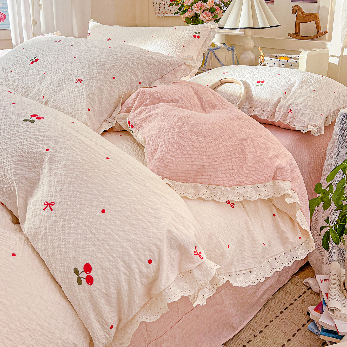(总)一比一家纺 2026新款彩色花边木棉皱皱纱四件套,阿吉豆,初心粉,初心蓝,扶摇,赫本,花间女孩,花漫漫,花蜜,阑珊,罗卡,奶芙喵,甜心格格,午后花园,小马驹,邂逅,野餐兔,樱花季,悠然,紫烟