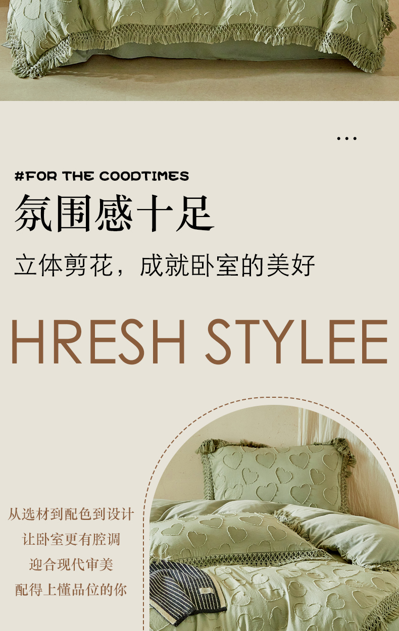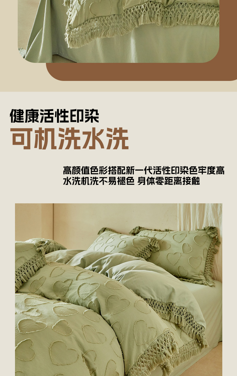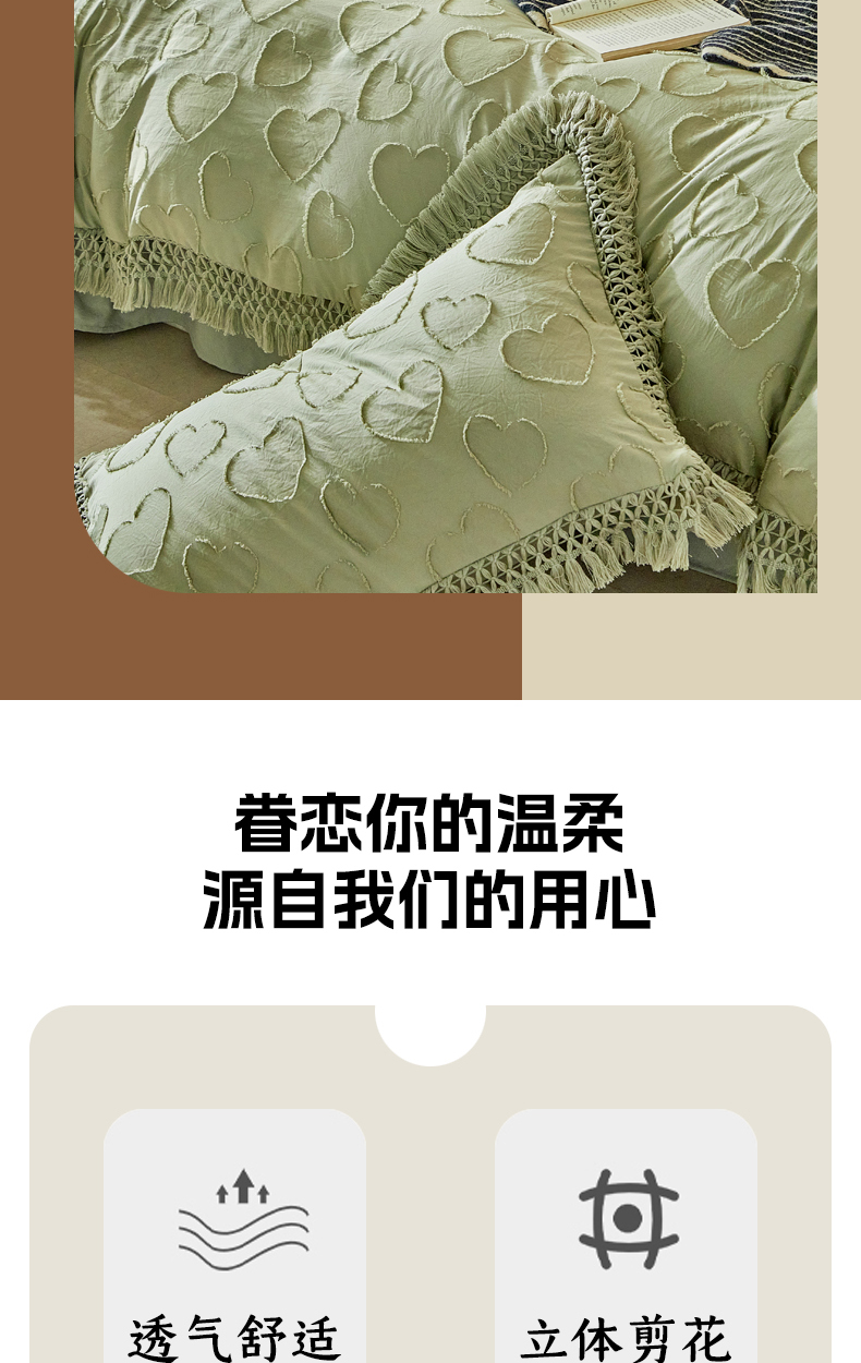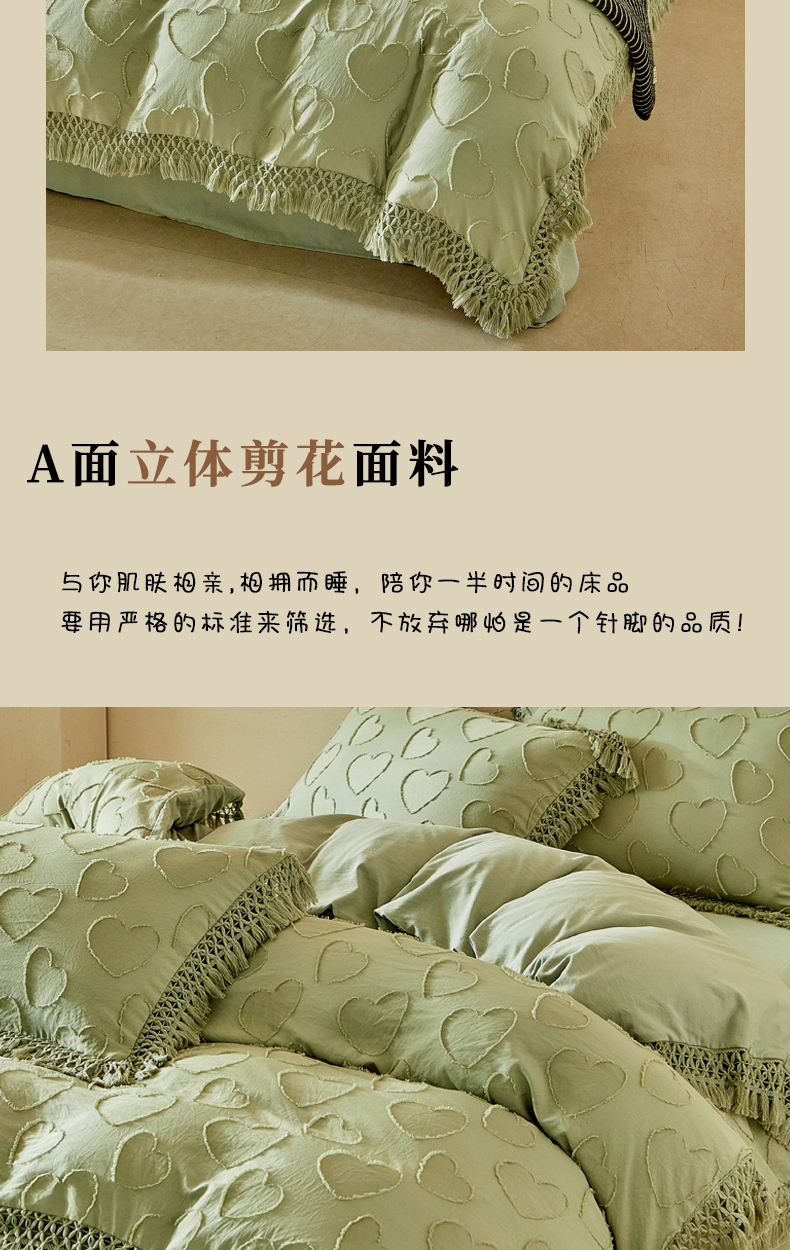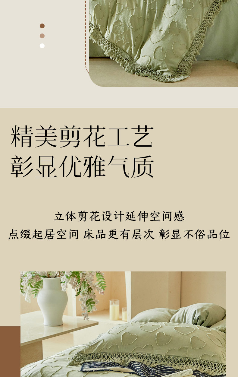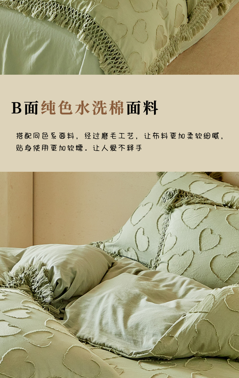 当前位置: 91家纺网 > 商品网购 > 床品套件 > 四件套 > 其它四件套 > 缘生活 2026春夏新款民宿立体剪花蝴蝶结流苏四件套 剪花爱心流苏抹茶绿