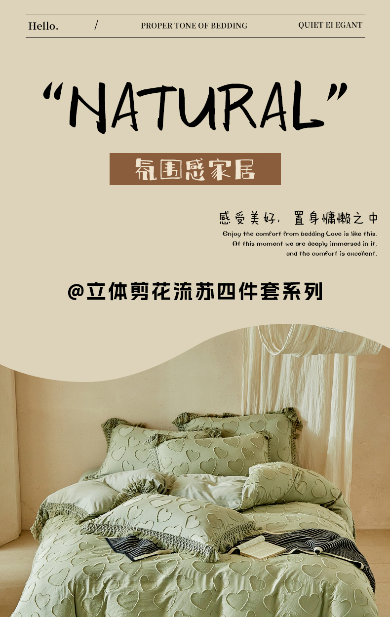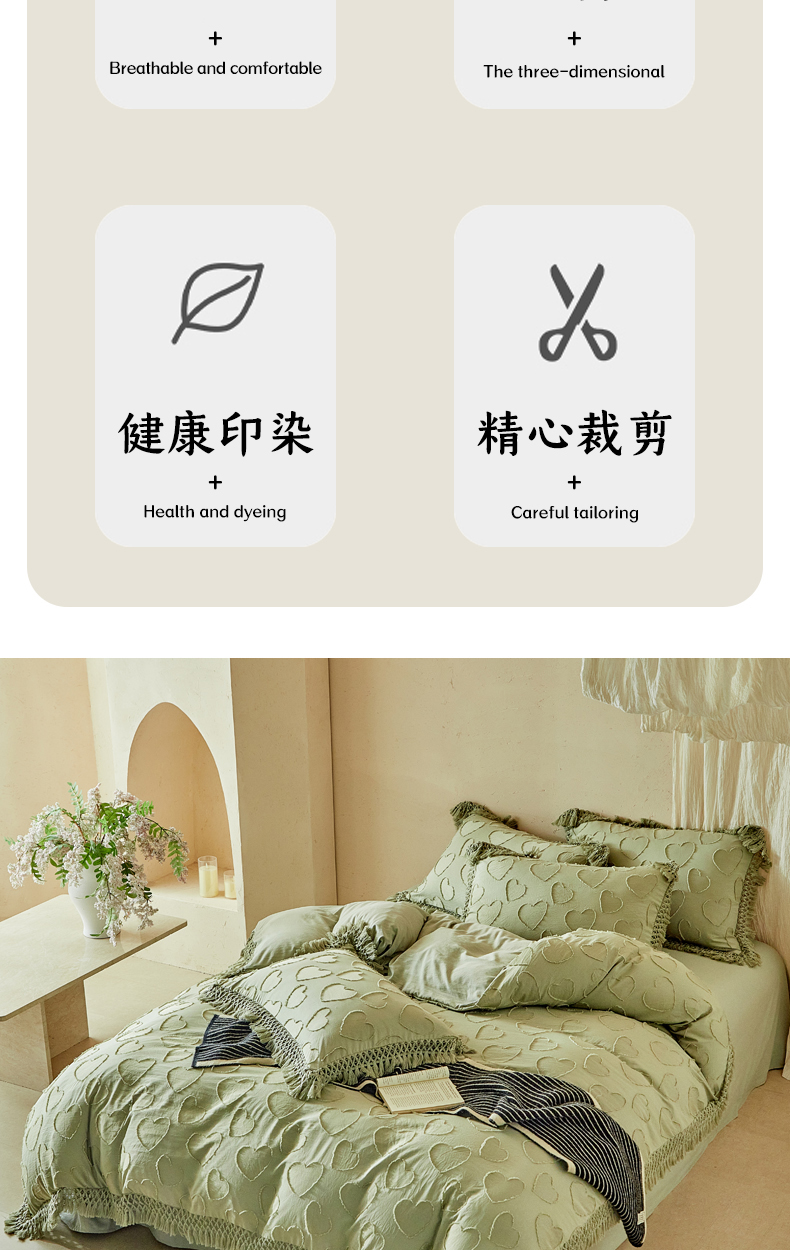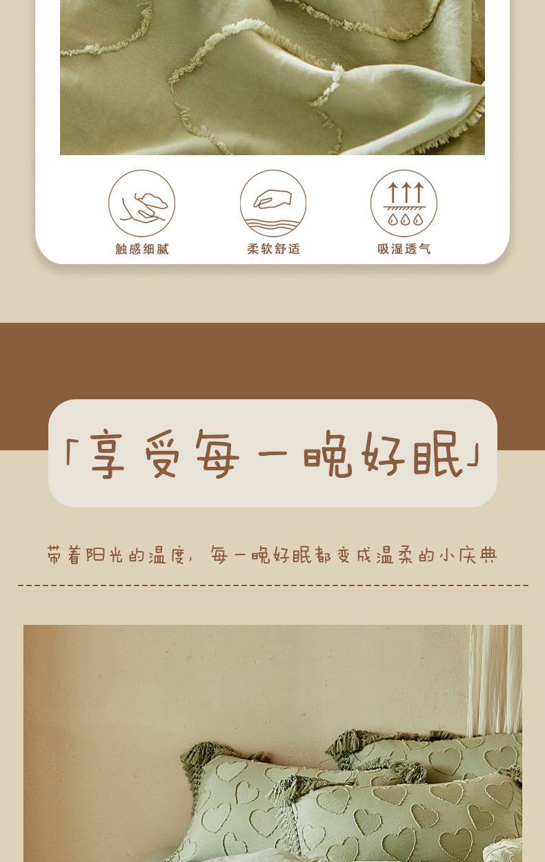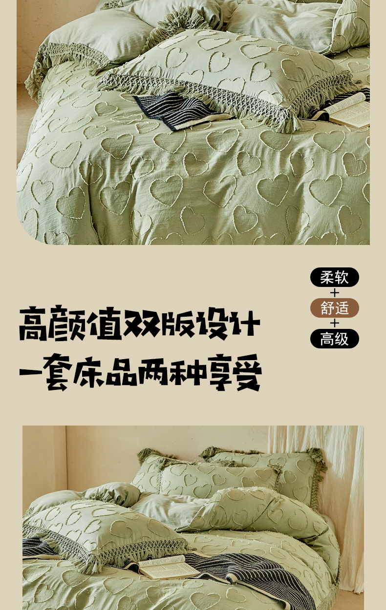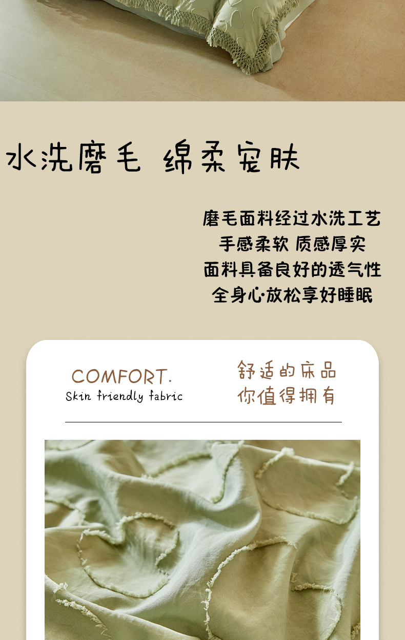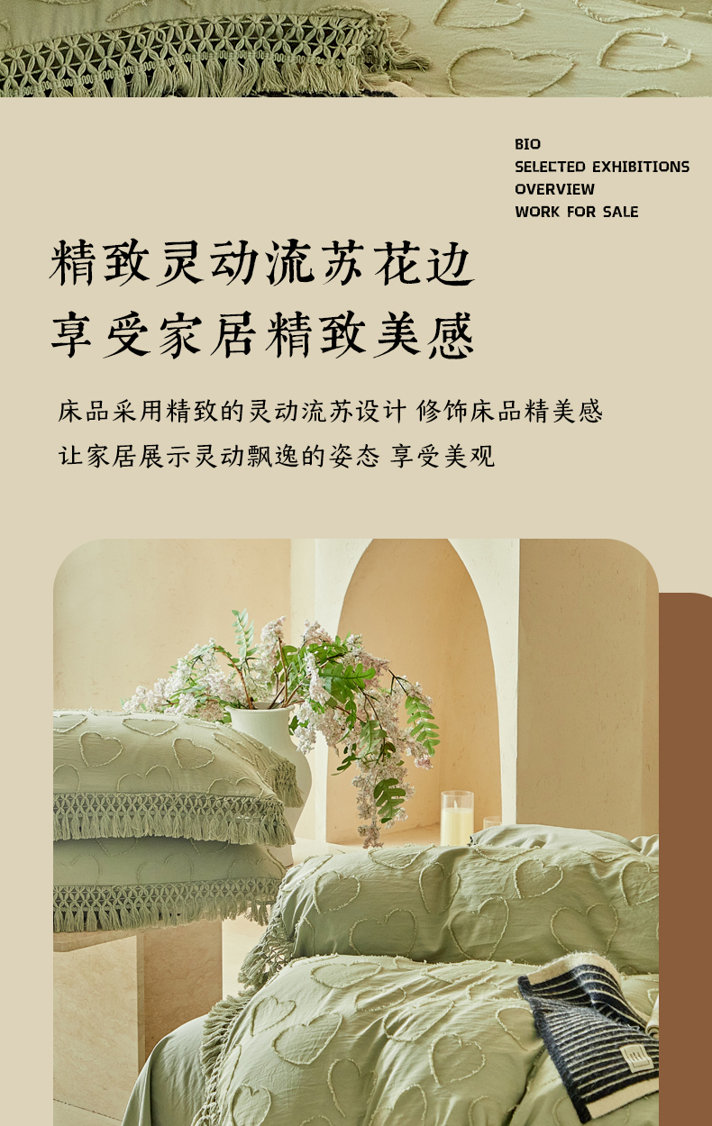 当前位置: 91家纺网 > 商品网购 > 床品套件 > 四件套 > 其它四件套 > 缘生活 2026春夏新款民宿立体剪花蝴蝶结流苏四件套 剪花爱心流苏抹茶绿