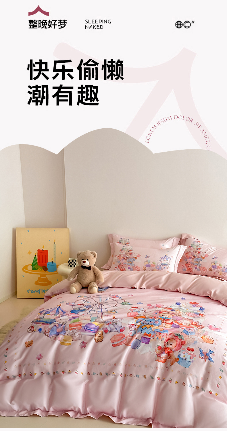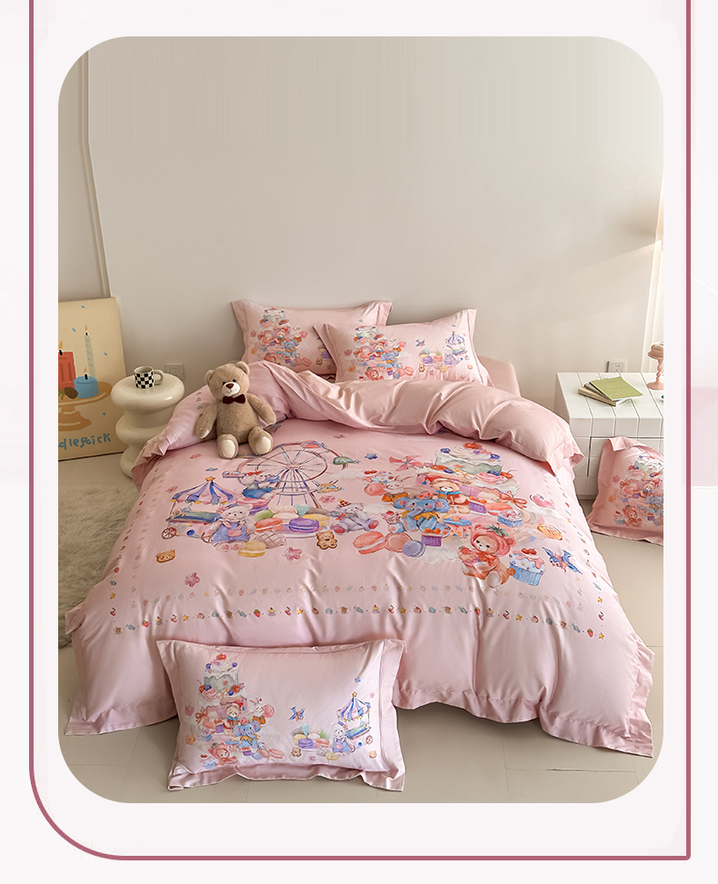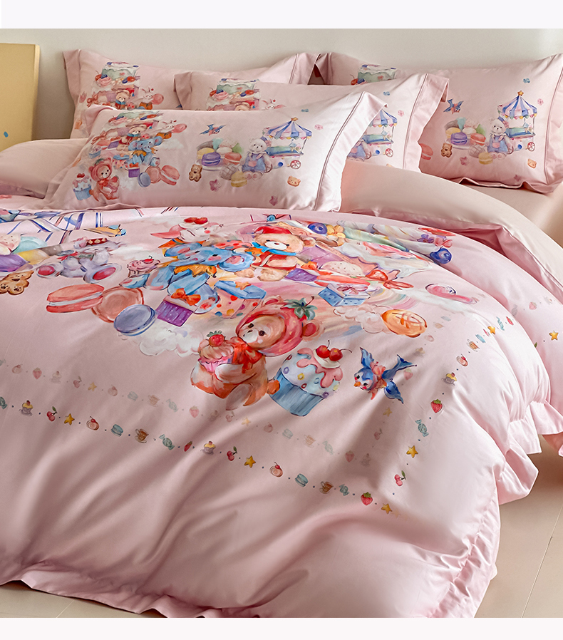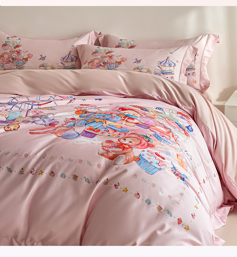 U品汇 2026新品纯棉全棉平网大版数码印花四件套高端60支长绒棉贡缎埋绳宽边系列 甜趣乐园(粉)