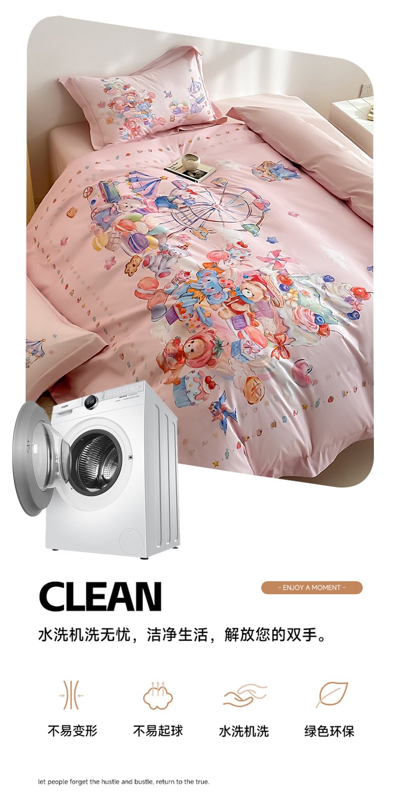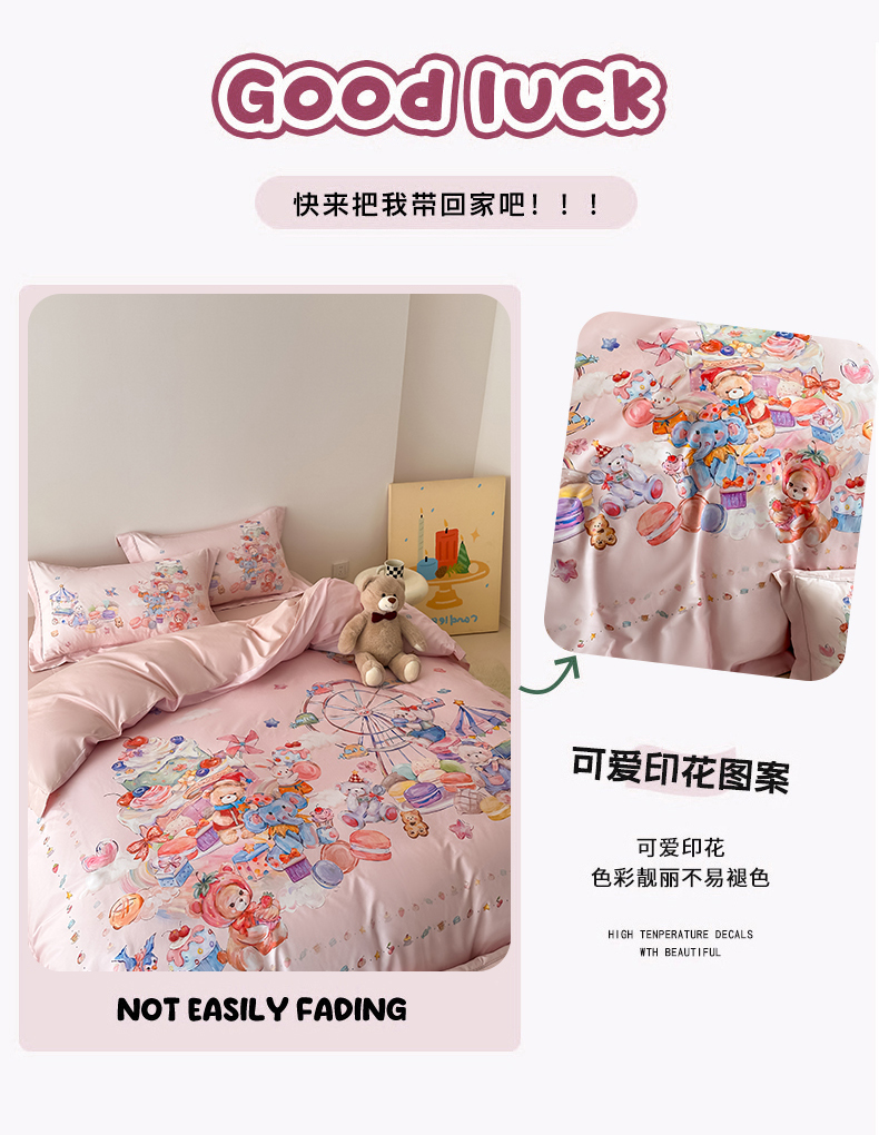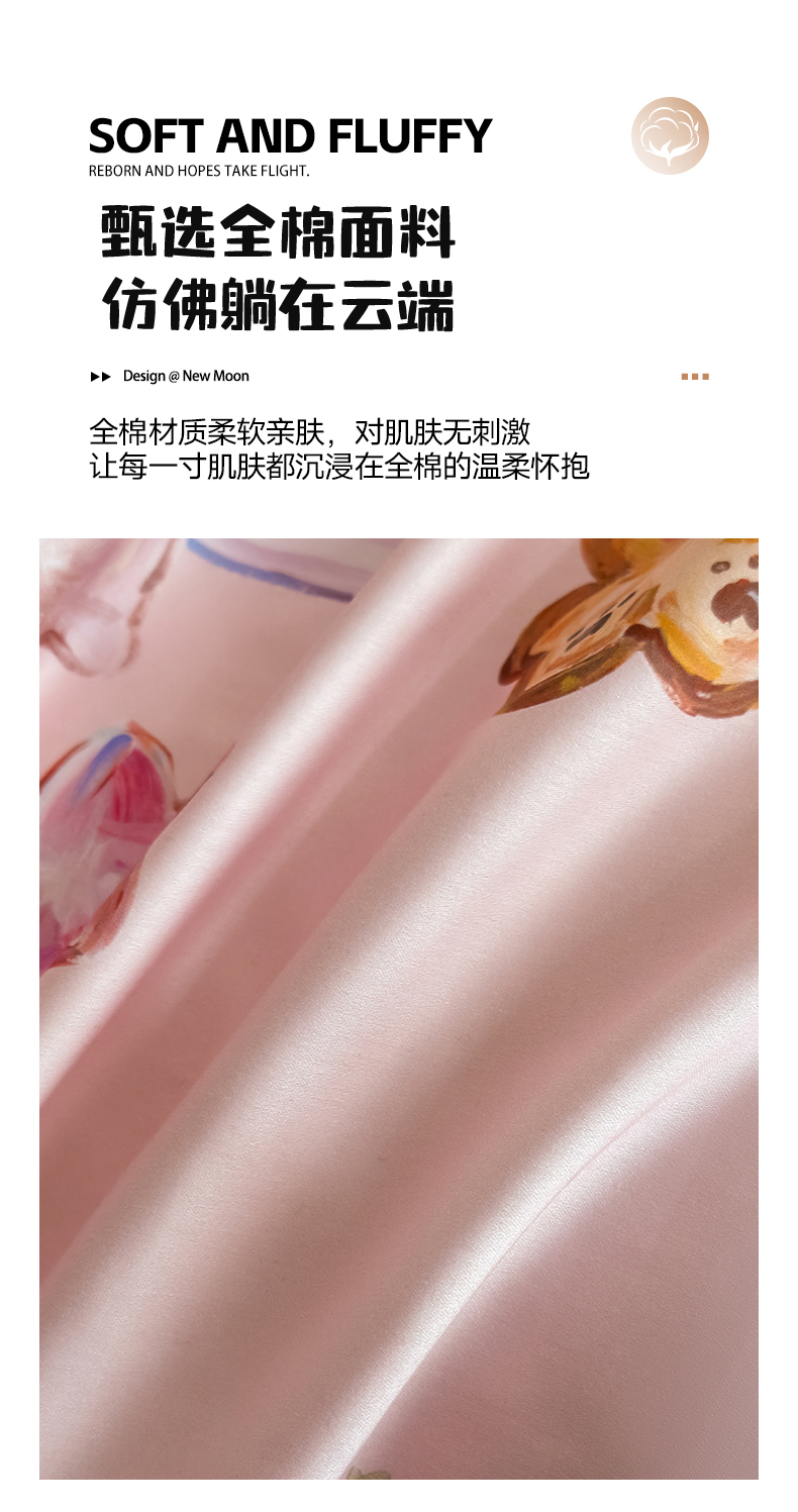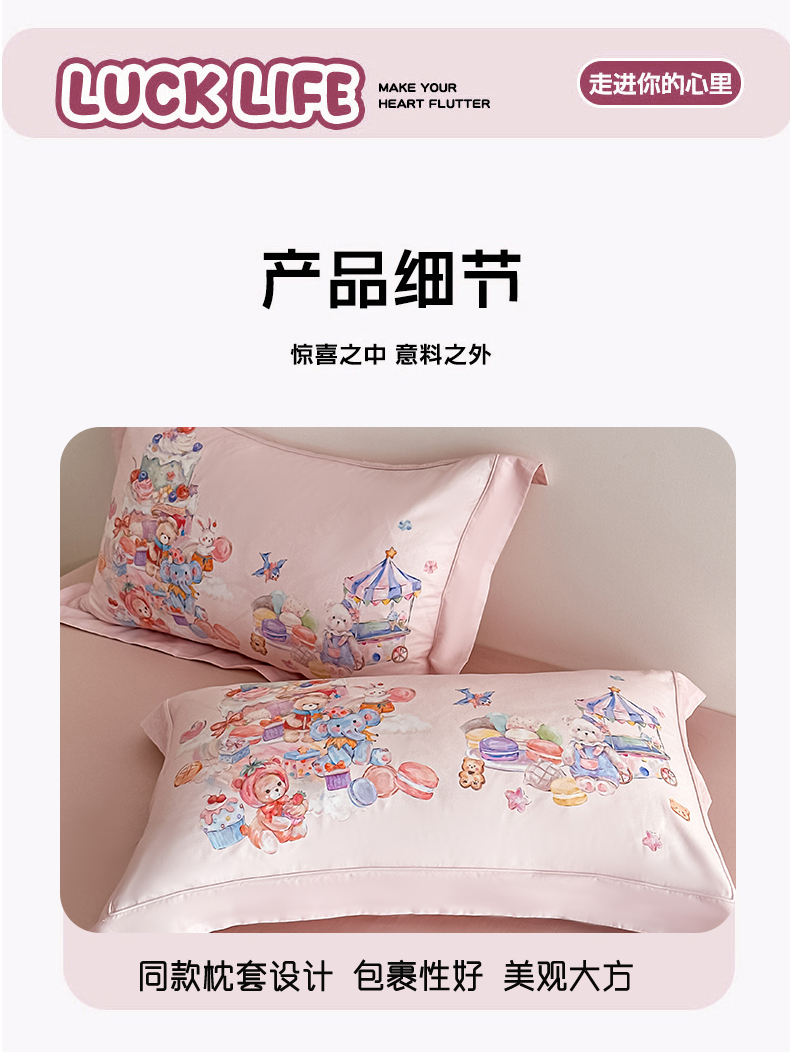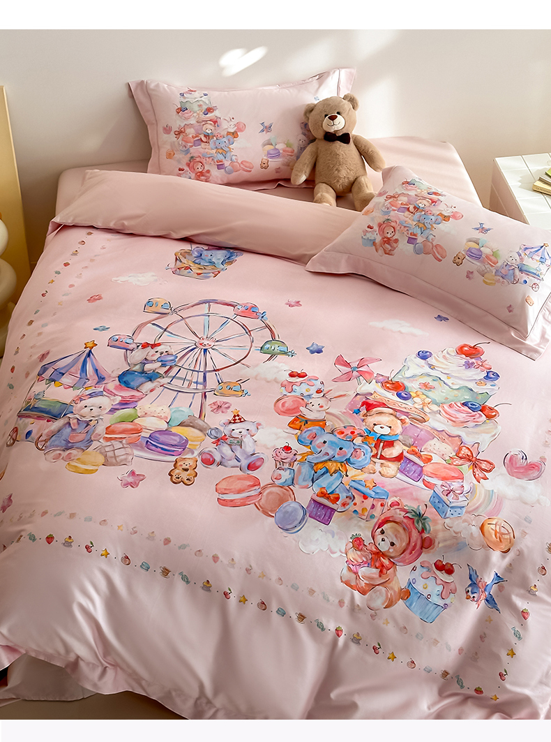 商品名称:U品汇 2026新品纯棉全棉平网大版数码印花四件套高端60支长绒棉贡缎埋绳宽边系列 甜趣乐园(粉)