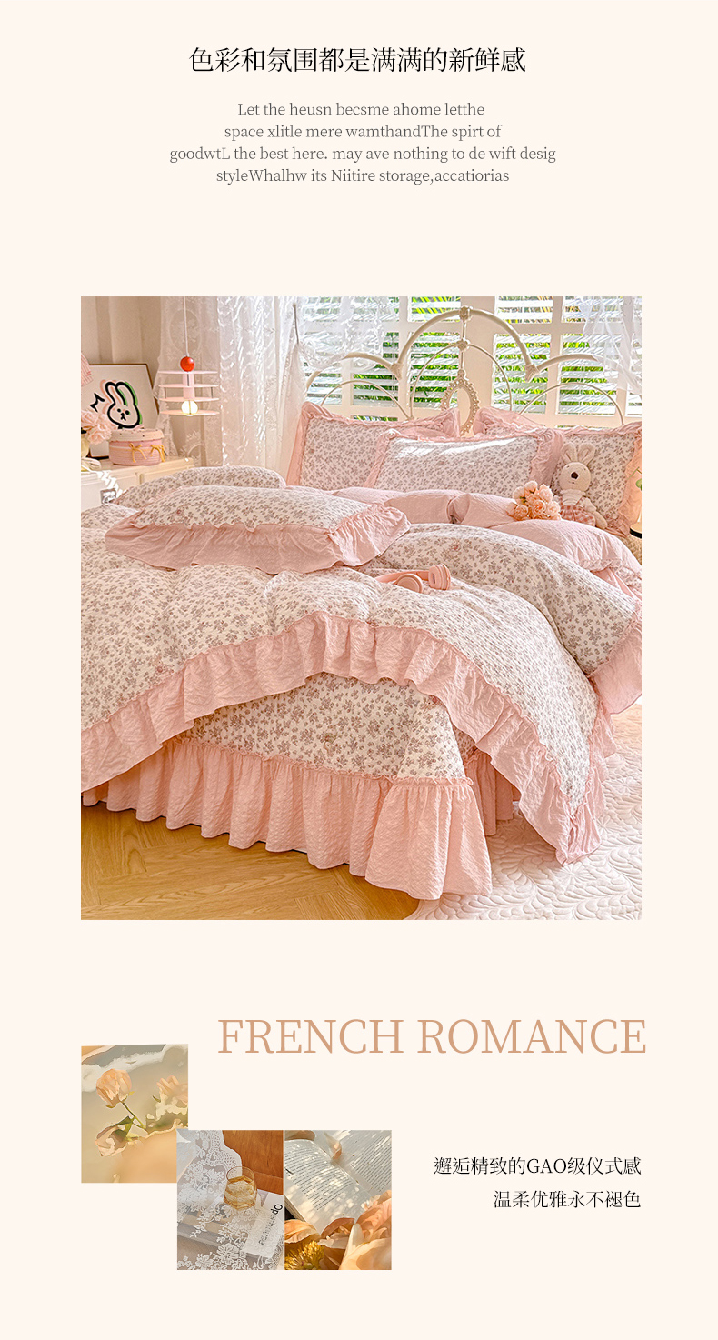 韩约家纺 2026新款法式大花边泡芙棉床盖款被套四件套 花涧