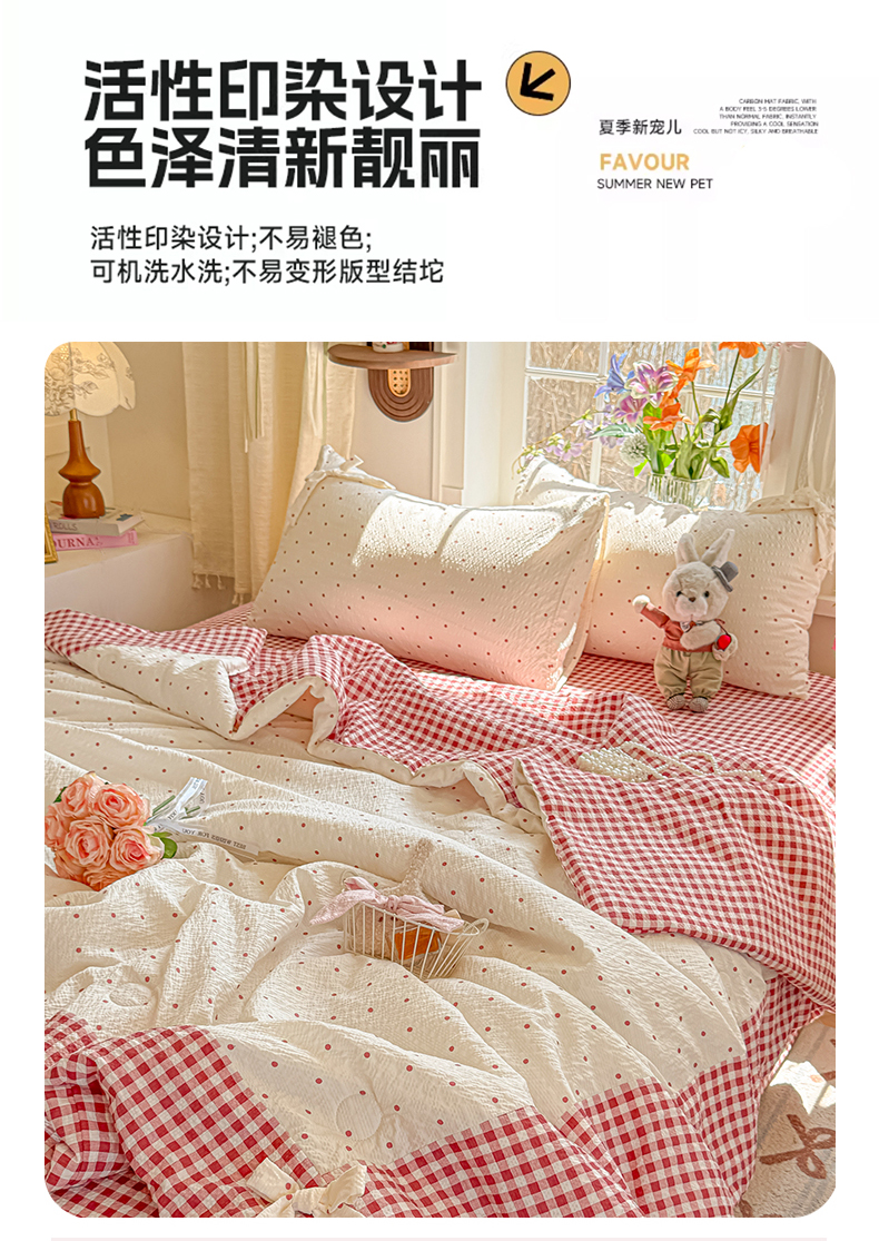 瑞禾家纺(原阿亮) 2026新款提花泡芙棉拼角蝴蝶结软乎乎的撸猫感单夏被夏被四件套-甜莓气泡 甜莓气泡-奶红波点