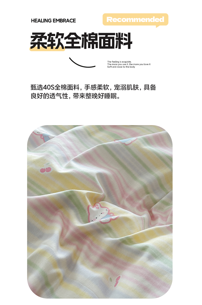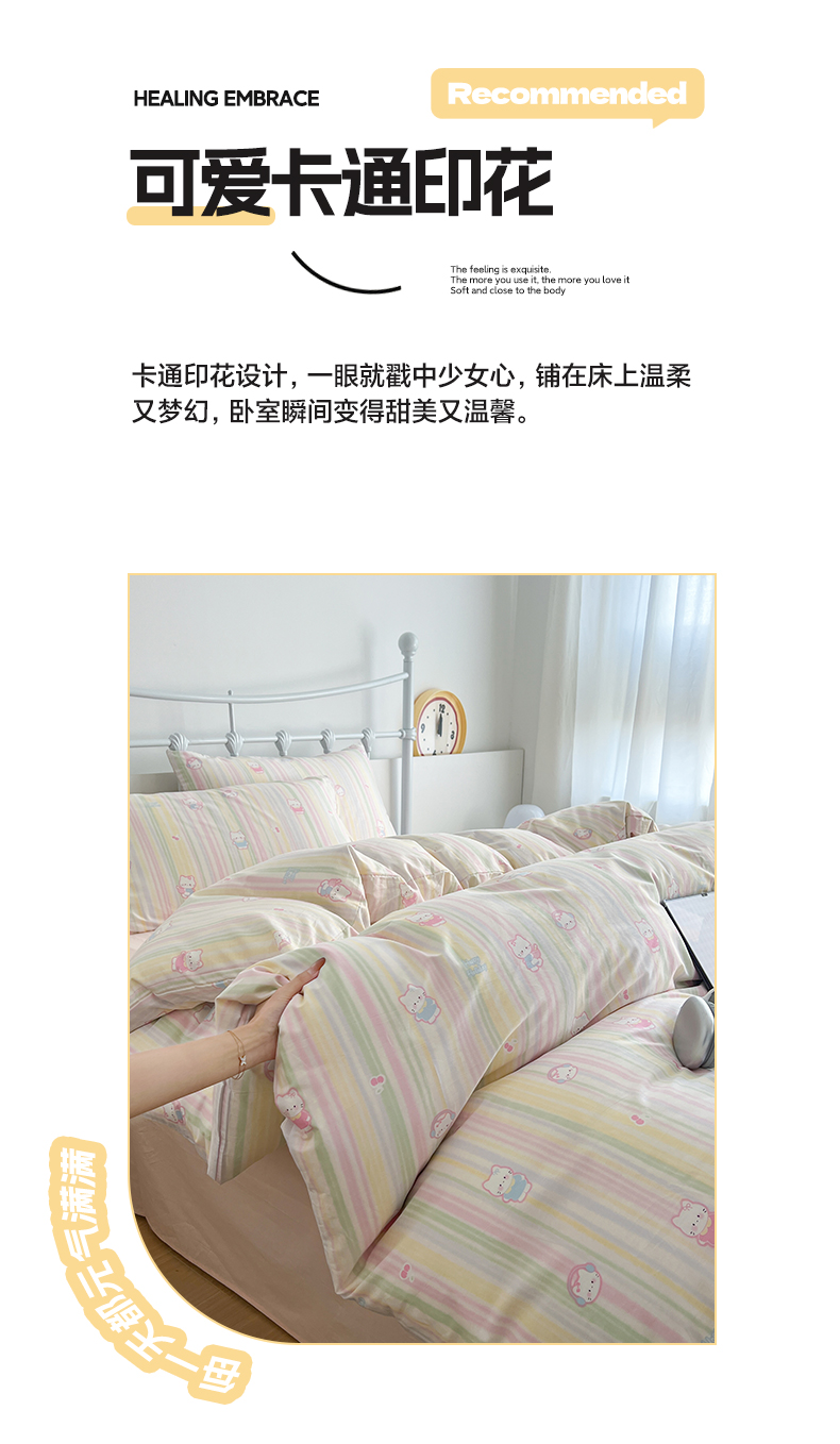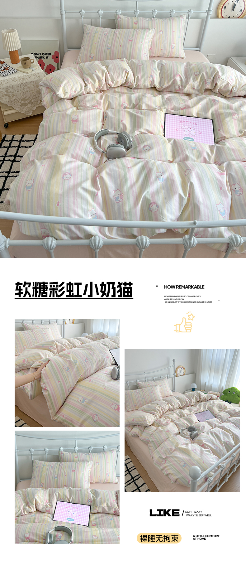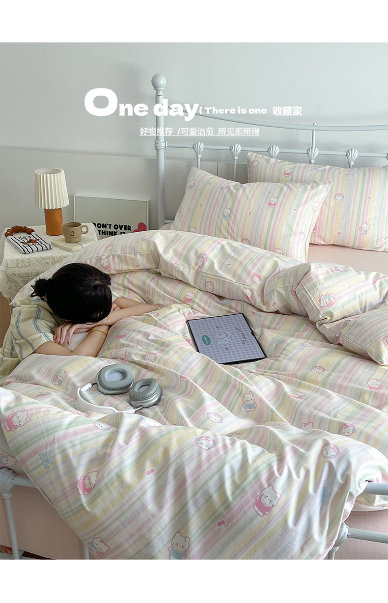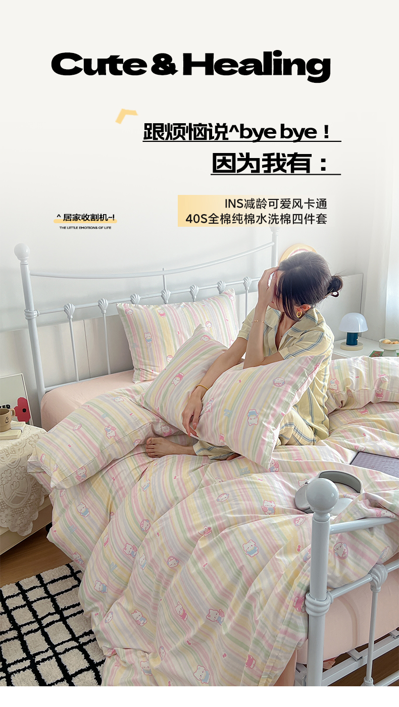 商品名称:早晨家纺 2026新款INS减龄可爱风卡通40支全棉纯棉色织水洗棉四件套 软糖彩虹小奶猫
