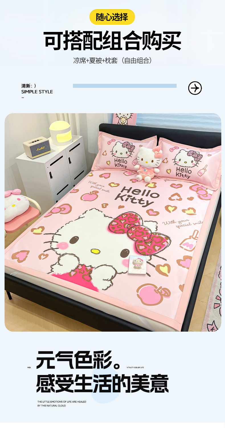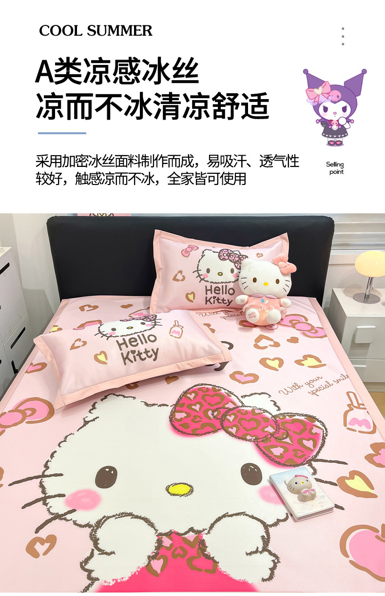 当前位置: 91家纺网 > 商品网购 > 床上用品 > 凉席 > 冰丝席 > 暮思家居 2026新款正版授权A类大版数码印花三丽鸥1200D冰丝凉席可组合仿锦氨夏被 平铺款-豹纹KT猫