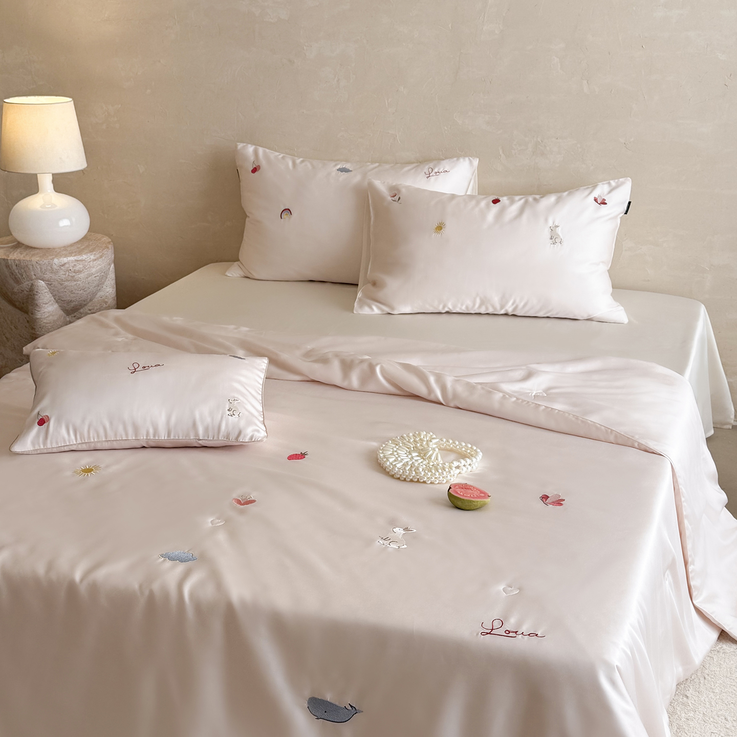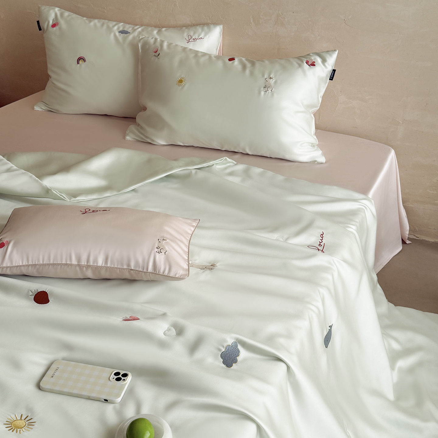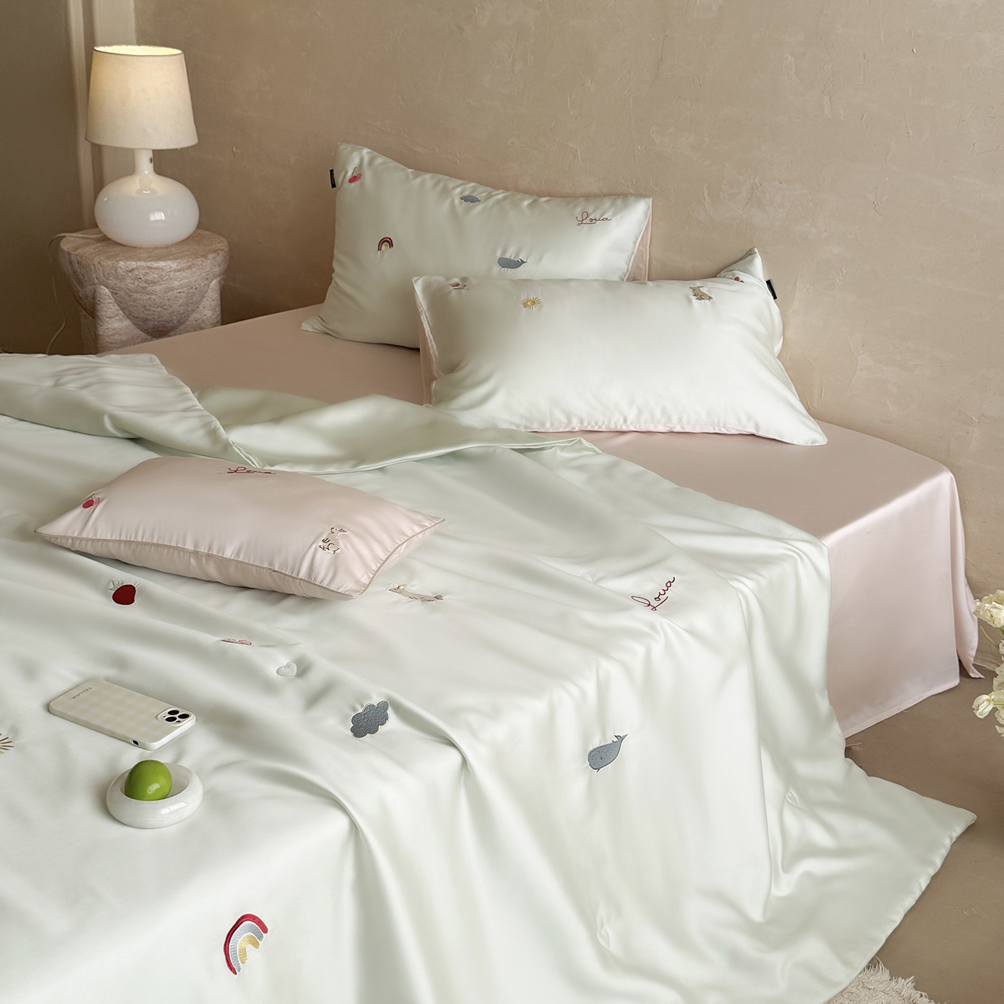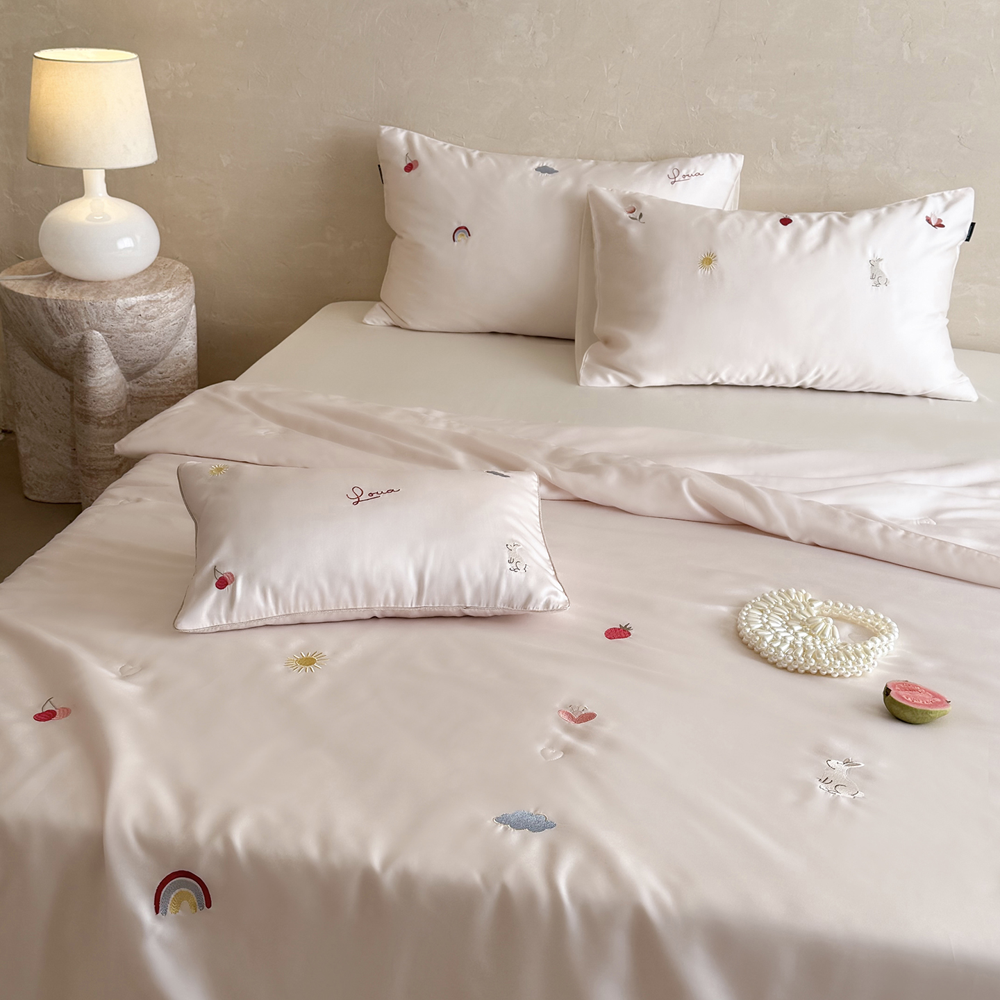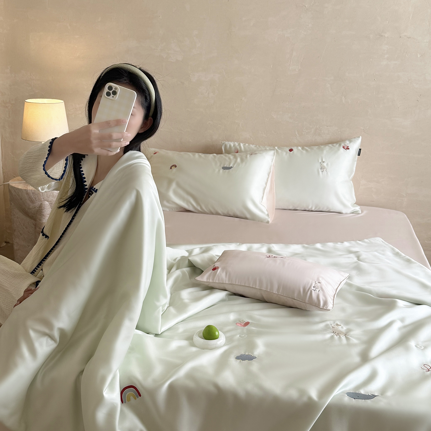 当前位置: 91家纺网 > 商品网购 > 被子 > 莱赛尔夏被 > (总)鹿班家居 2026夏季新品60S兰精天丝刺绣夏被系列-彩虹小兔