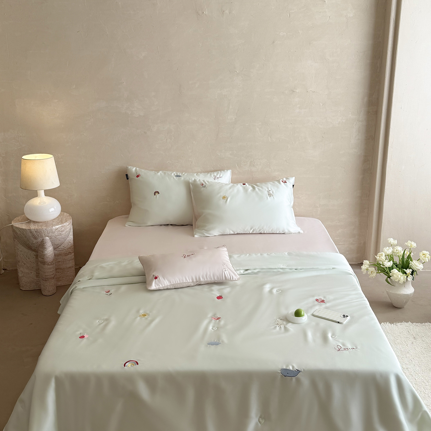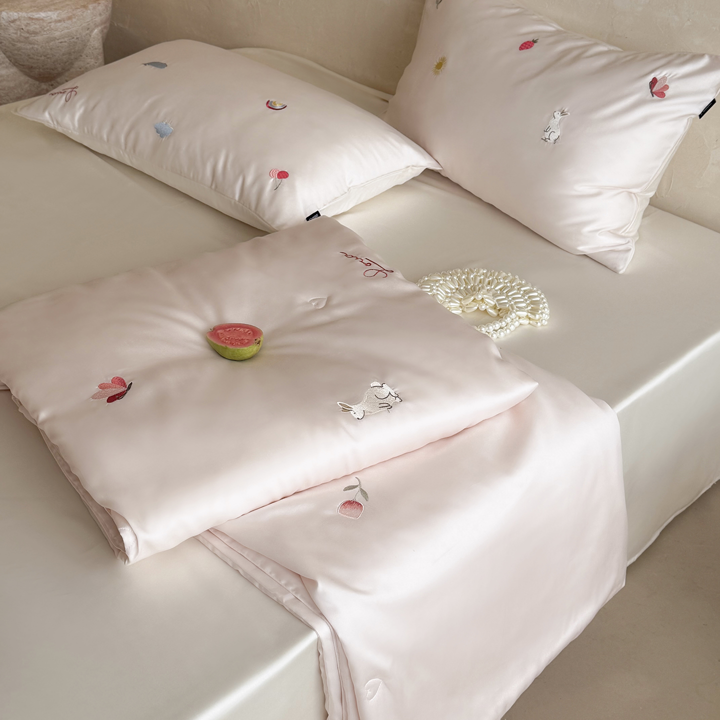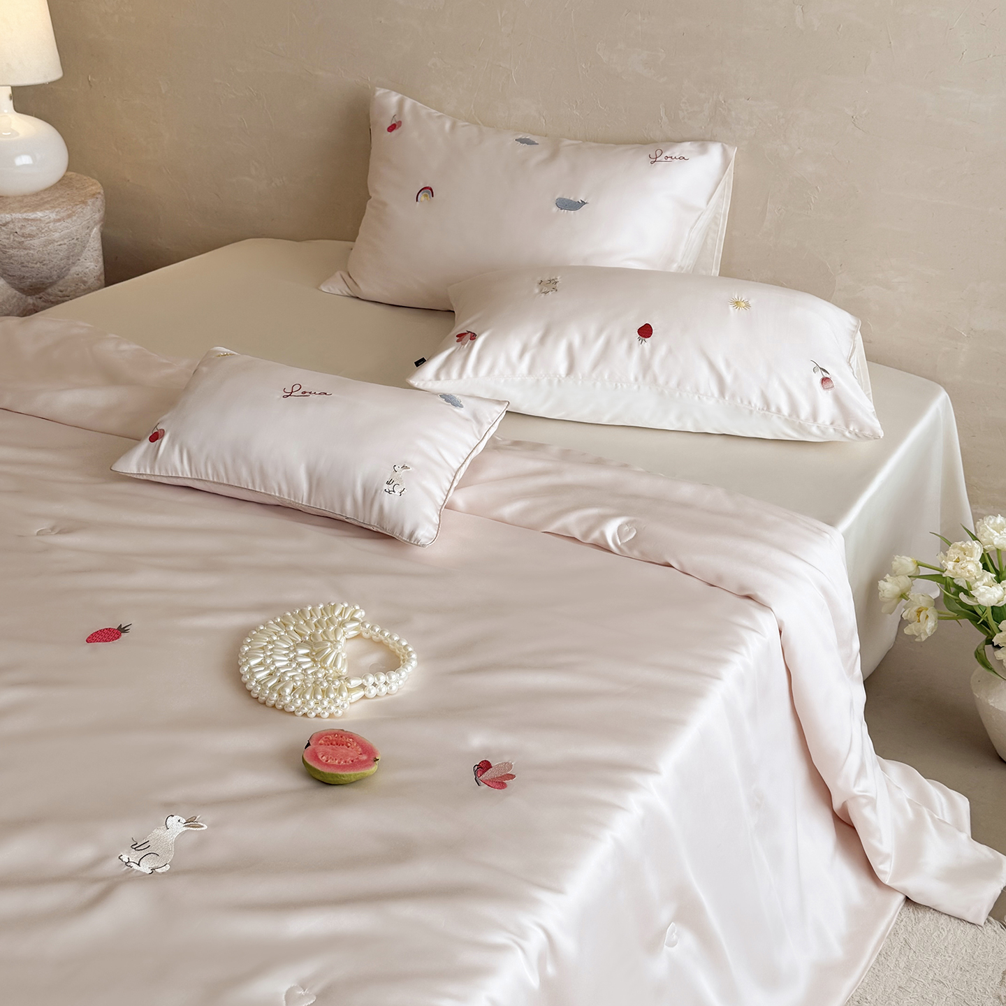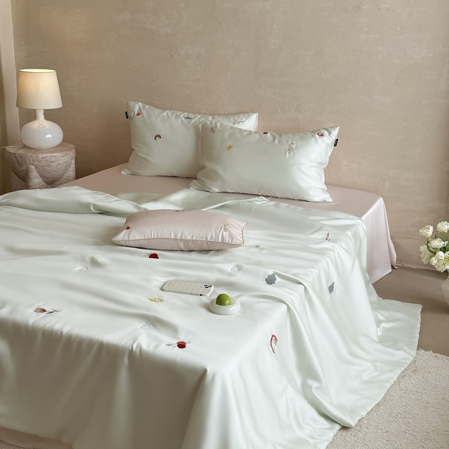 当前位置: 91家纺网 > 商品网购 > 被子 > 莱赛尔夏被 > (总)鹿班家居 2026夏季新品60S兰精天丝刺绣夏被系列-彩虹小兔