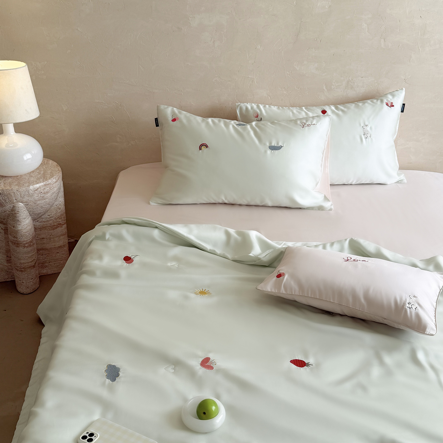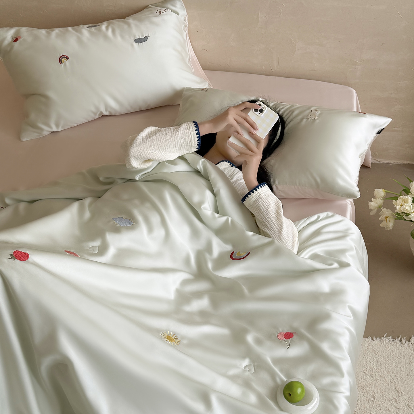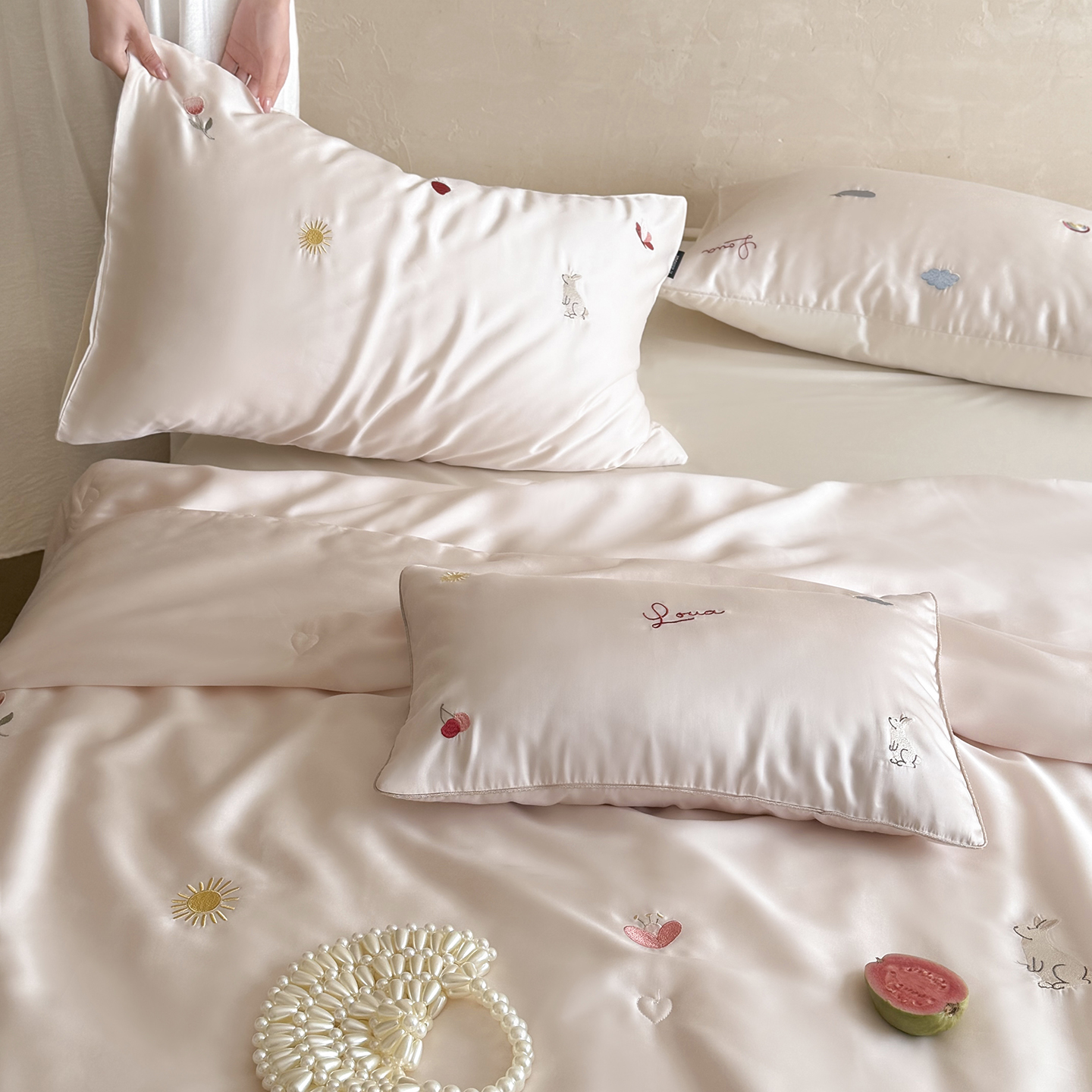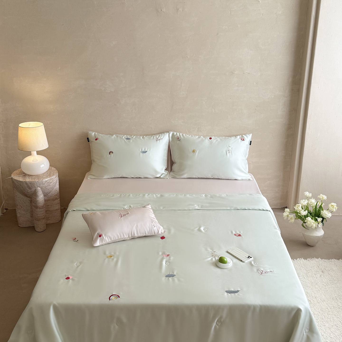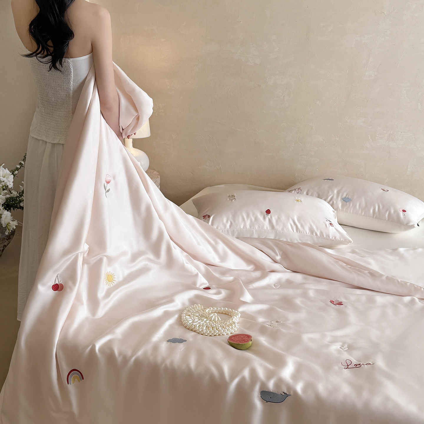 当前位置: 91家纺网 > 商品网购 > 被子 > 莱赛尔夏被 > (总)鹿班家居 2026夏季新品60S兰精天丝刺绣夏被系列-彩虹小兔