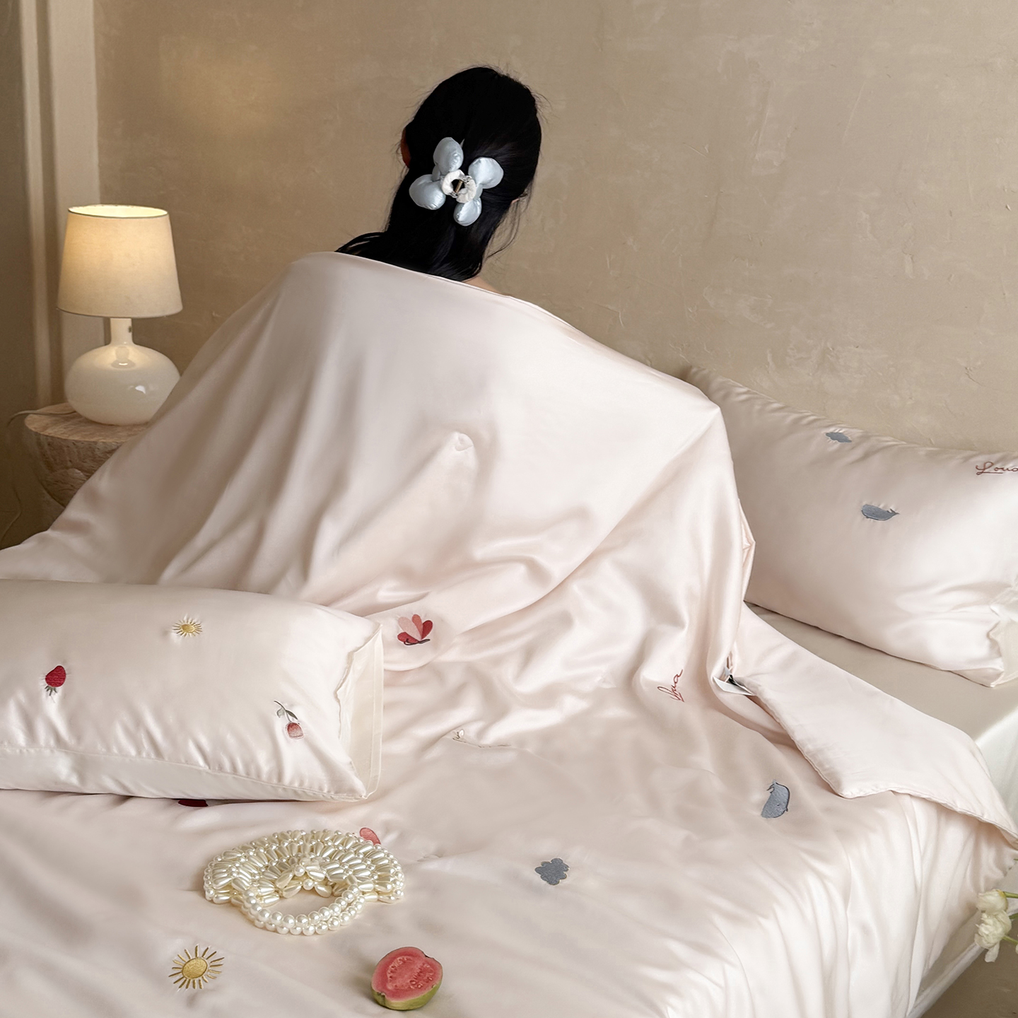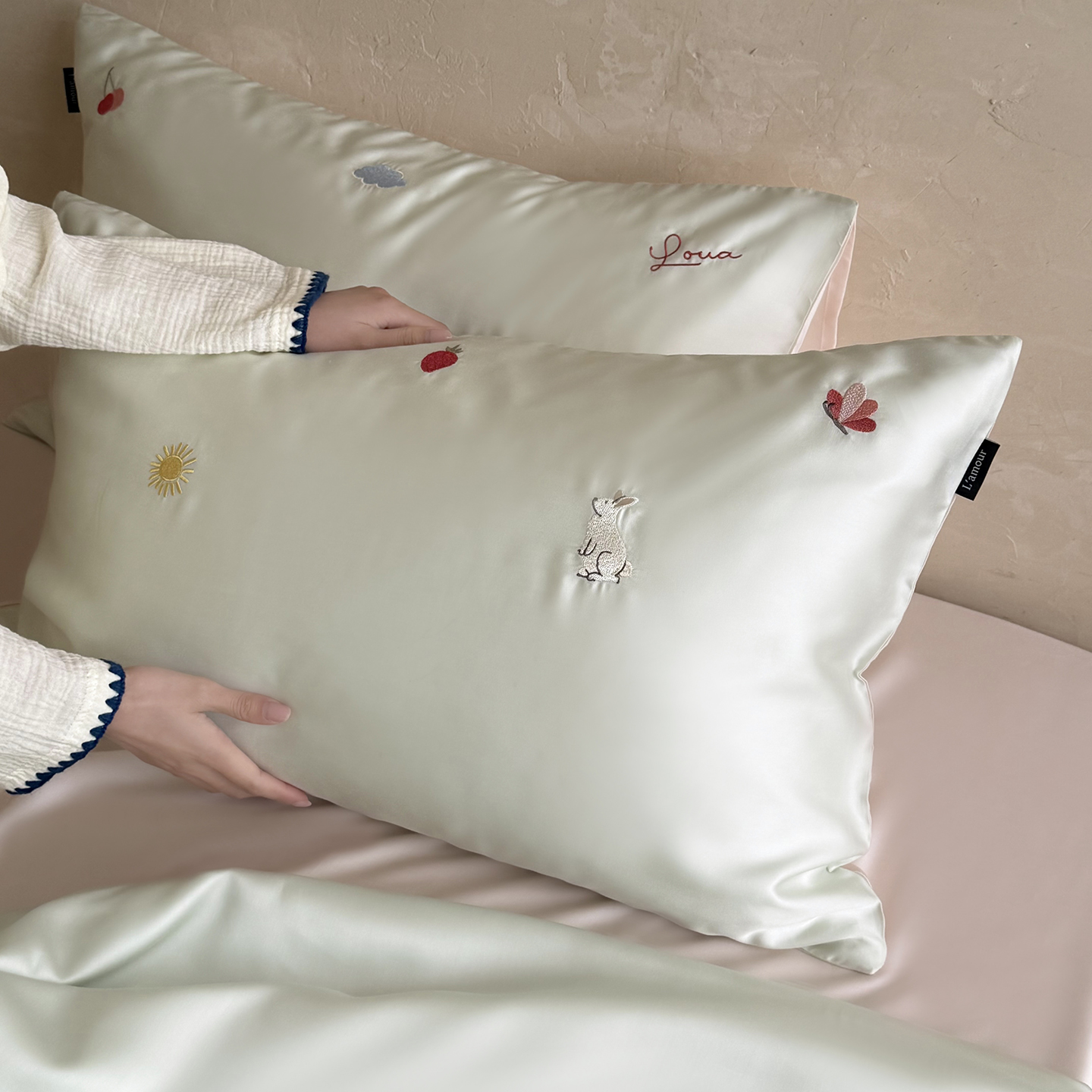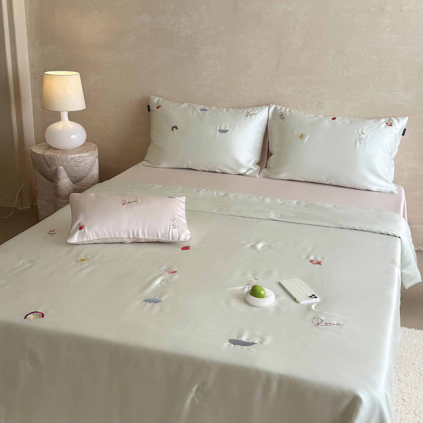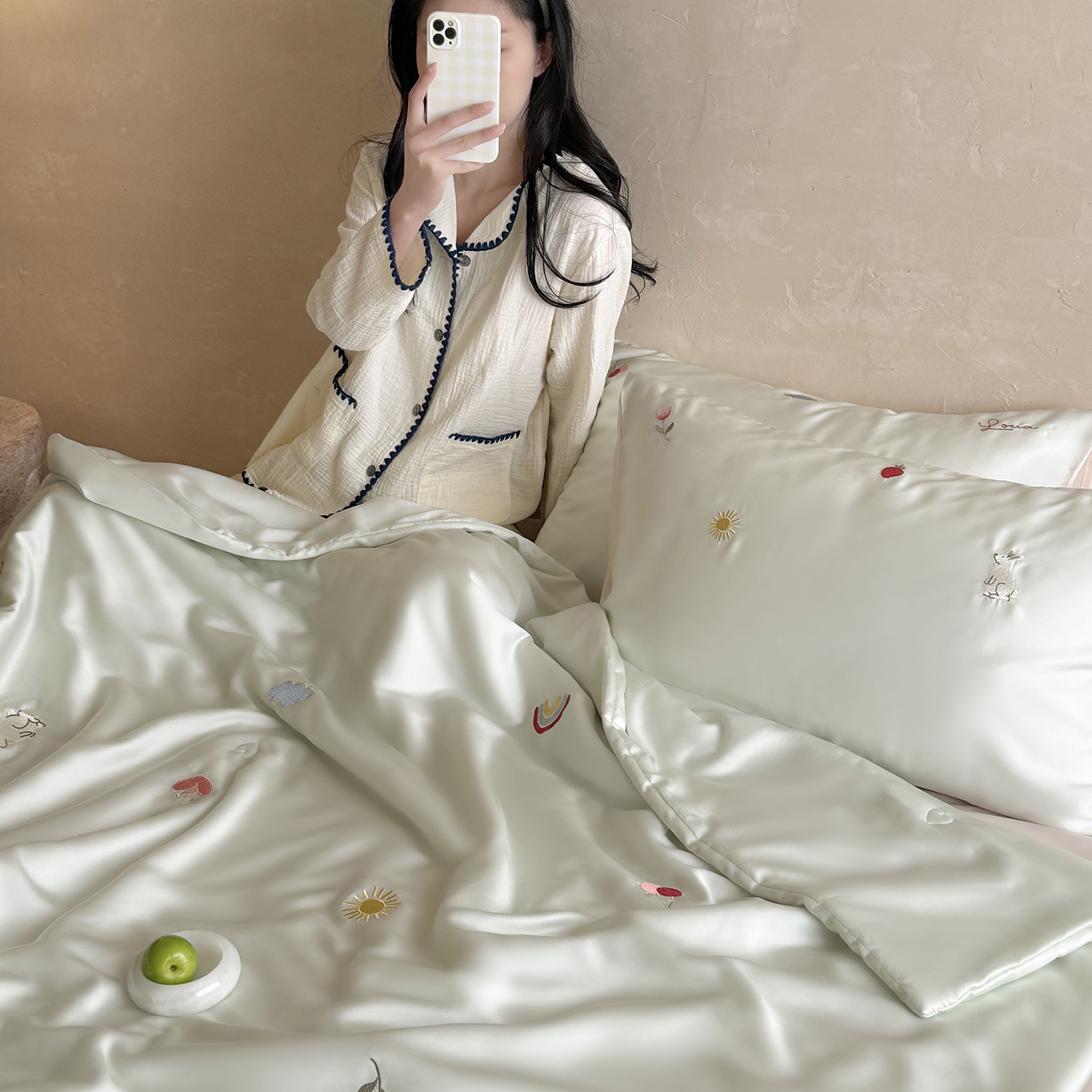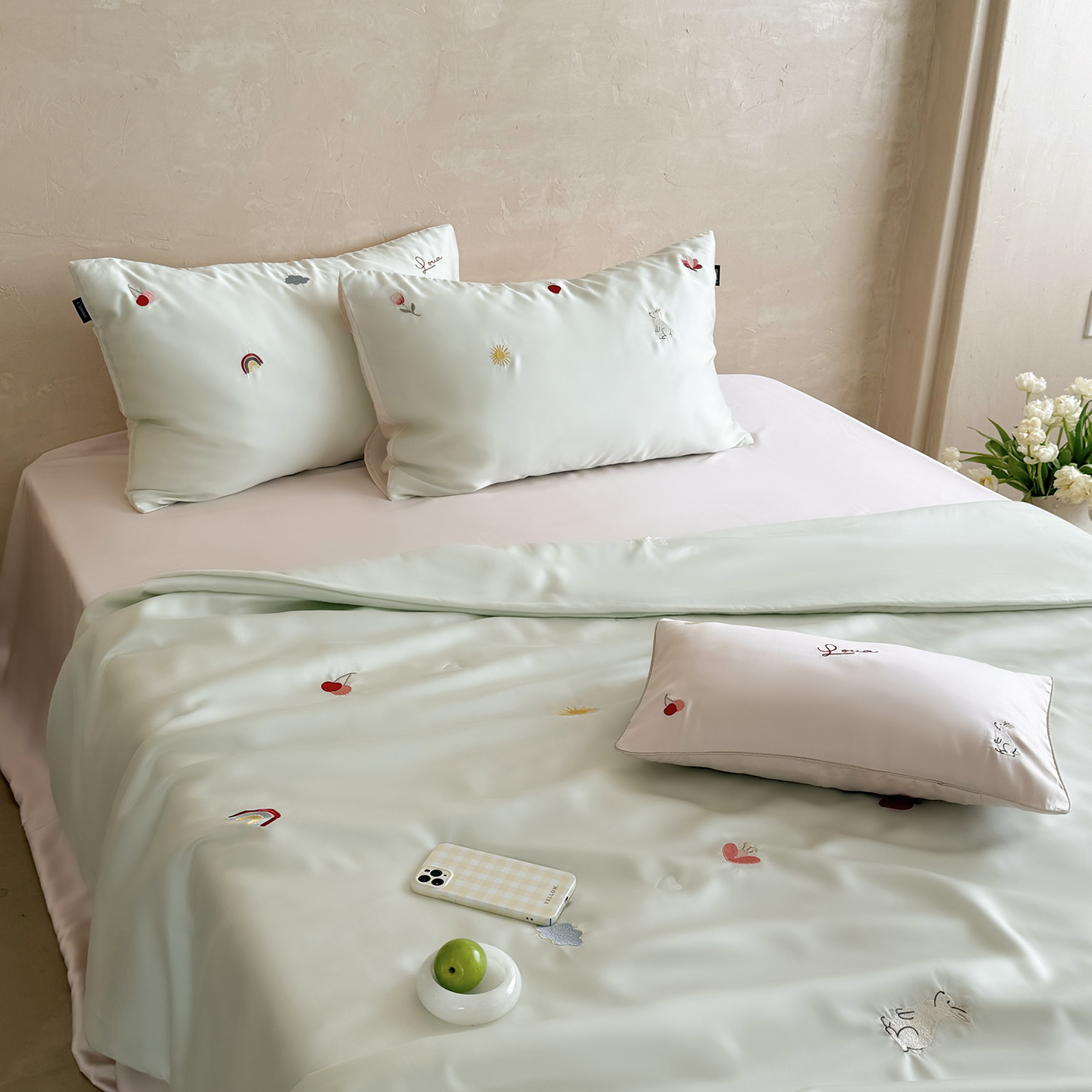 当前位置: 91家纺网 > 商品网购 > 被子 > 莱赛尔夏被 > (总)鹿班家居 2026夏季新品60S兰精天丝刺绣夏被系列-彩虹小兔