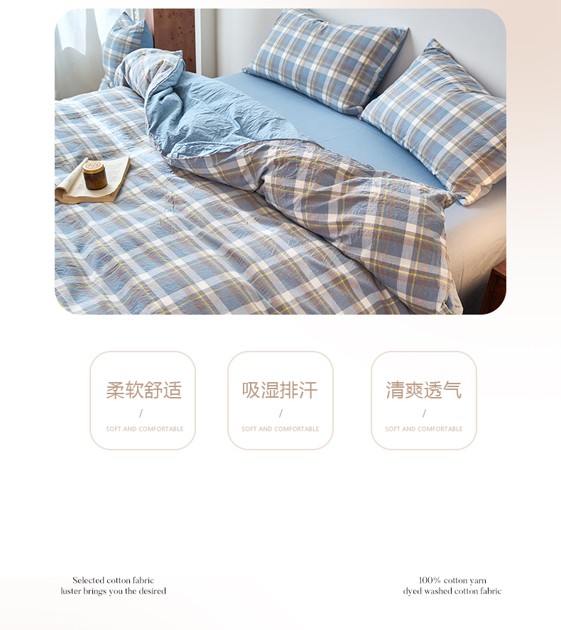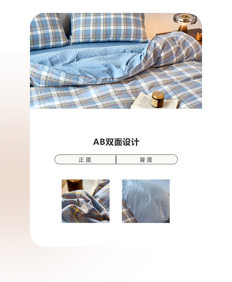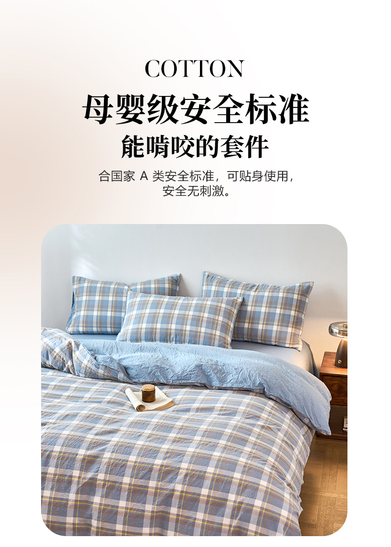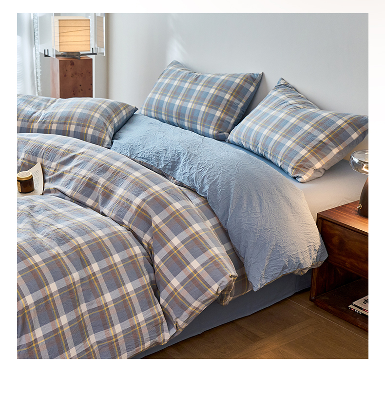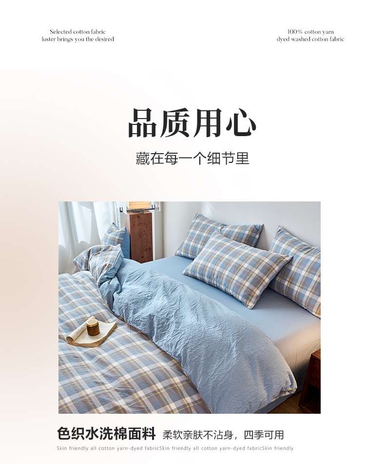 当前位置: 91家纺网 > 商品网购 > 床品套件 > 四件套 > 全棉普通四件套 > 春皖家纺 2026春夏新款全棉纯棉水洗棉四件套 素雅-蓝格
