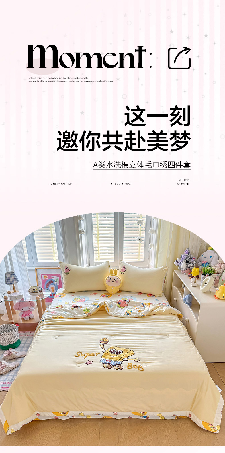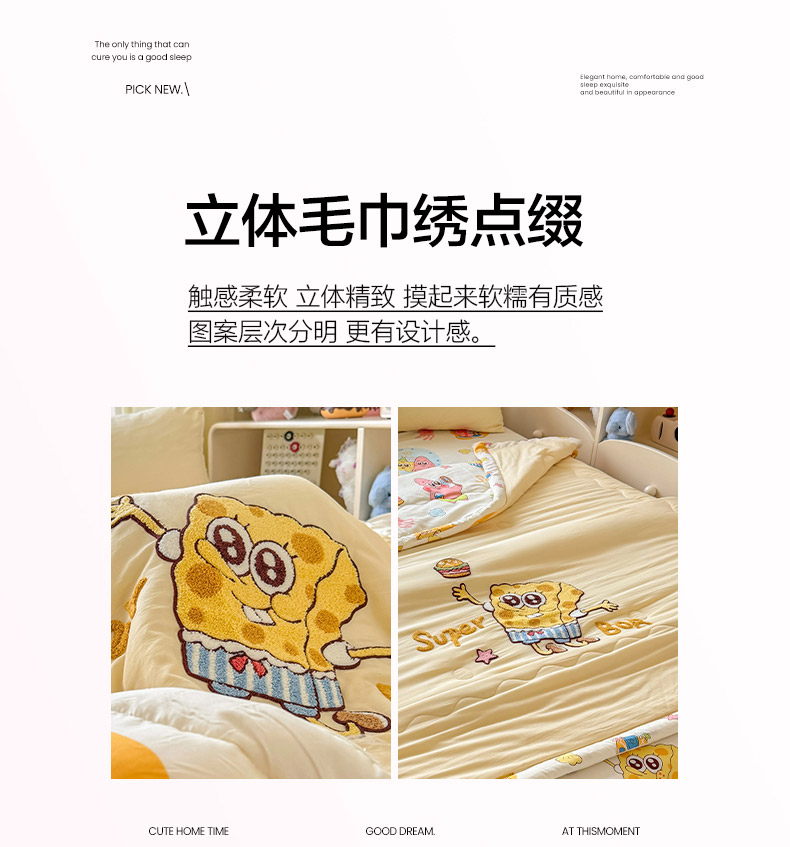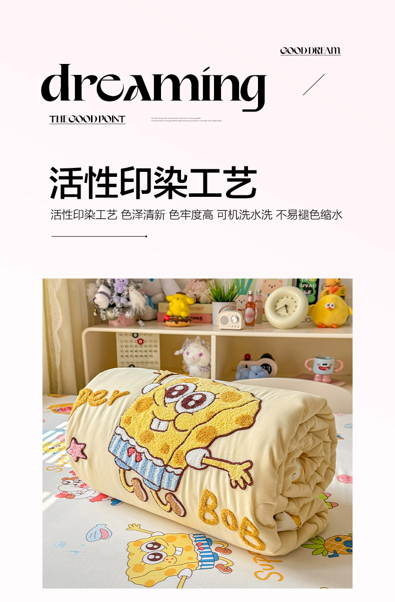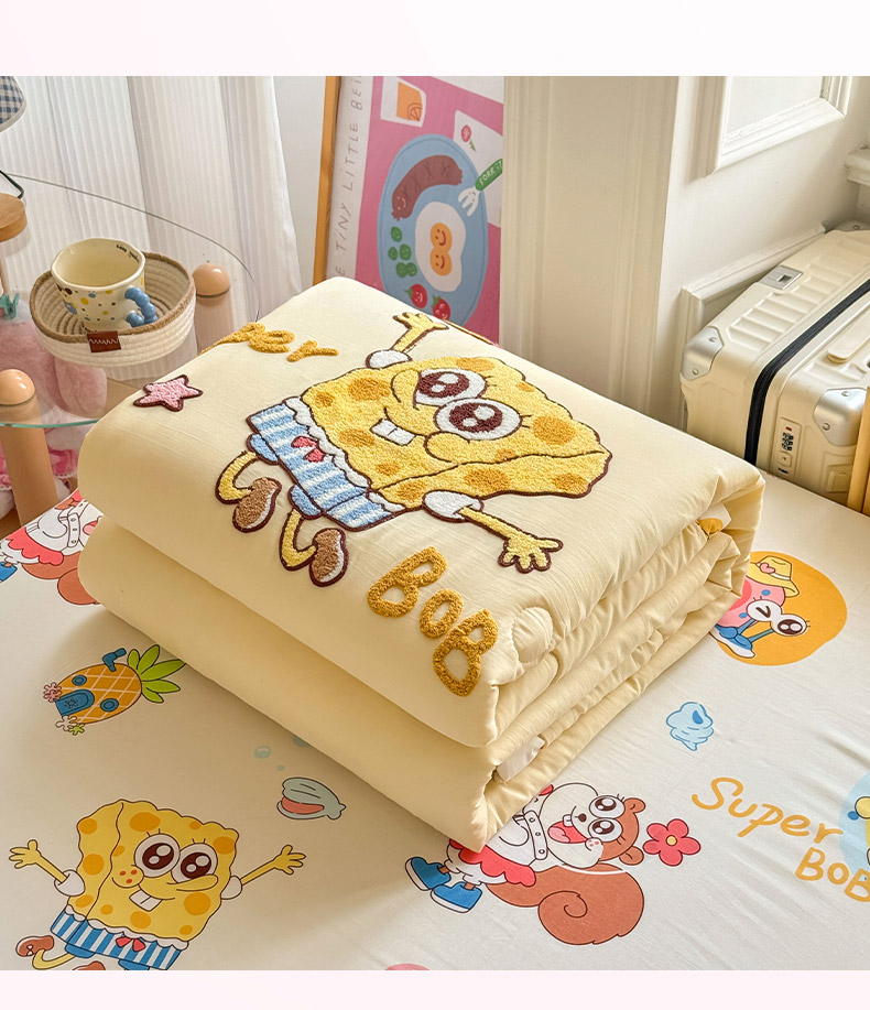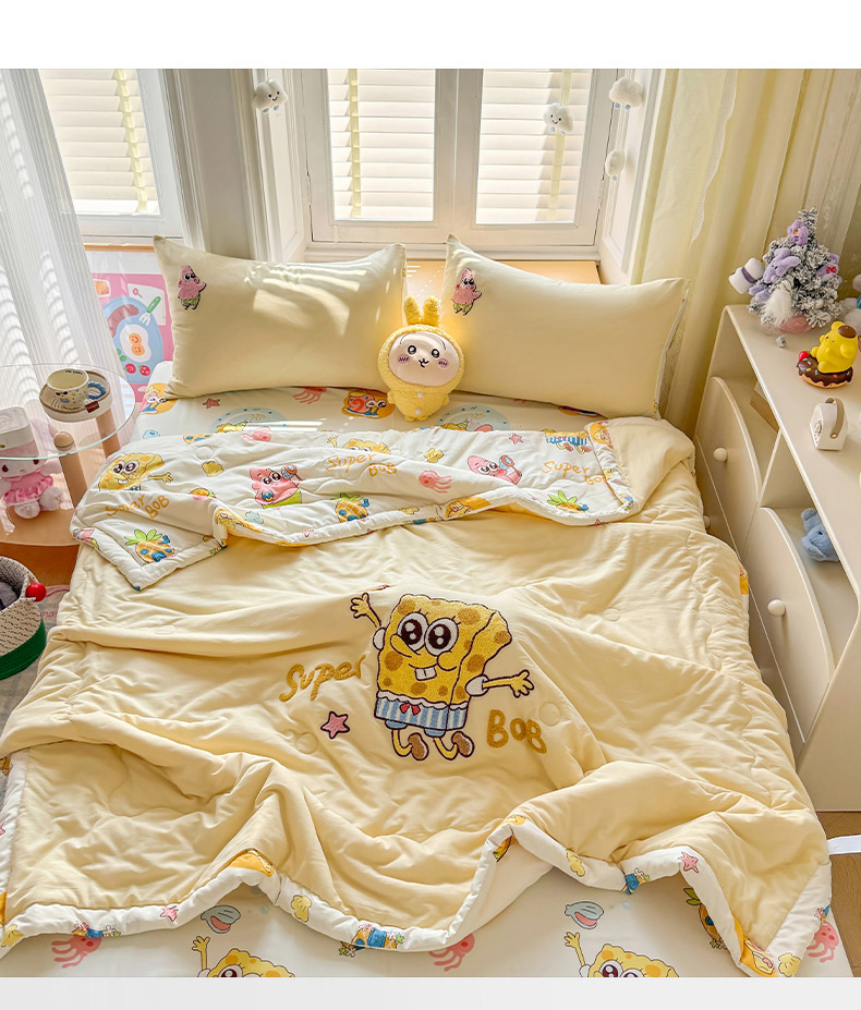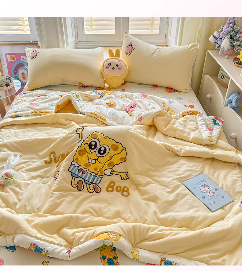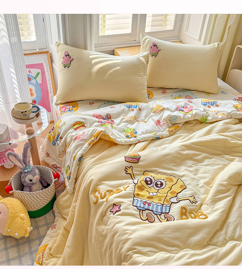 • 91家纺网 家纺一手货源 找家纺 优卡迪家纺馆 2026新款水洗棉印加绣夏被四件套下载文件包含买家秀 海绵宝宝-奶黄