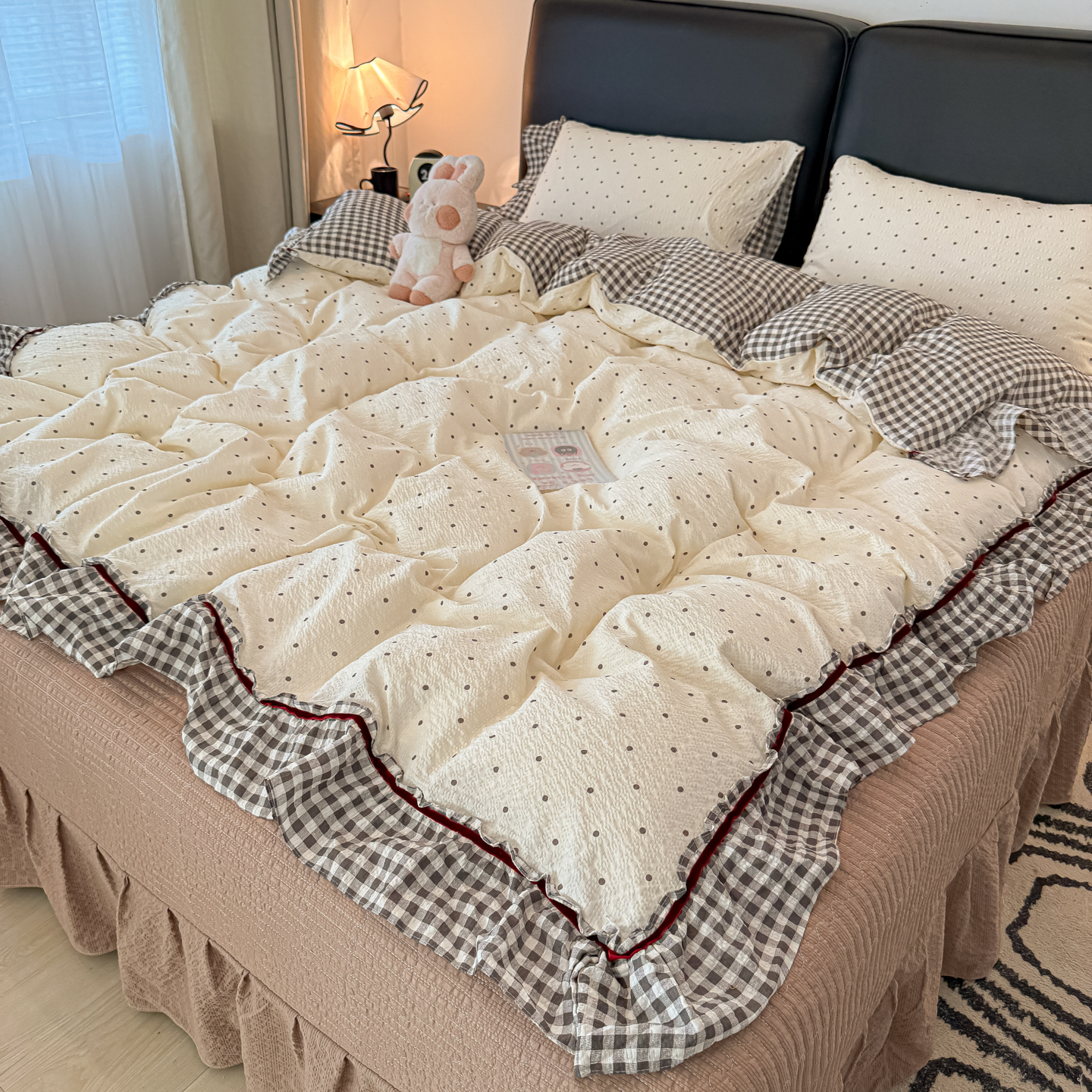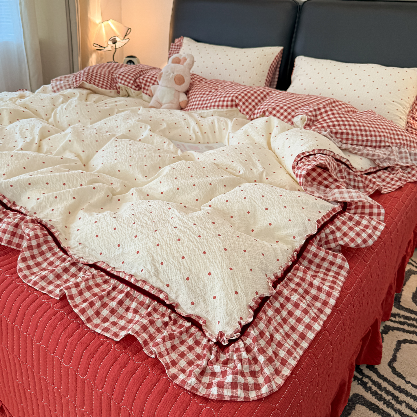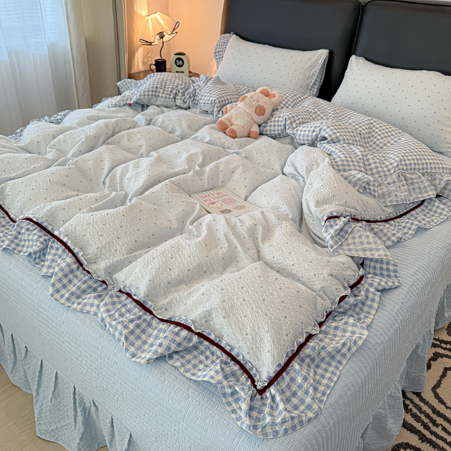(总)子钦家纺 2026春夏新款提花泡芙棉贴布绣手包边但夏被夏被四件套-丘比特的爱恋(场景二),丘比特的爱恋-海盐蓝+蓝格,丘比特的爱恋-奶粉波点+粉小格,丘比特的爱恋-奶红波点+红格,丘比特的爱恋-奶灰波点+黑小格,组合图