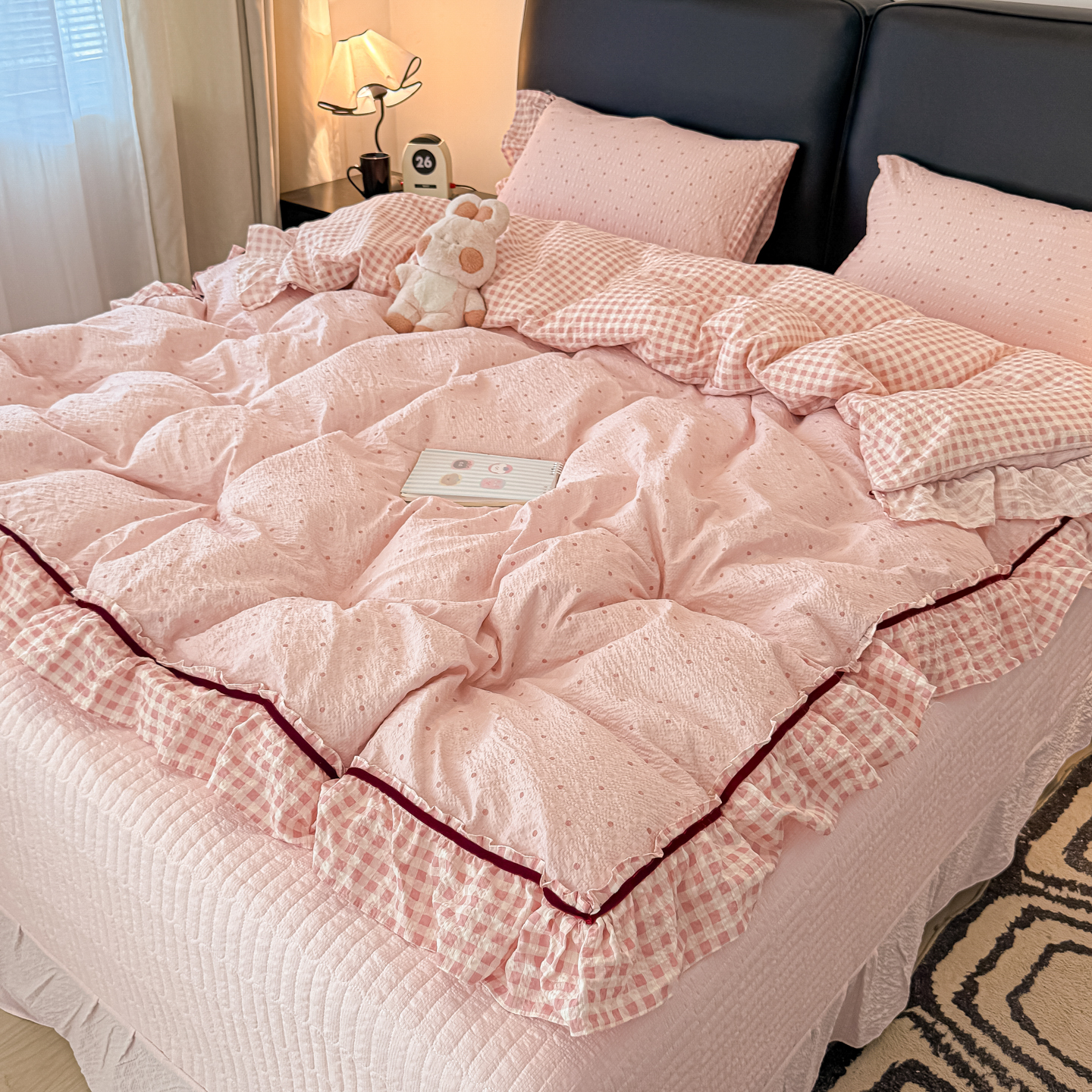 (总)子钦家纺 2026春夏新款提花泡芙棉立体双层花边简约韩系风床单床笠四件套-安妮,安妮-蓝小格,安娜-红小格,安妮-粉小格,安妮-黑小格