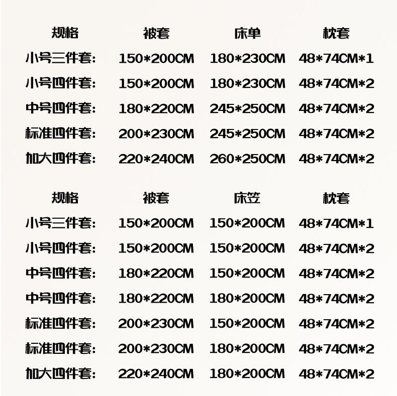 中号四件套:被套180*220床笠180*200 | ¥48.00 |