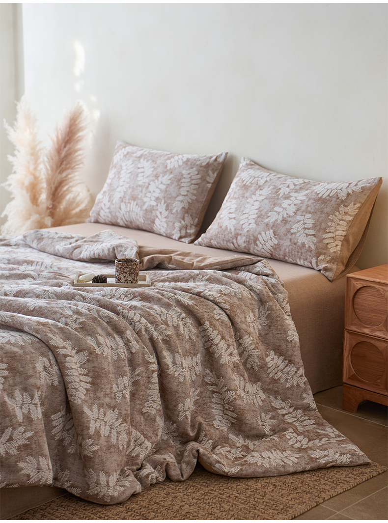 • 91家纺网 家纺一手货源 找家纺 (总)如一 2026新款60S全棉色织提花三层纱夏被四件套叶蔓系列,叶蔓咖,叶蔓蓝,叶蔓绿,叶蔓紫,组合