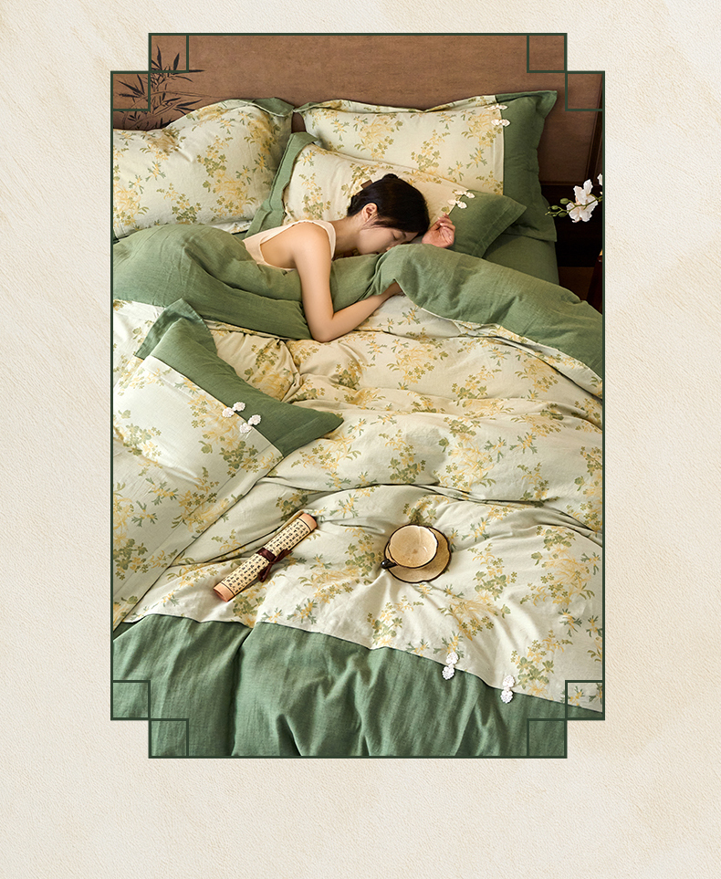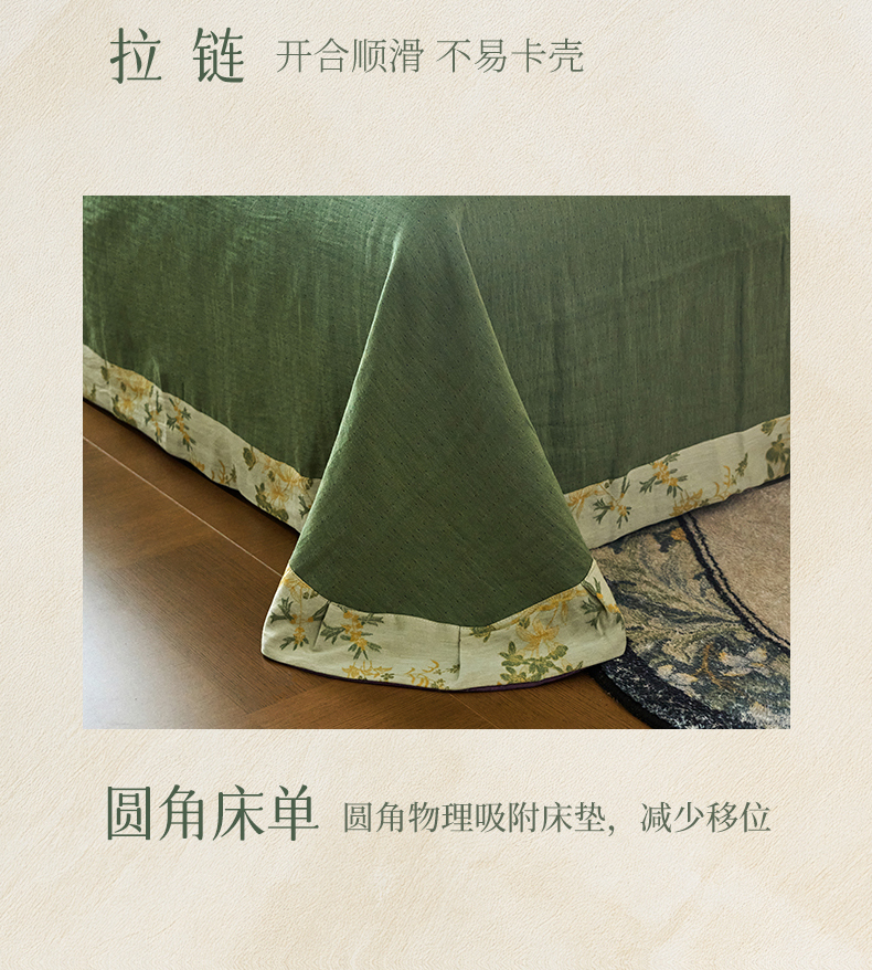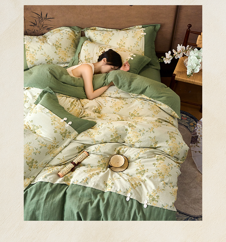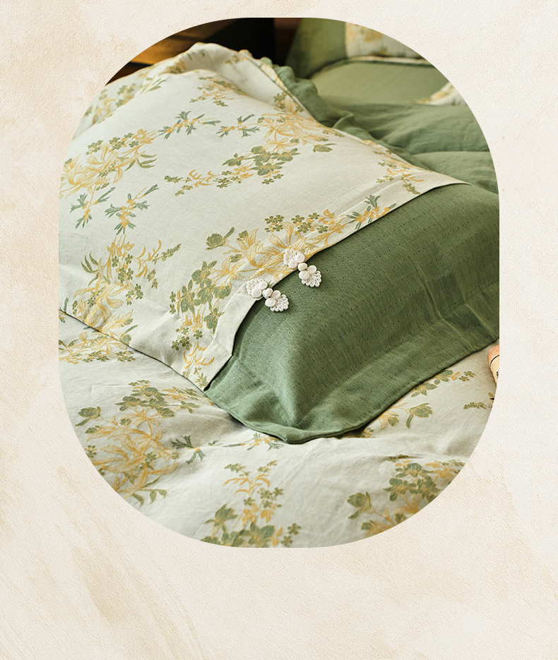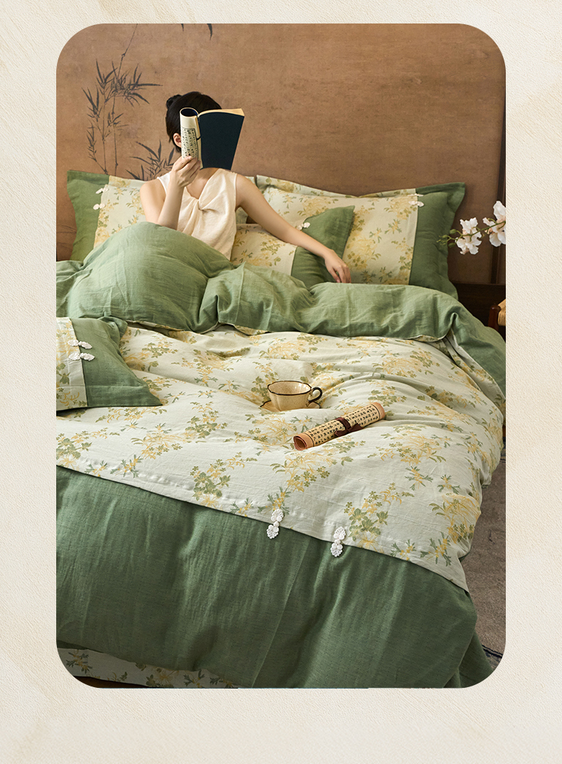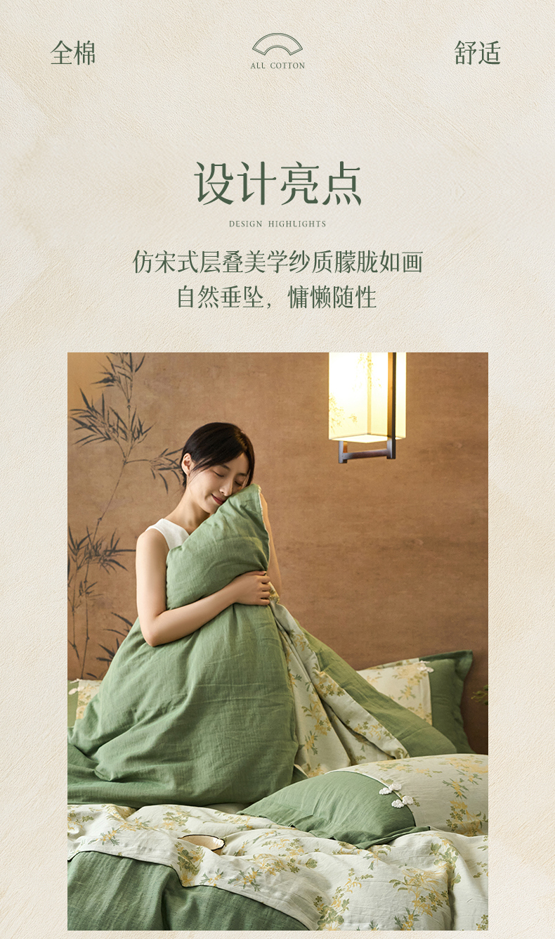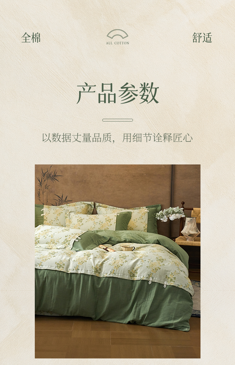 商品名称:春皖家纺 2026新款全棉提花双层纱盘扣四件套-旗袍风系列 青栀