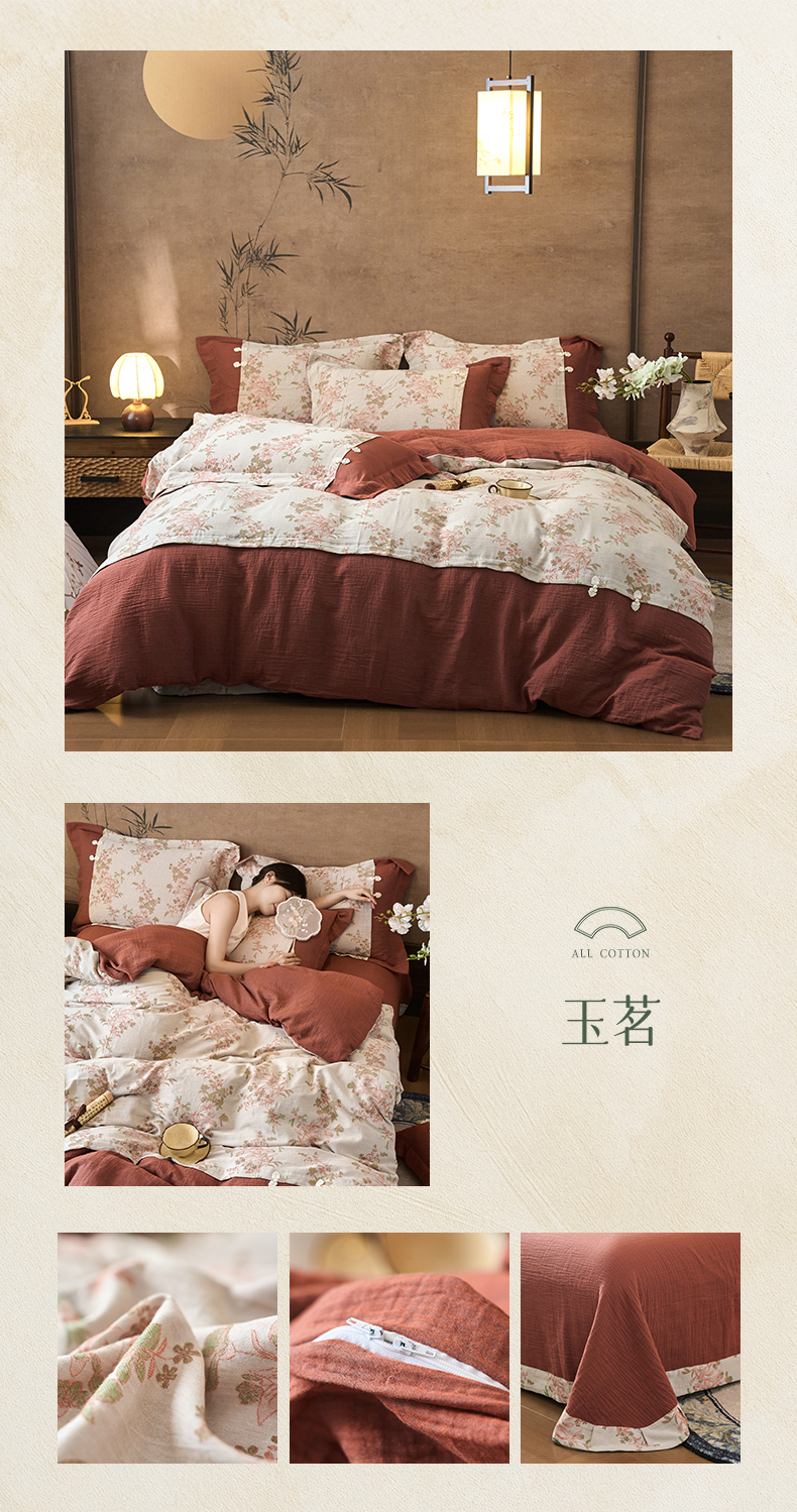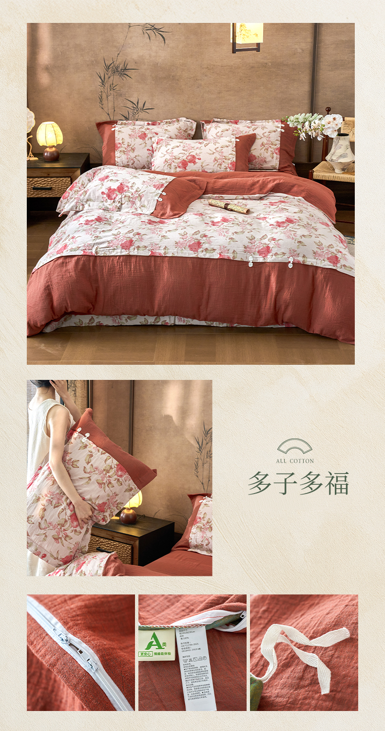 (总)春皖家纺 2026新款全棉提花双层纱盘扣四件套-旗袍风系列,多子多福,红蕊,梦里江南,南鸢,青栀,玉茗,紫气东来,组合图