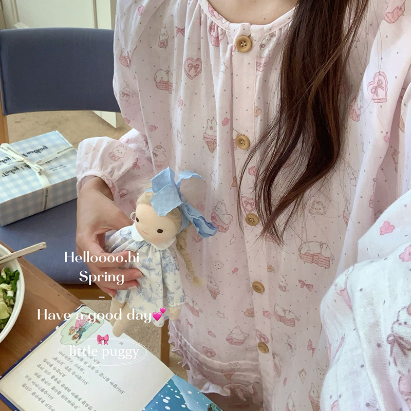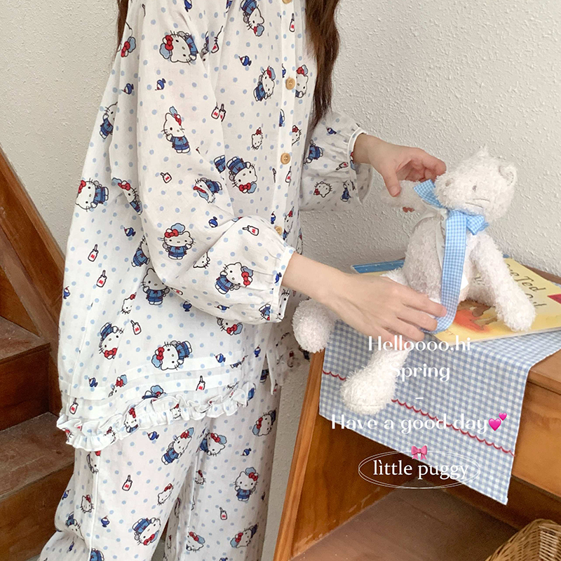 当前位置: 91家纺网 > 商品网购 > 居家日用 > 睡衣/家居服套装 > 妍景家居生活馆 2026新款木耳边纱布套装 蓝色波点小猫