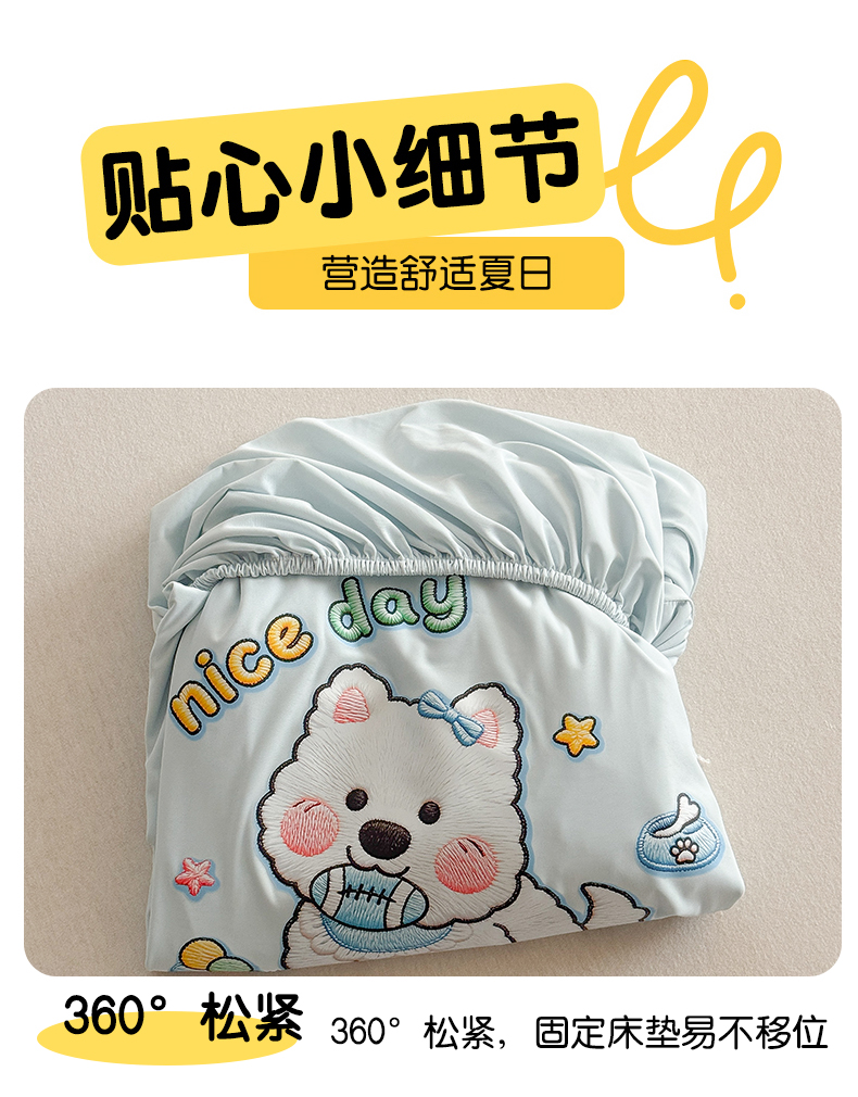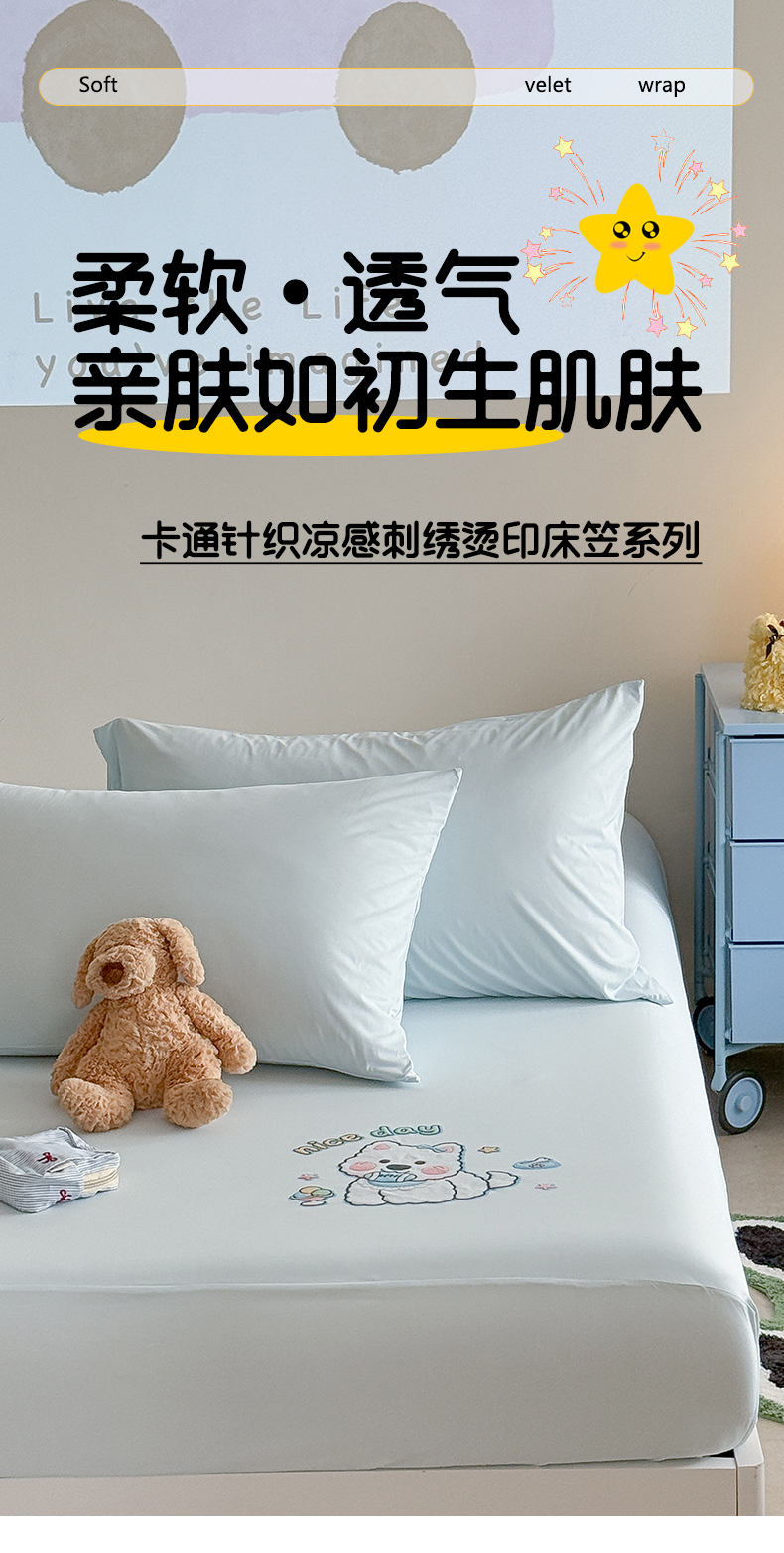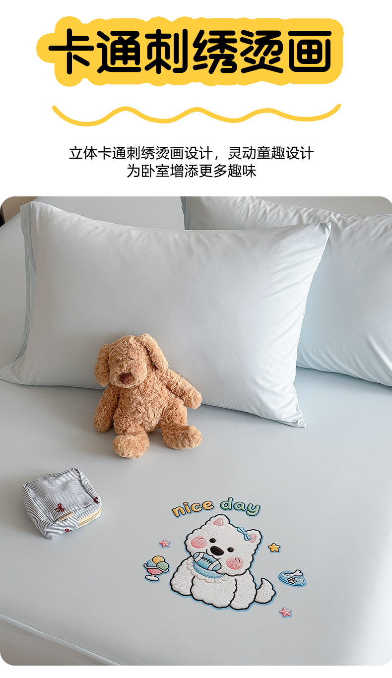 • 91家纺网 家纺一手货源 找家纺 TT.one 塔塔家居 2026新款A类卡通针织凉感刺绣烫印床笠 米多多-海盐蓝