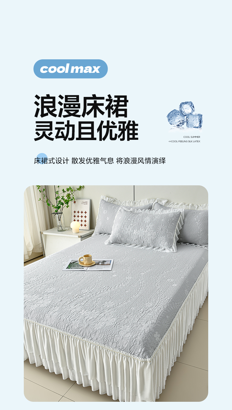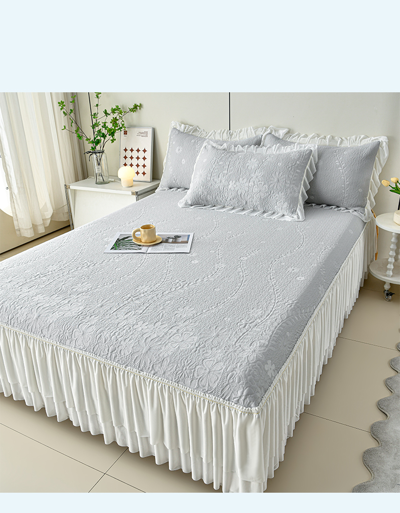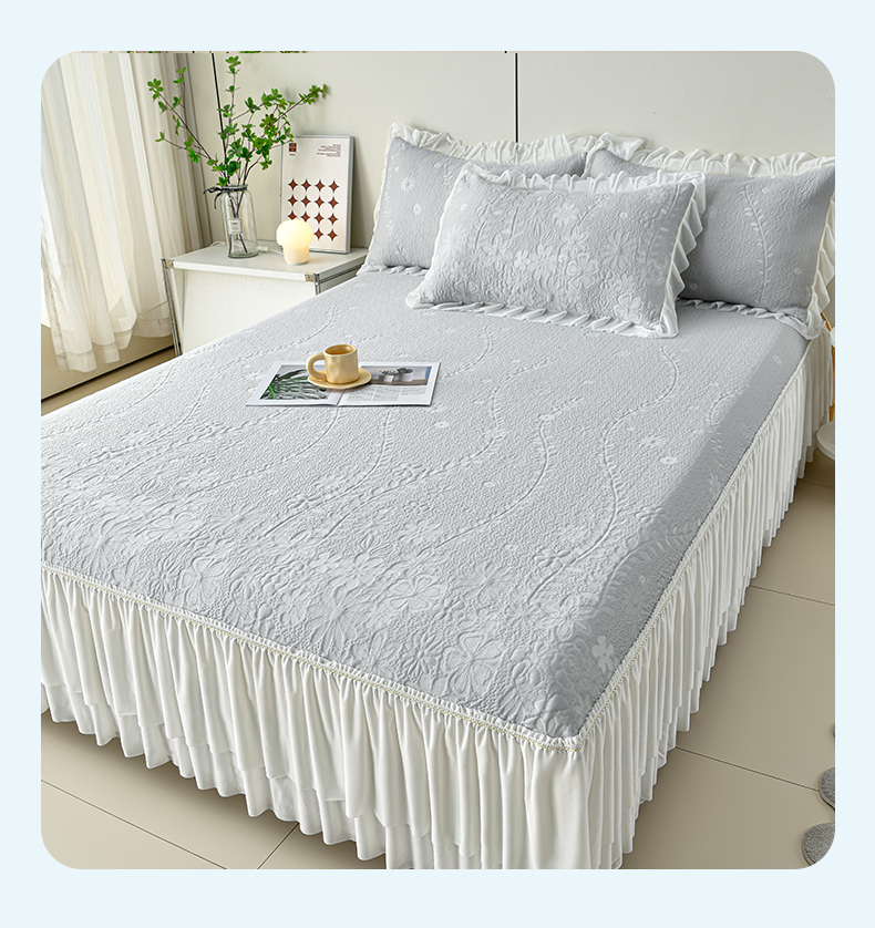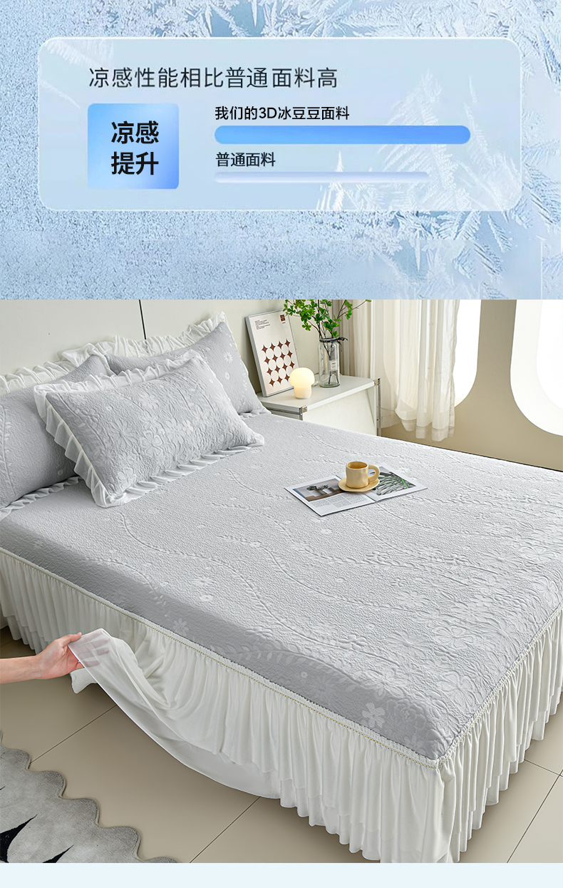 (总)畅畅家纺 2026新款锦氨夏被PE凉感豆豆凉席绣花三明治复合床裙三件套四件套,格韵-粉-床裙款,格韵-灰-床裙款,格韵-蓝-床裙款,格韵-绿-床裙款