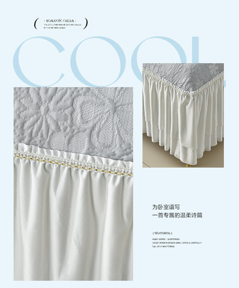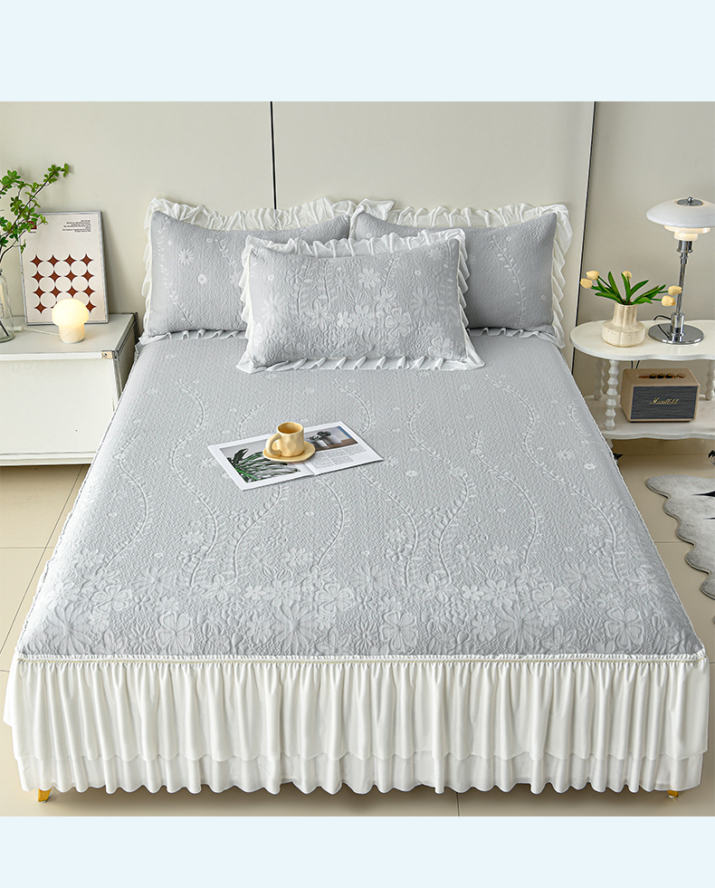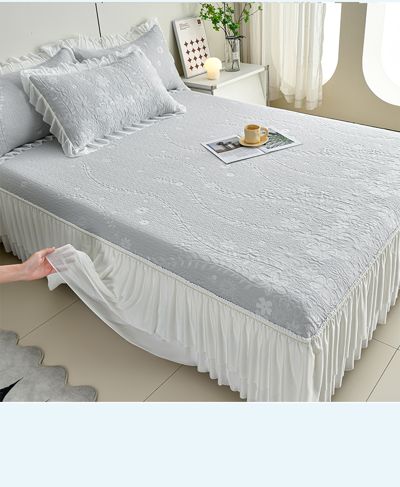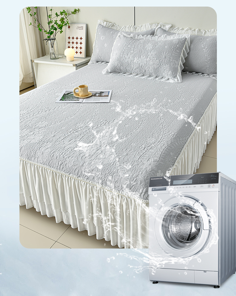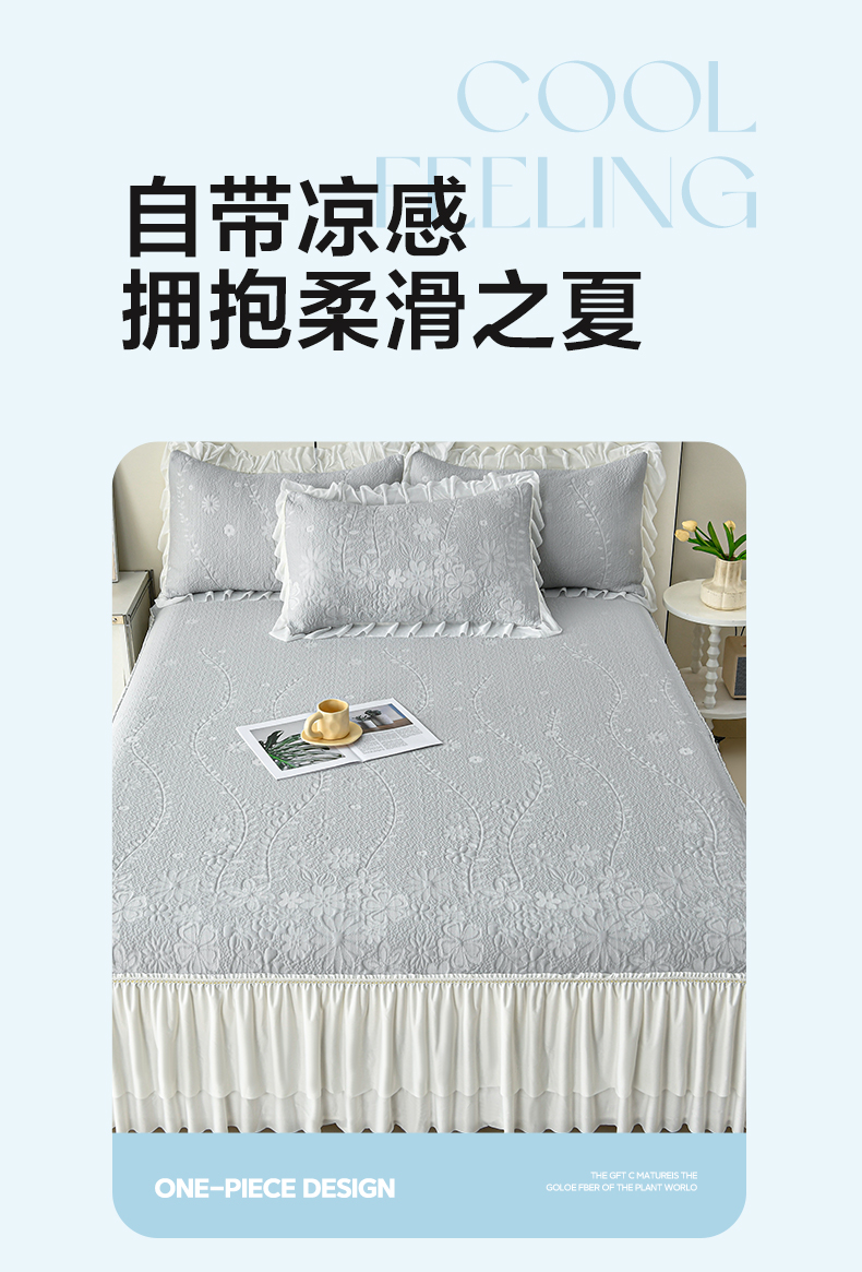 (总)畅畅家纺 2026新款锦氨夏被PE凉感豆豆凉席绣花三明治复合床裙三件套四件套,格韵-粉-床裙款,格韵-灰-床裙款,格韵-蓝-床裙款,格韵-绿-床裙款