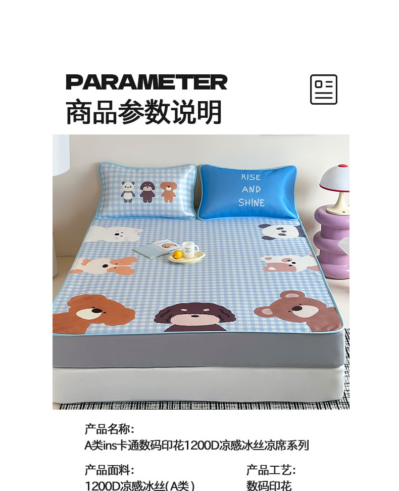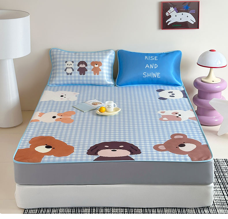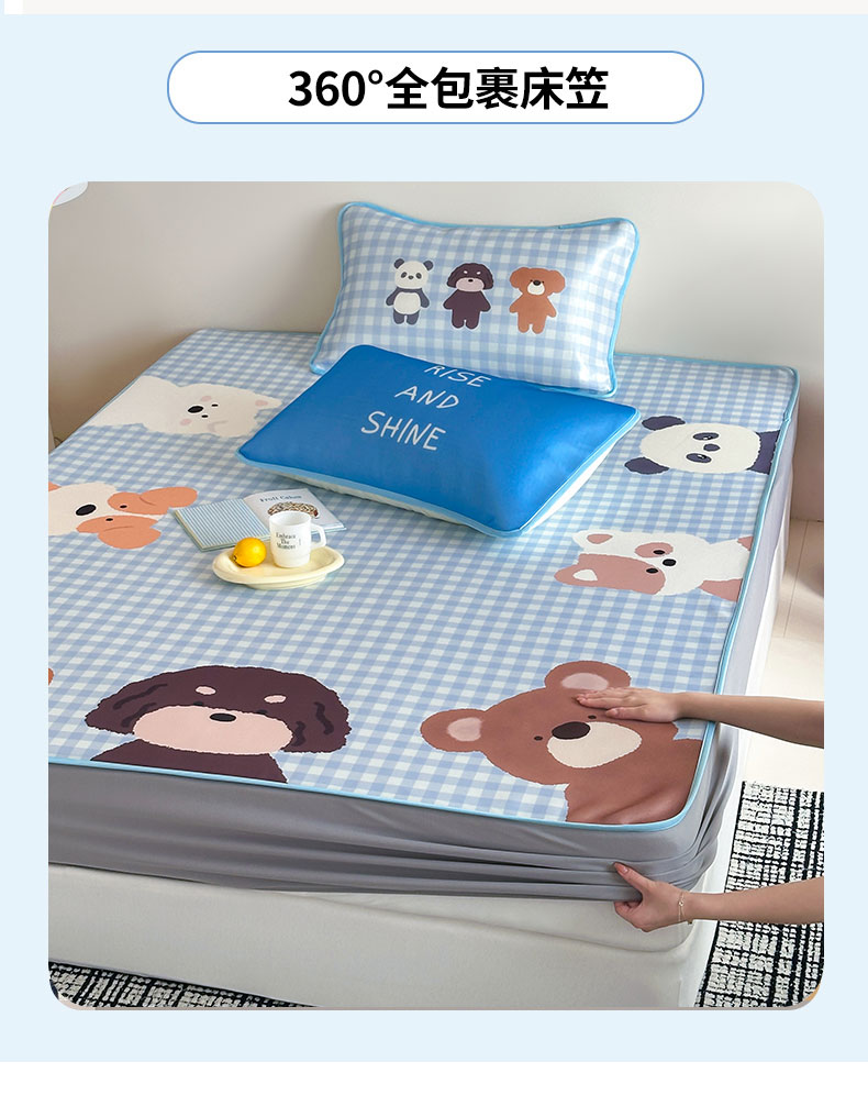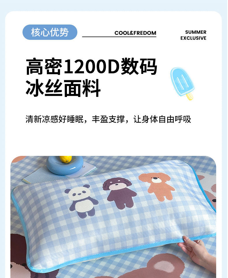 • 91家纺网 家纺一手货源 找家纺 桃子家居 2026新款A类ins博主卡通数码印花高级品质撞色中分子1200D冰感丝凉感席冰丝三件套平铺床笠系列 冰感席混搭-夏日派对